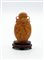 Vasetto in corno color ambra scolpito con figura orientale ed un albero sul recto e ideogramma al verso. Cina, dinastia Qing (1644-1911) fine secolo XIX. Montato su base in legno (h. cm max 9) (difetti, rotture e mancanze)