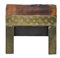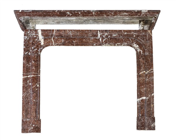 Camino in marmo rosso con montanti a doppia scanalatura, fondo in rame borchiato (l cm 140). (difetti e restauri)