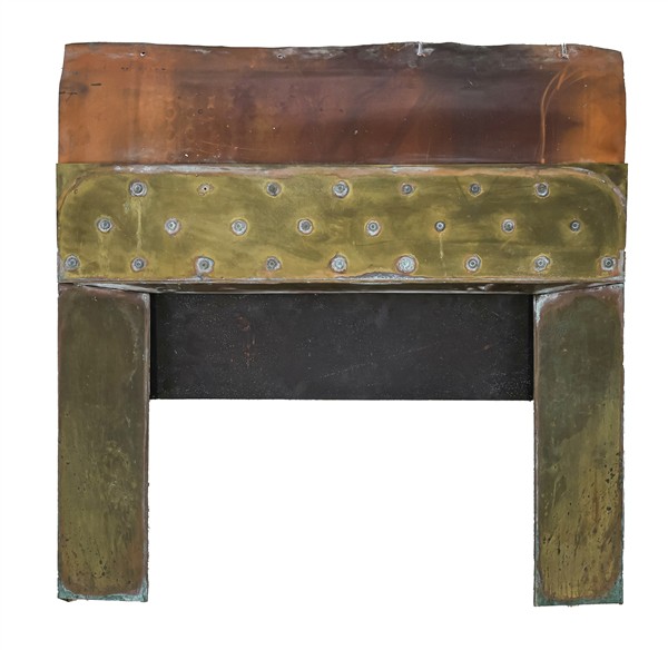 Camino in marmo rosso con bordure modanate e scanalate, fondo in rame e rame ottonato con fascia borchiata (L cm 140) (difetti e rotture)
