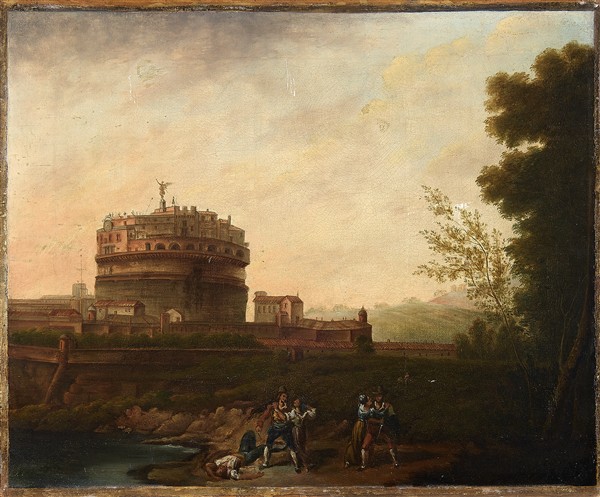 "Veduta di Castel Sant'Angelo a Roma con scena di briganti"