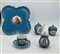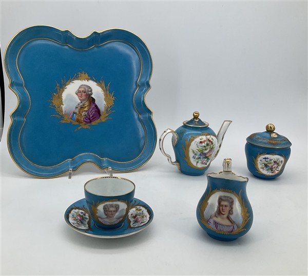 Manifattura francese secolo XIX. Servizio da tè "solitaire" in porcellana dipinta in policromia con ritratti reali e fiori entro riserve su fondo azzurro con profili in oro composto da teiera, lattiera, zuccheriera, tazza con piatto e vassoio quadrilobato (vassoio cm 31x30) (lievi difetti)