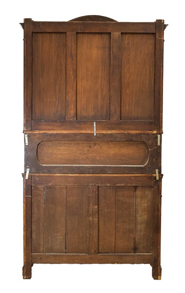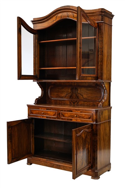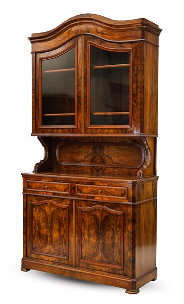 Credenza con vetrina a due corpi impiallacciata in noce e radica di noce, parte inferiore a due sportelli e due cassetti, parte superiore a due sportelli sagomati con vetro su sostegni mossi. Inizio secolo XX (cm 134x250x48) (difetti)