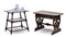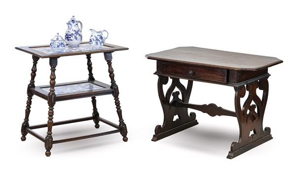 Lotto composto da un tavolino in legno tornito con doppio ripiano in porcellana decorata in blu al fiore di cipolla (cm 71x74x51) con caffettiera, lattiera e zuccheriera di stesso decoro Villeroy & Boch unito a un tavolino con piano ottagonale e gambe sagomate (cm 97x66x63) (difetti e restauri)