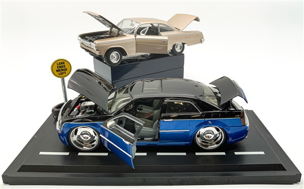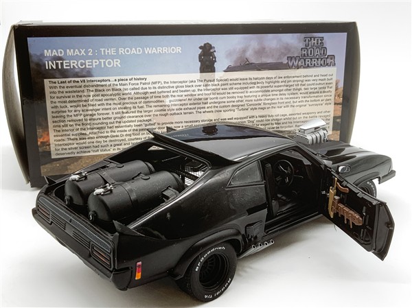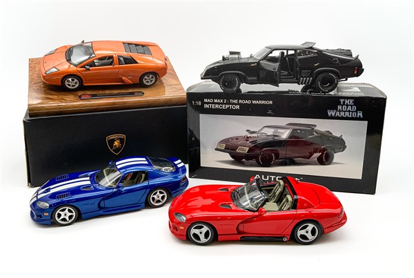 Lotto di otto modellini di differenti automobili, fra cui V8 Interceptor, l’iconica auto del film “Mad Max 2: The road Warrior”, produzione AUTOart (in scatola originale) e Lamborghini Muciélago, produzione Burago (in scatola originale)
