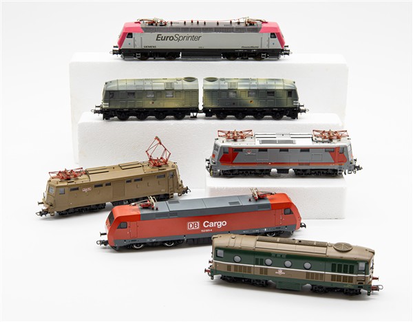 Lotto composto da locomotiva militare Leopold, locomotiva elettrica FS 424.348, locomotiva elettrica FS Breda 424.009, locomotiva diesel FS Breda 341.2024, locomotiva elettrica Arnold BR 127.001-6 Siemens EuroSprinter, locomotiva elettrica BR 152.001-4 DB Cargo (difetti e segni d'uso)