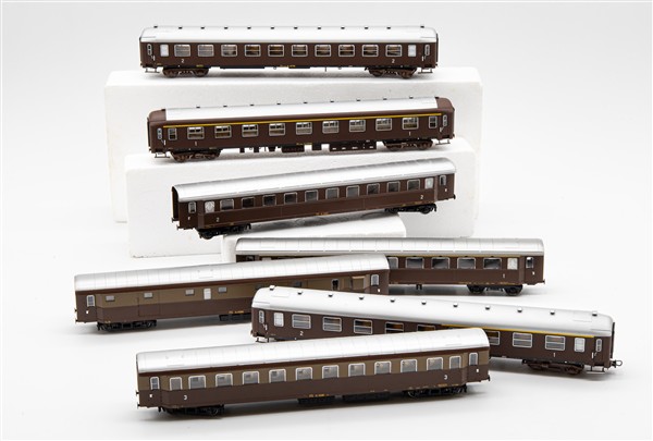 Lotto di sei carrozze passeggeri FS 1*, 2° e 3° classe e una carrozza bagagliaio, livrea castano e castano Isabella (lievi difetti e segni d'uso)