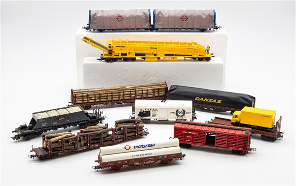 Due cartoni contenenti numerosi vagoni merci assortiti di marche differenti (di