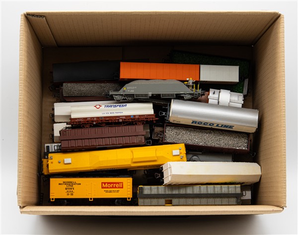 Due cartoni contenenti numerosi vagoni merci assortiti di marche differenti (difetti, mancanze e segni d'uso)