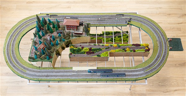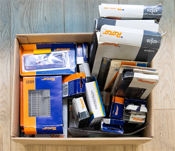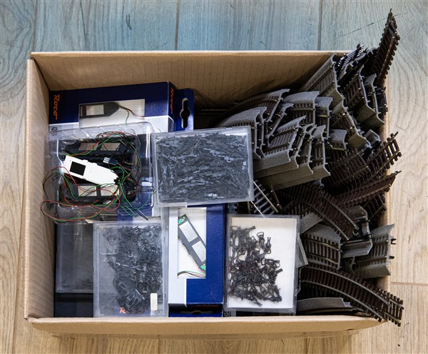 Lotto composto da tre cartoni contenenti convogli ferroviari e carri assortiti di marche differenti, alcuni accessori e ricambi, e porzioni di plastico ferroviario (difetti, mancanze e segni d'uso)