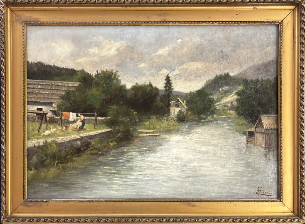 Giuseppe Pecenco, Trieste 1854 - 1937, La stesura dei panni Olio su tela cm 63x91 firmato in basso a sx