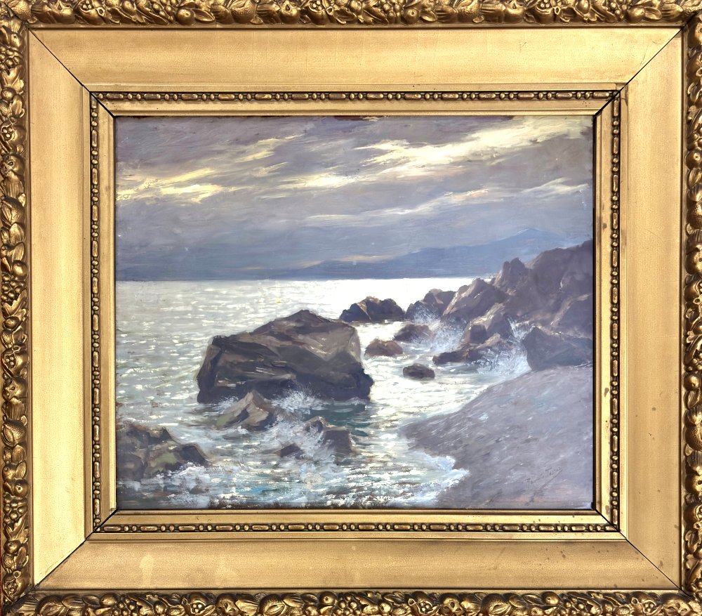 Romolo Tessari, Castelfranco Veneto (Ve) 1868 - 1925 Mira (Ve), Marina Olio su cartoncino cm 43x52 firmato in basso a sx