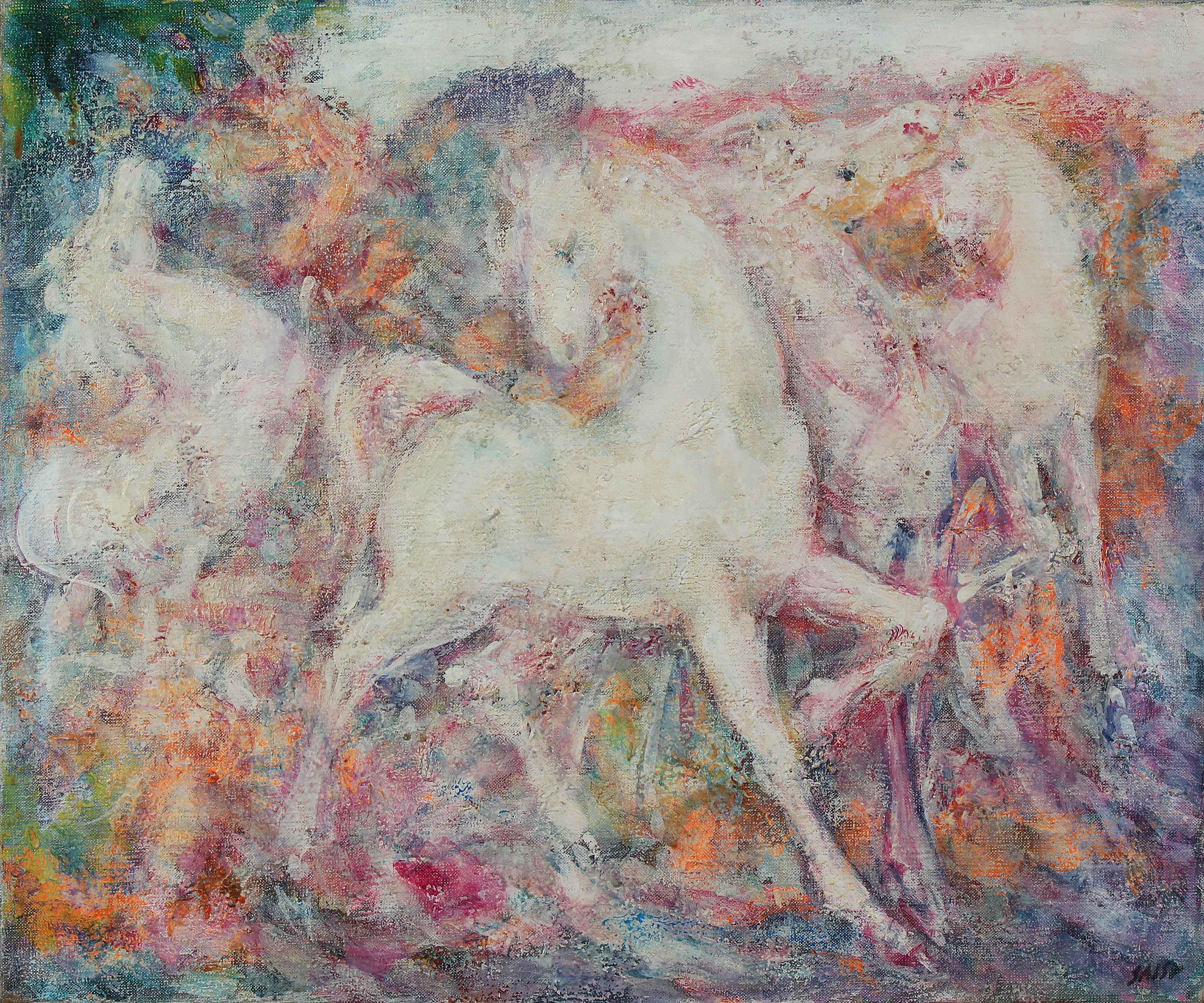 SASSU ALIGI (1912 - 2000) Bianchi destrieri. 1976. Olio su tela . Cm 46,00 x 55,00. Firma in basso a destra. Al retro firma, titolo e anno. Autentica su fotografia a cura della Galleria d'Arte La Cornice, Parma. Autentica su fotografia, con relativo numero d'archivio, a cura di Brerarte, Milano. Pubblicazioni: Catalogo Generale della Pittura - Aligi Sassu, pag. 150, tavola 1.