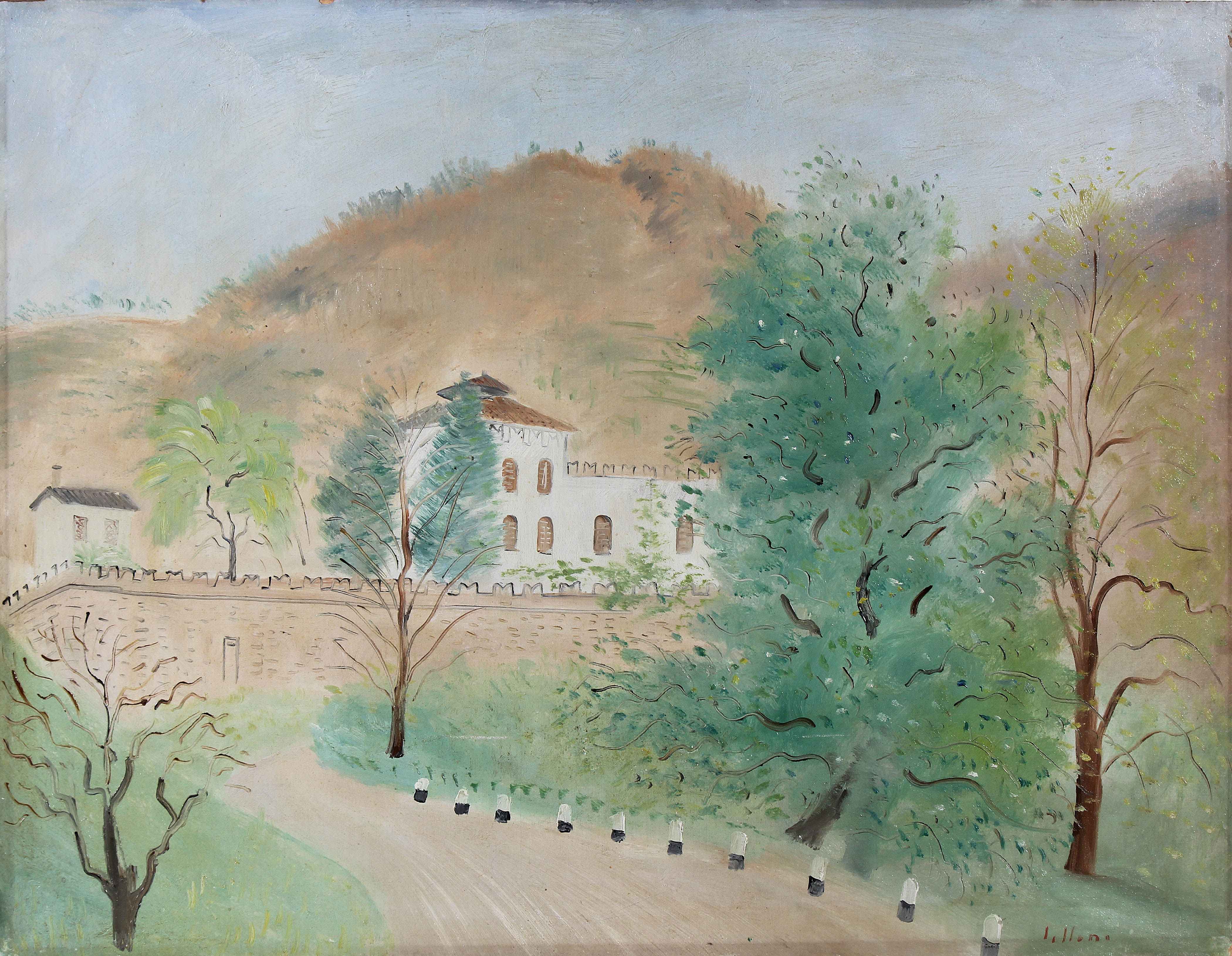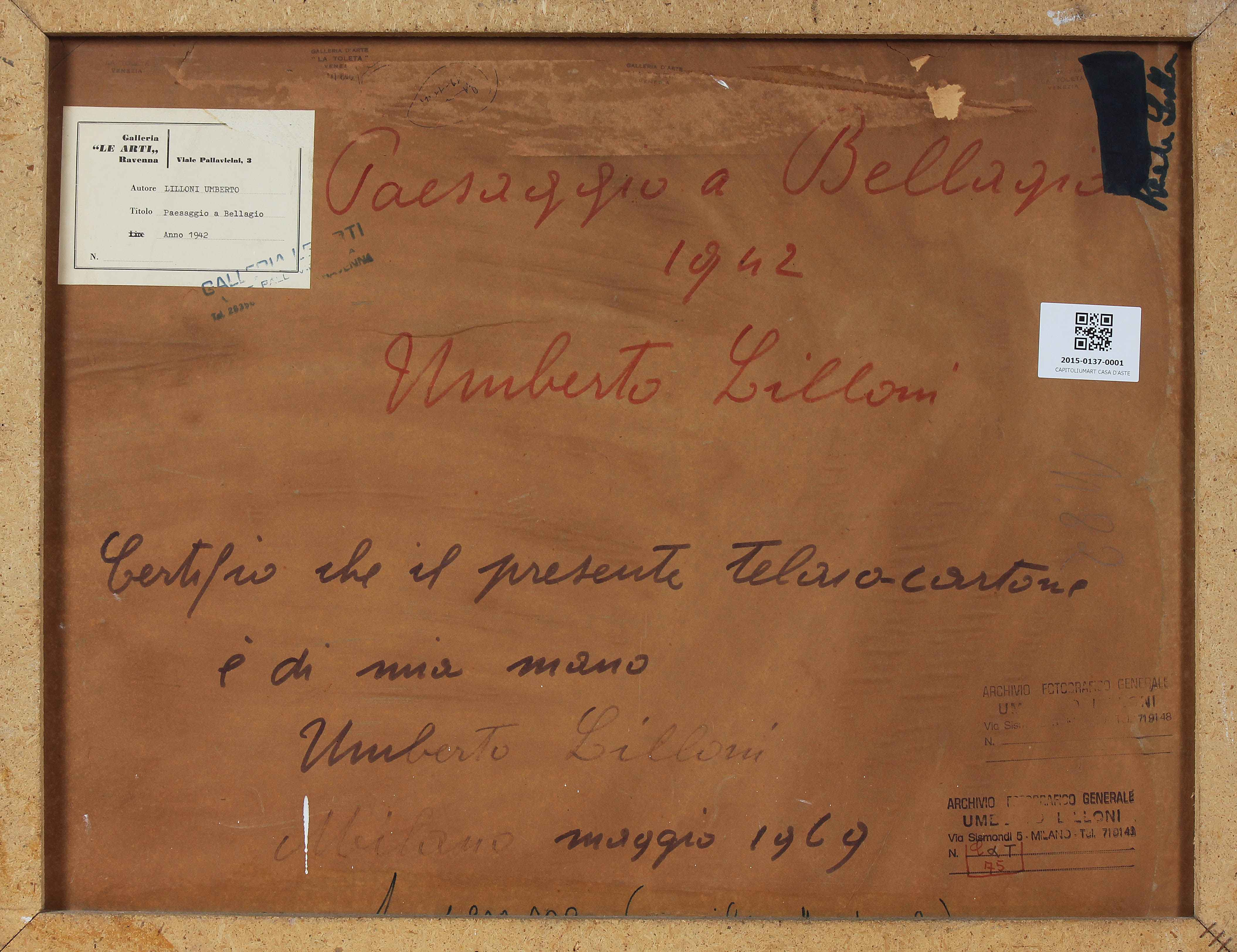 LILLONI UMBERTO (1898 - 1980) Paesaggio a Bellagio. 1942. Olio su cartone pressato. Cm 65,00 x 50,00. Firma in basso a destra. Al retro titolo, firma per autentica, anno e cartiglio descrittivo a cura della Galleria Le Arti, Ravenna. Timbro dell'Archivio Fotografico Generale Umberto Lilloni, Milano. Pubblicazioni: Catalogo Ragionato dei dipinti e dei disegni - Umberto Lilloni, tomo secondo, pag. 439, tavola 416 con misure errate. . Cornice presente