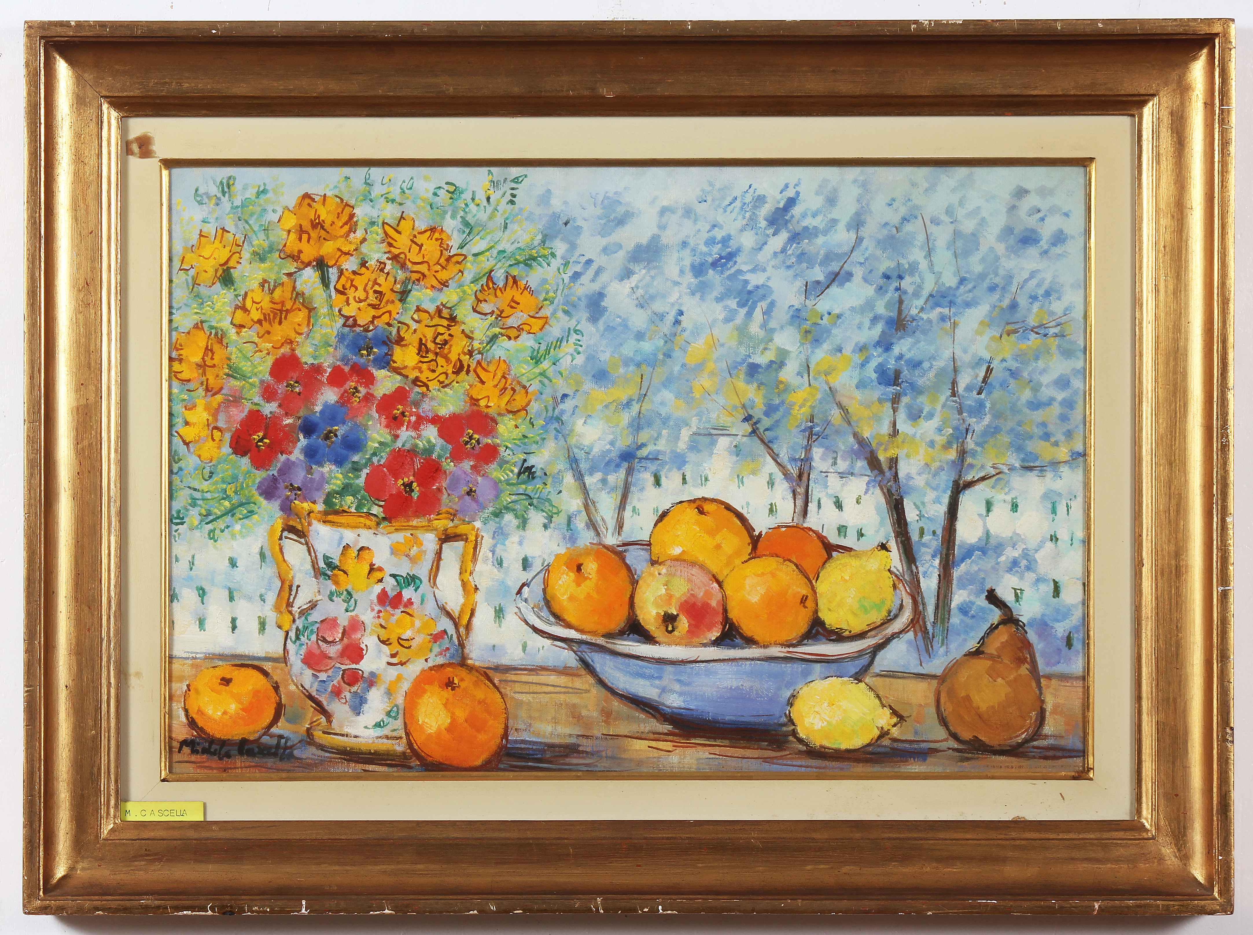 CASCELLA MICHELE (1892 - 1989) Natura morta. Olio su tela . Cm 60,00 x 40,00. Firma in basso a sinistra. Al retro certificato di garanzia e timbro a cura della Galleria Ars Artis, Padova; cartiglio descrittivo a cura della Galleria Nuovo Sagittario, Milano. Autentica dell'artista su fotografia con lettera accompagnatoria della Torcular Edizioni D'Arte, Milano. Cornice presente