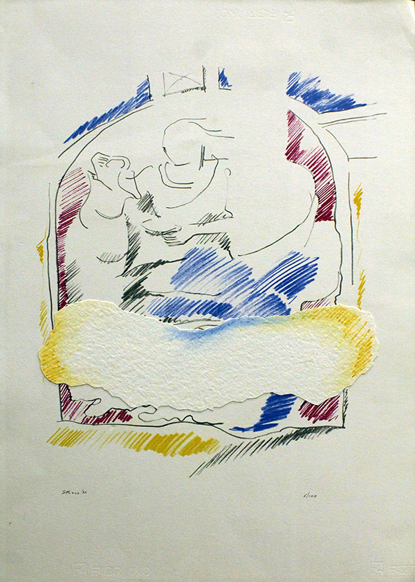 S. RIZZO, 1983, litografia su cartoncino con inserto, cm 70x50, esemplare 6/100. Al fronte: esemplare in basso a sinistra e firma in basso a destra. Opera senza cornice. Opera con certificato di provenienza della Daliano Ribani Arte. Opera con leggera fioritura.