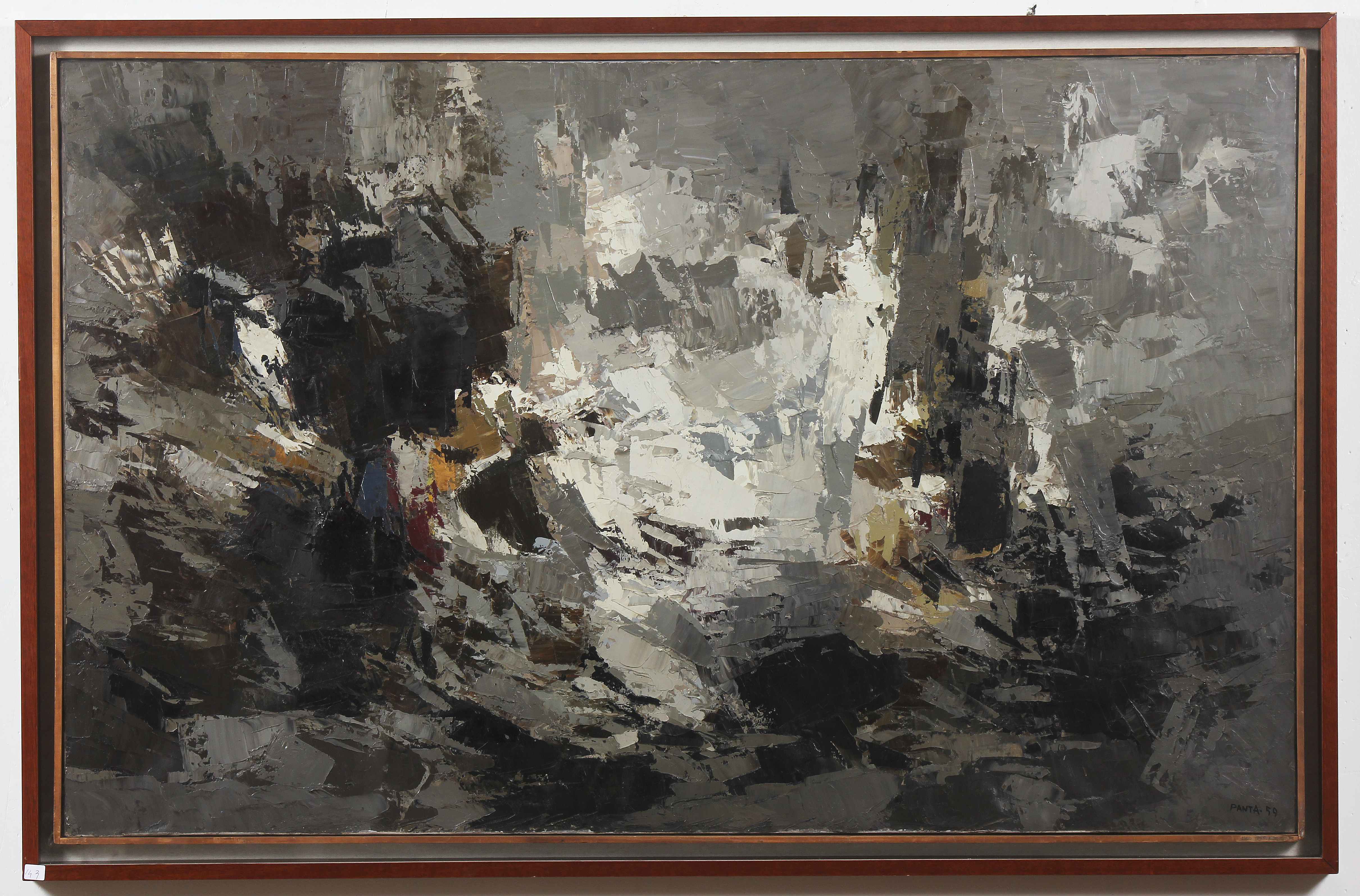 PANTALEONI IDEO (1904 - 1993) Senza titolo. 1959. Tecnica mista su tela. Cm 116,00 x 73,00. Firma e anno in basso a destra e al retro. Opera archiviata presso l'Archivio Delle Opere dell'artista a cura di Luigi Cavadini, Uesse Arte, Como, come da documentazione fotografica allegata all'opera riportante il relativo numero d'inventario. . Cornice presente