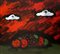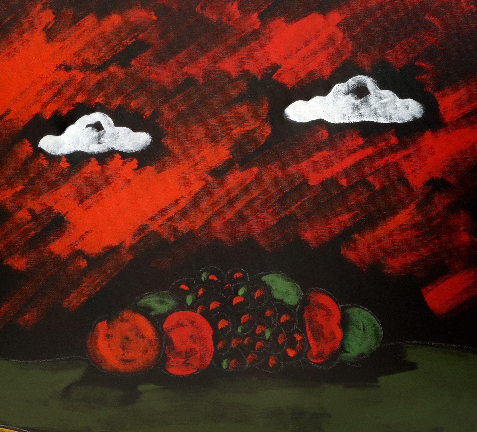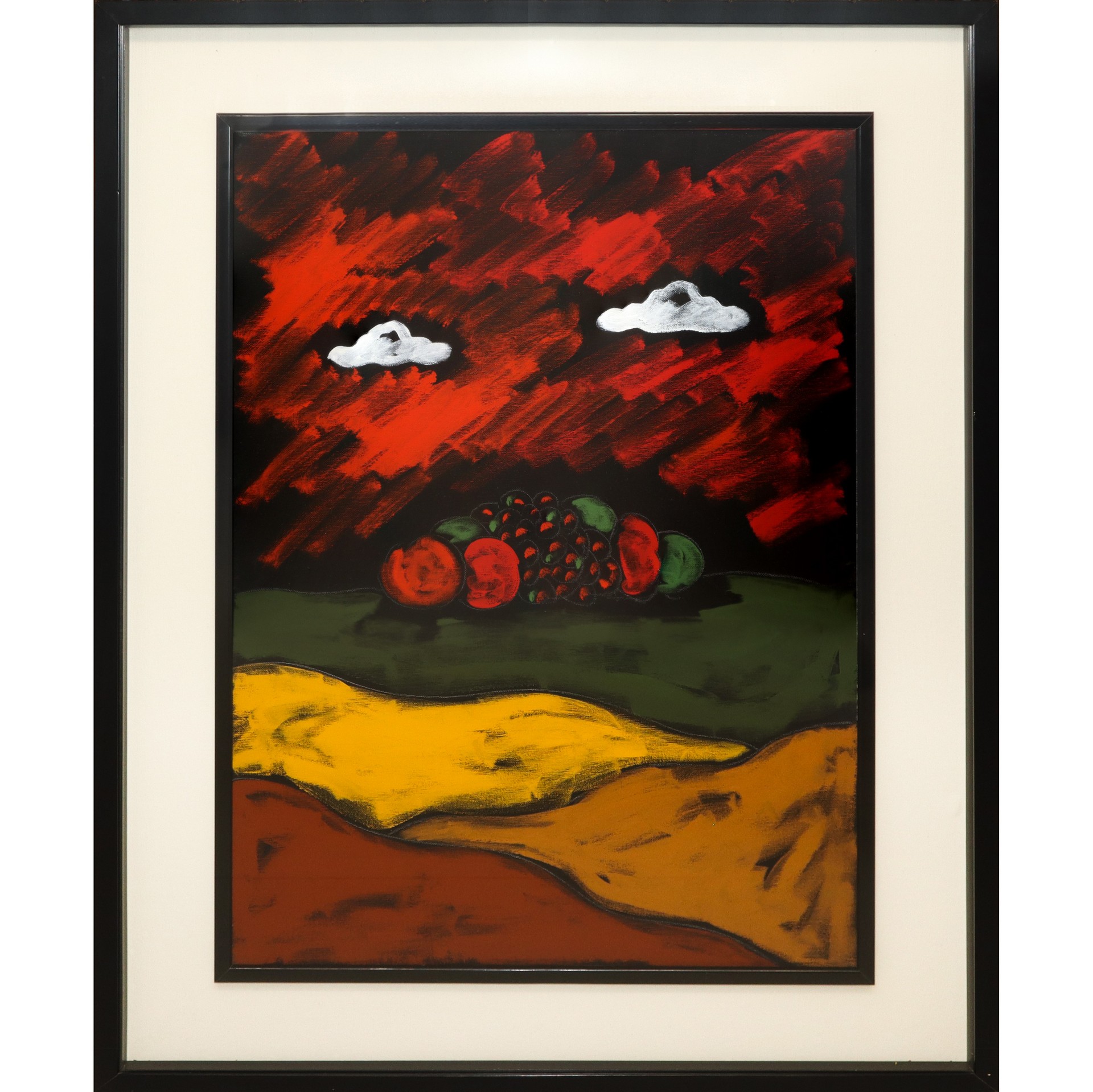 Tano Festa (1938-1988) è stato tra i maggiori protagonisti della cosiddetta Scuola di Piazza del Popolo. Come molti artisti della “pop italiana”, mosse i primi passi partendo dalla tarda esperienza informale per giungere presto a formulazioni di pittura oggettuale e, quindi, ad una produzione di immagini sintetiche e citazionistiche. Nel nostro dipinto, un composta ma drammatica composizione, le caratteristiche nuvole di Festa spiccano in contrapposizione col fondo cupo e vespertino contribuendo, così, ad intensificare i contrasti tra le forti quanto sature campiture dell’ambiente.
