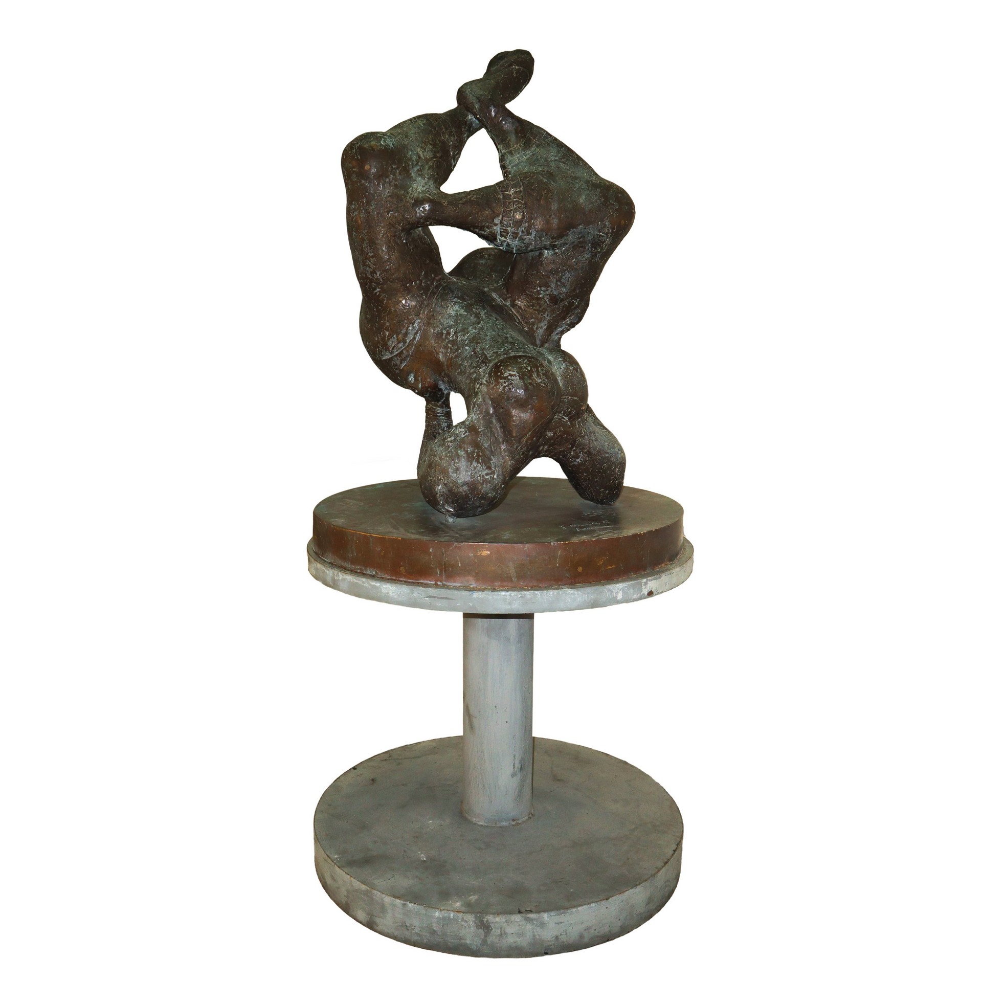 Luciano Minguzzi (Bologna 1911 - Milano 2004) - L'ultimo "op-là", 20° secolo h cm 107X77X60 piedistallo h cm 70X80 Scultura in bronzo. Firma dell’artista sul braccio sinistro della scultura. Titolo ed iscrizione “Luciano mio – Luca” incise sulla base. La scultura poggia su di un piedistallo circolare in metallo.