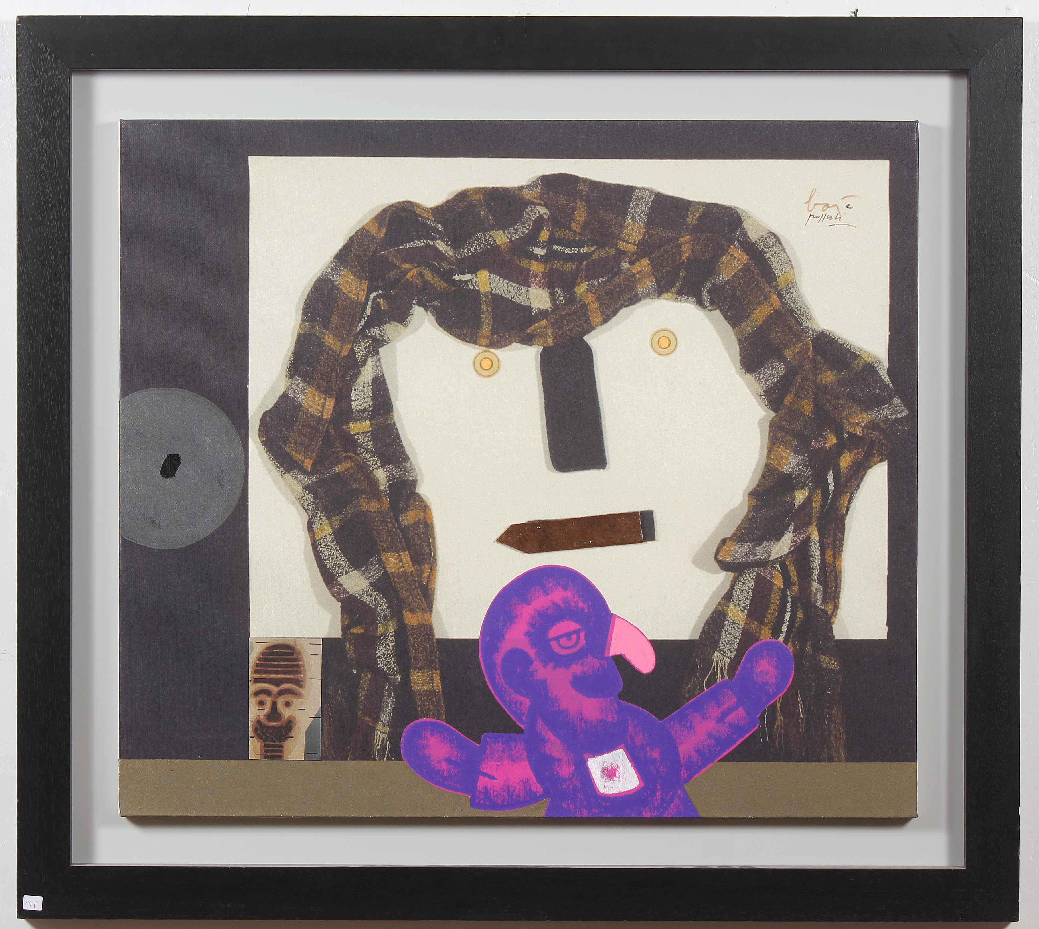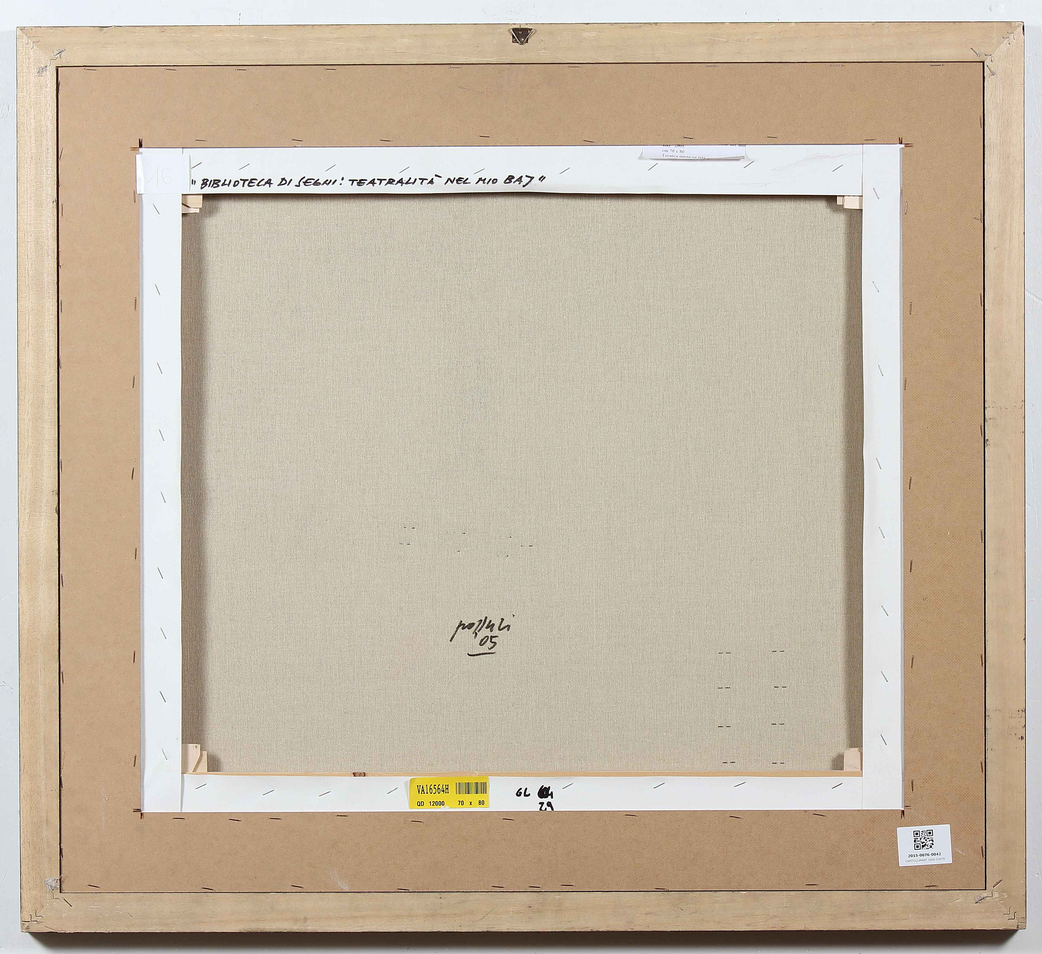 POZZATI CONCETTO (n. 1935) Biblioteca di segni: teatralità nel mio Baj. 2005. Tecnica mista su tela. Cm 80,00 x 70,00. Firma in alto a destra. Al retro titolo, firma e anno. Opera archiviata presso l'Archivio Generale Concetto Pozzati, Cesena (Fc), come da documentazione fotografica allegata all'opera, riportante il relativo numero d'inventario. Cornice presente