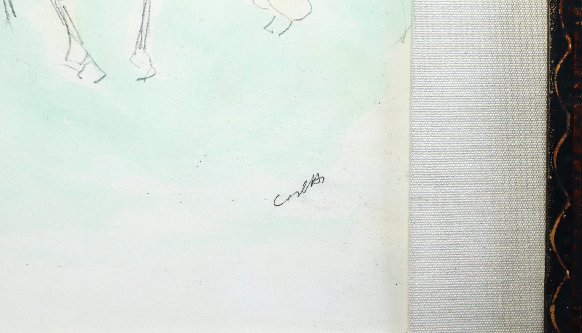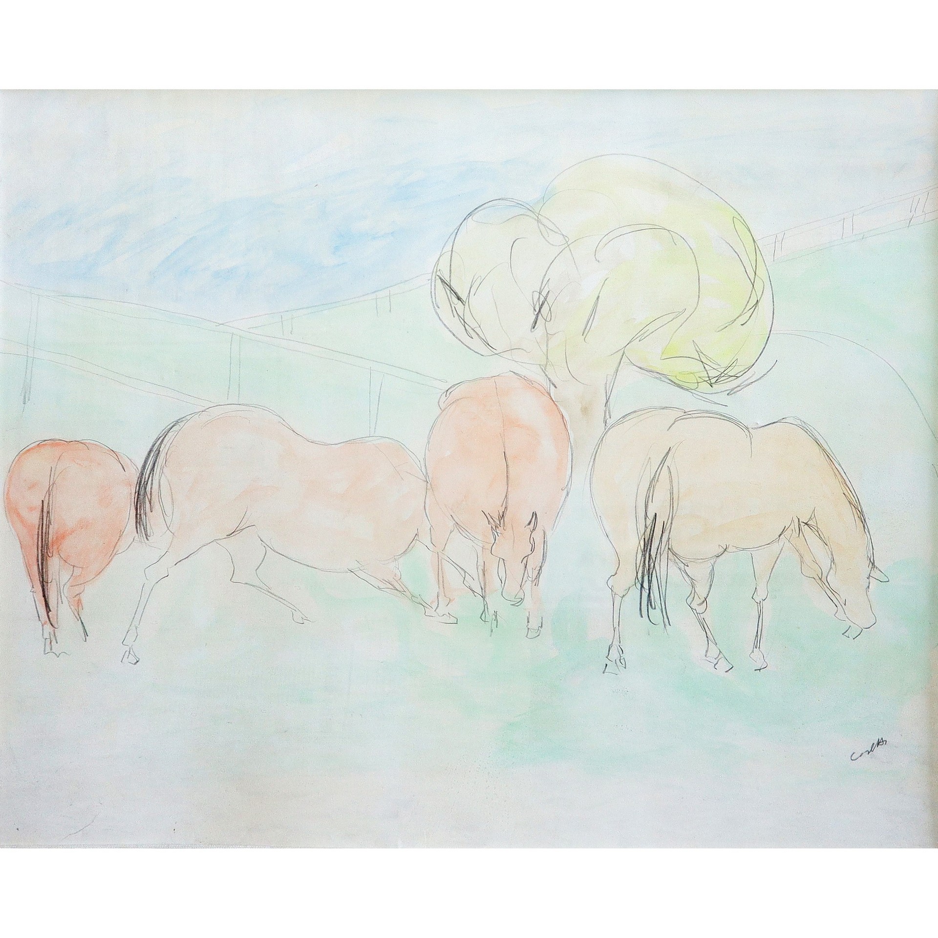 Giuseppe Cesetti (Tuscania 1902 - Tuscania 1990) - Cavalli al pascolo. h cm 50X60 in cornice h cm 74X84 Tecnica mista su cartone