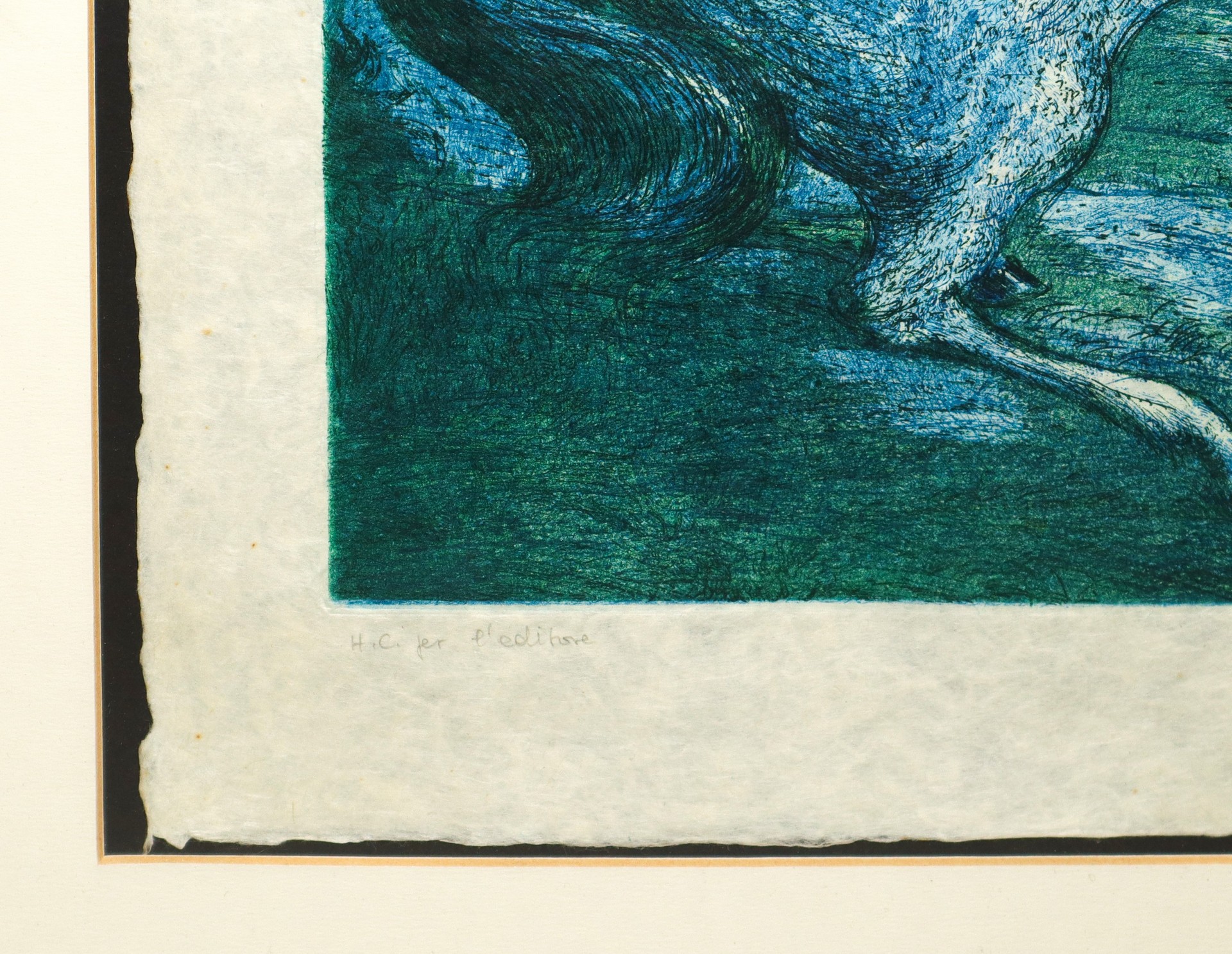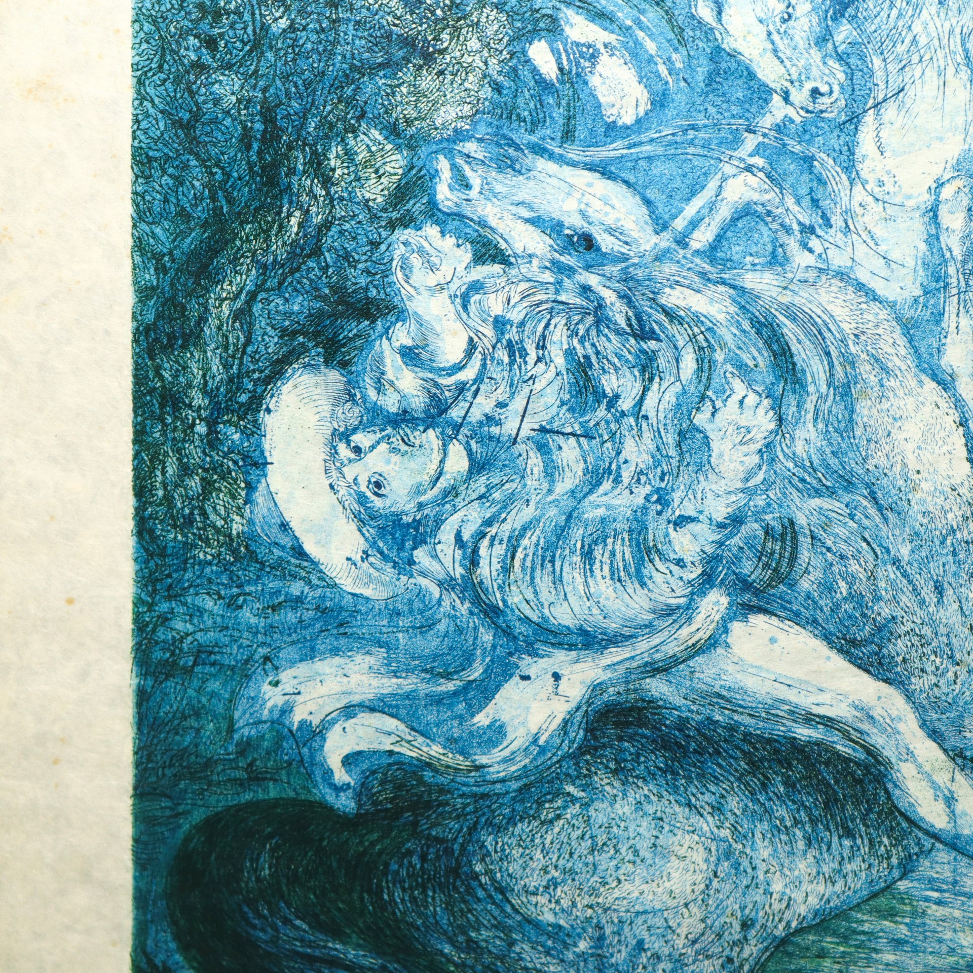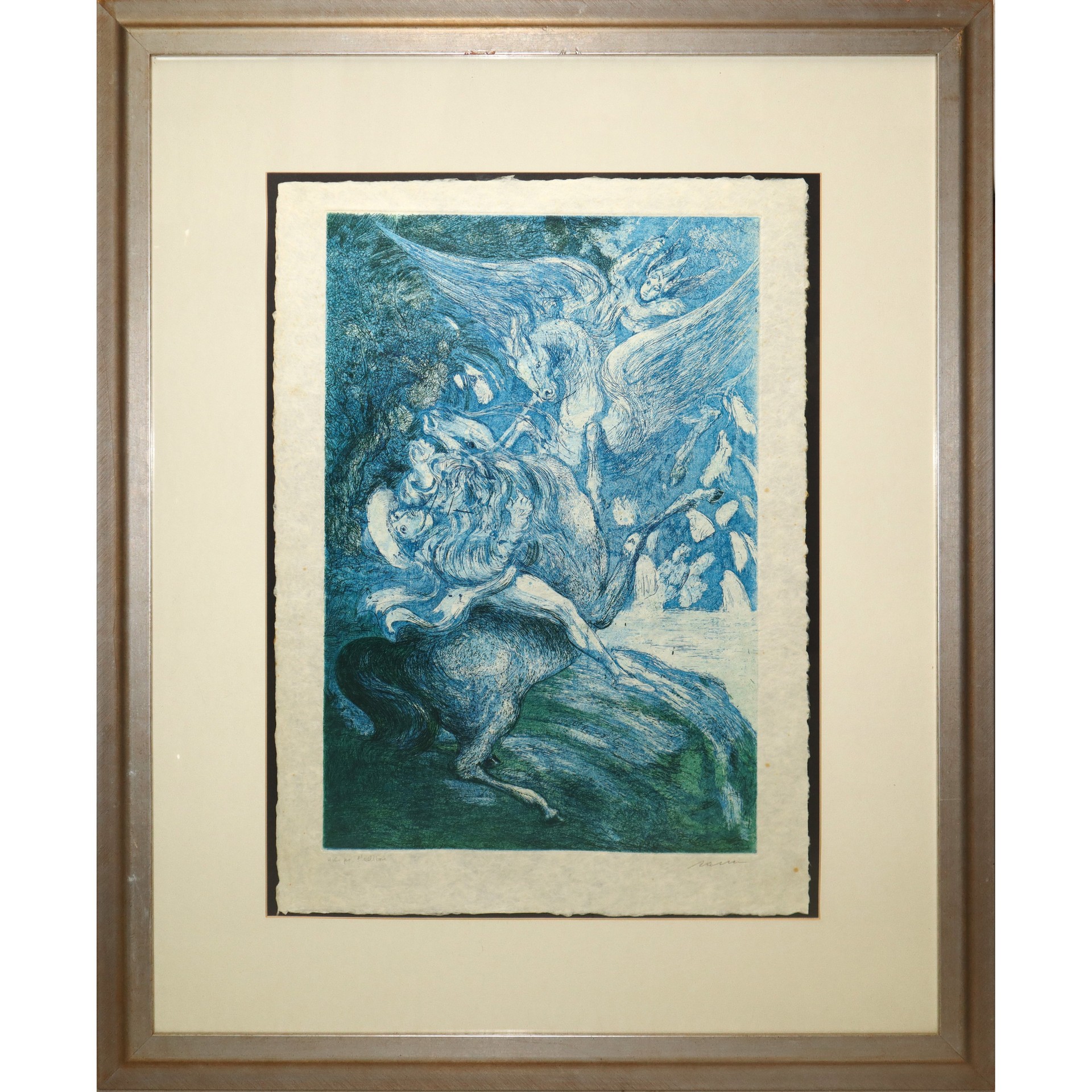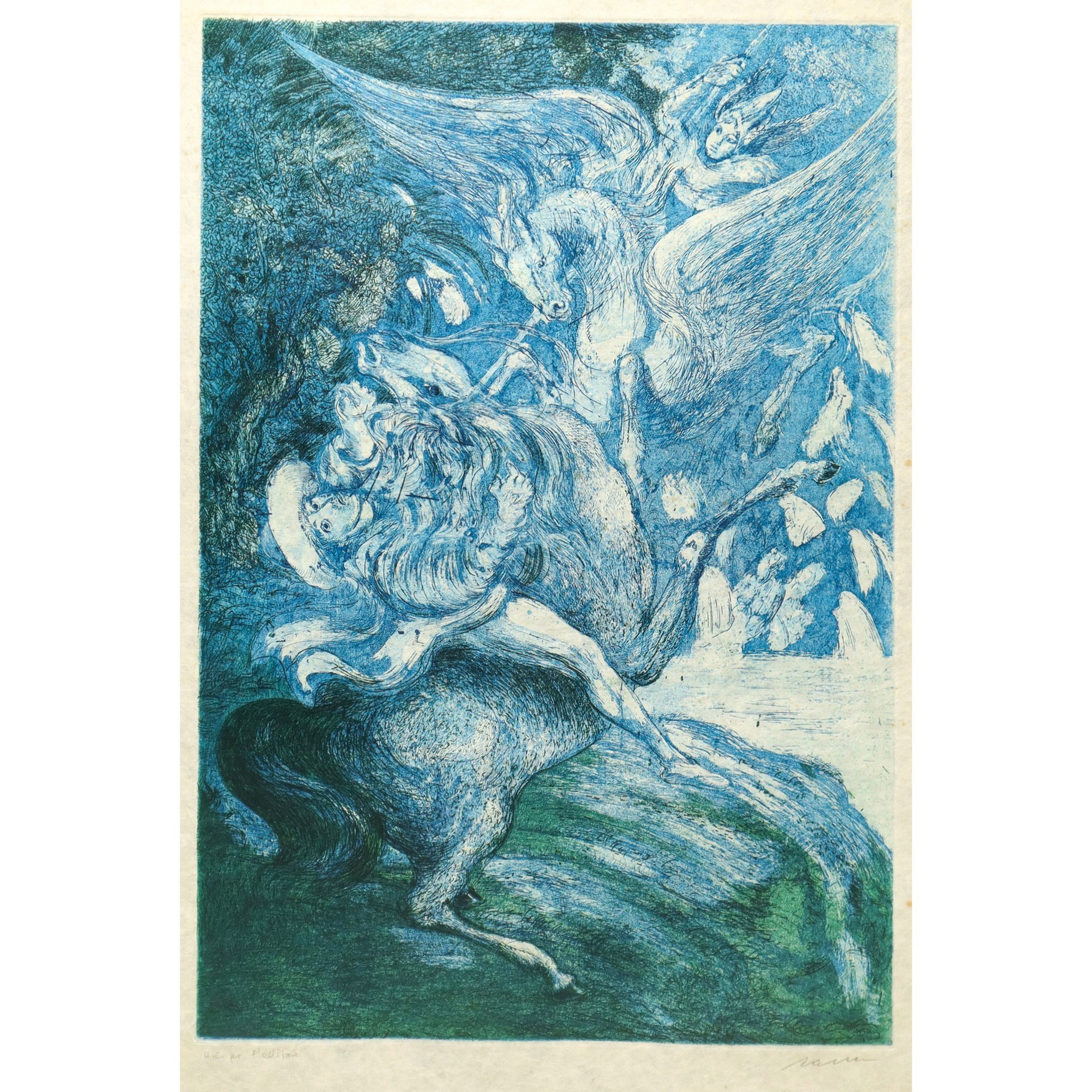 Aligi Sassu (Milano 17/07/1912 - Pollença 17/07/2000) - Ruggero e Gradasso. Combattimento tra Ruggero e il mago Atlante, 1970 h cm 54X41 in cornice h cm 85X70 acquaforte e acquatinta due colori