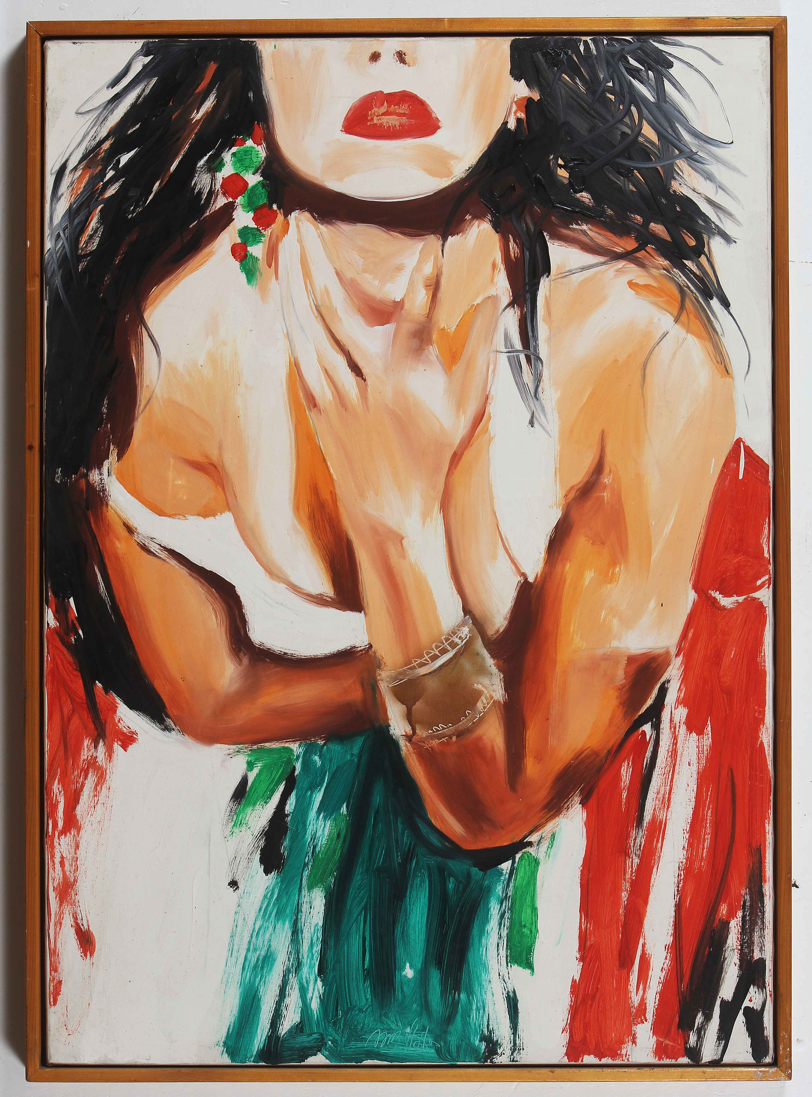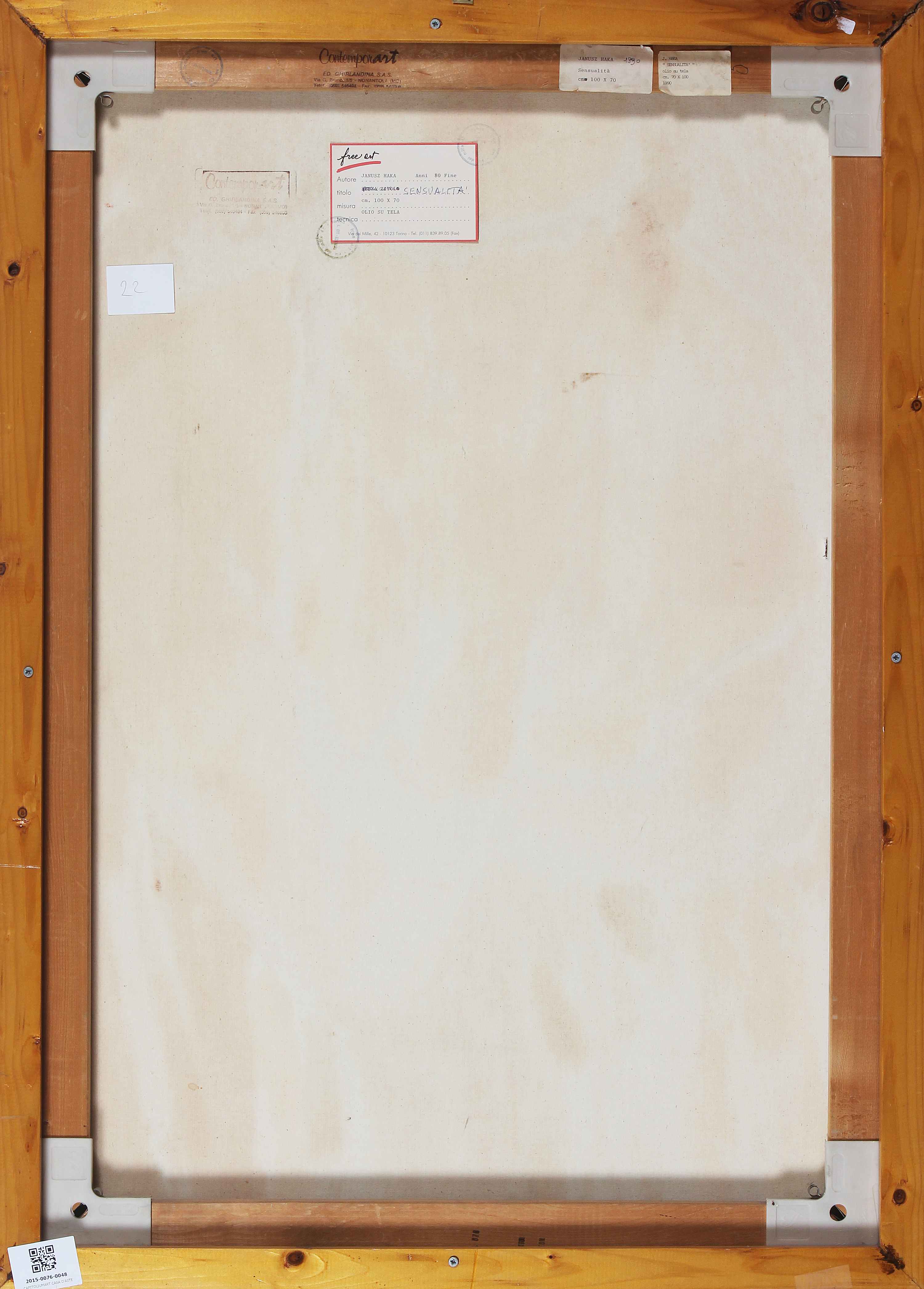 JANUSZ HAKA (n. 1951) Sensualità. Olio su tela . Cm 70,00 x 100,00. Al retro cartiglio descrittivo e timbri a cura di Free Art, Torino. Autentica dell'artista su fotografia. Cornice presente