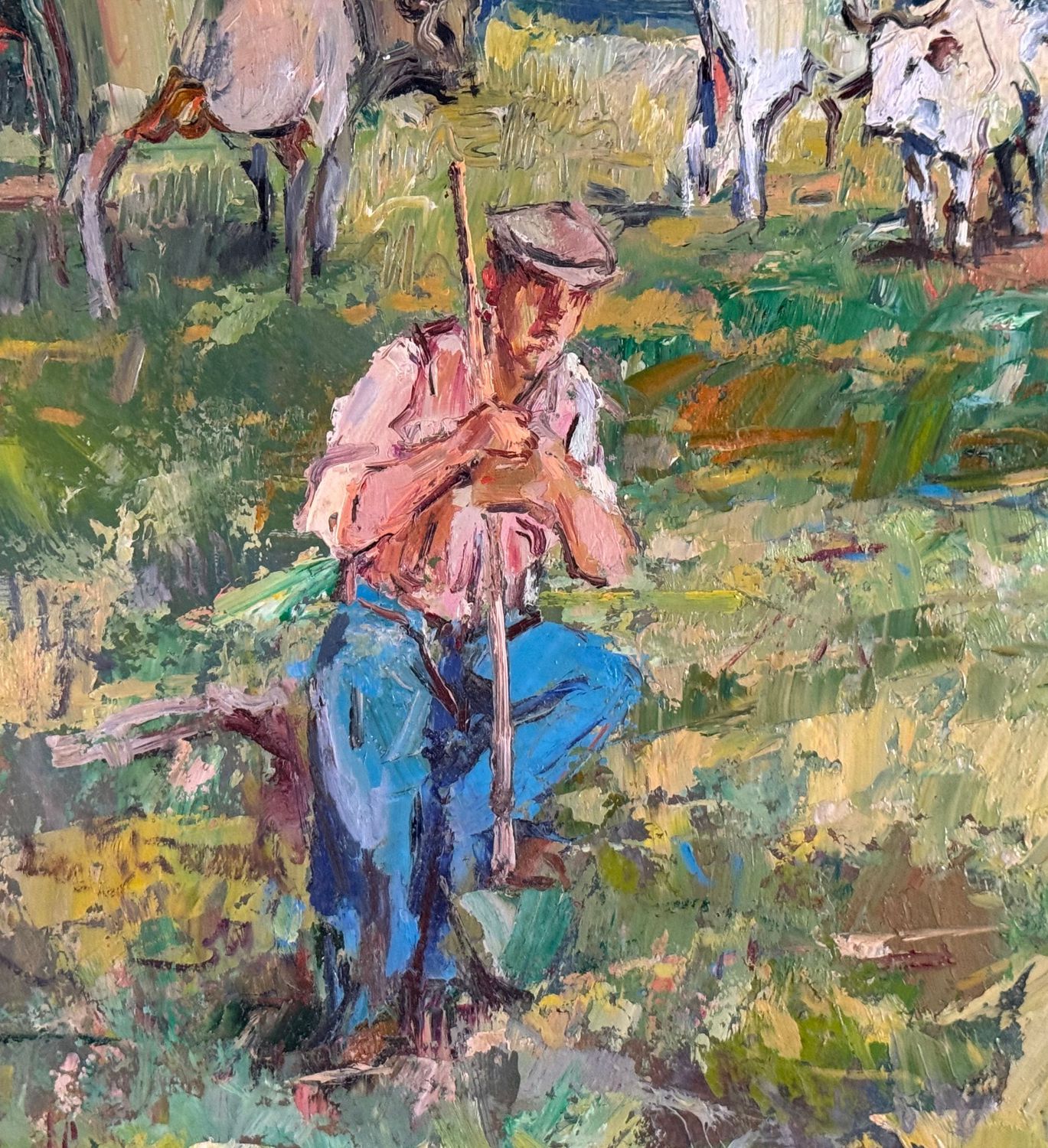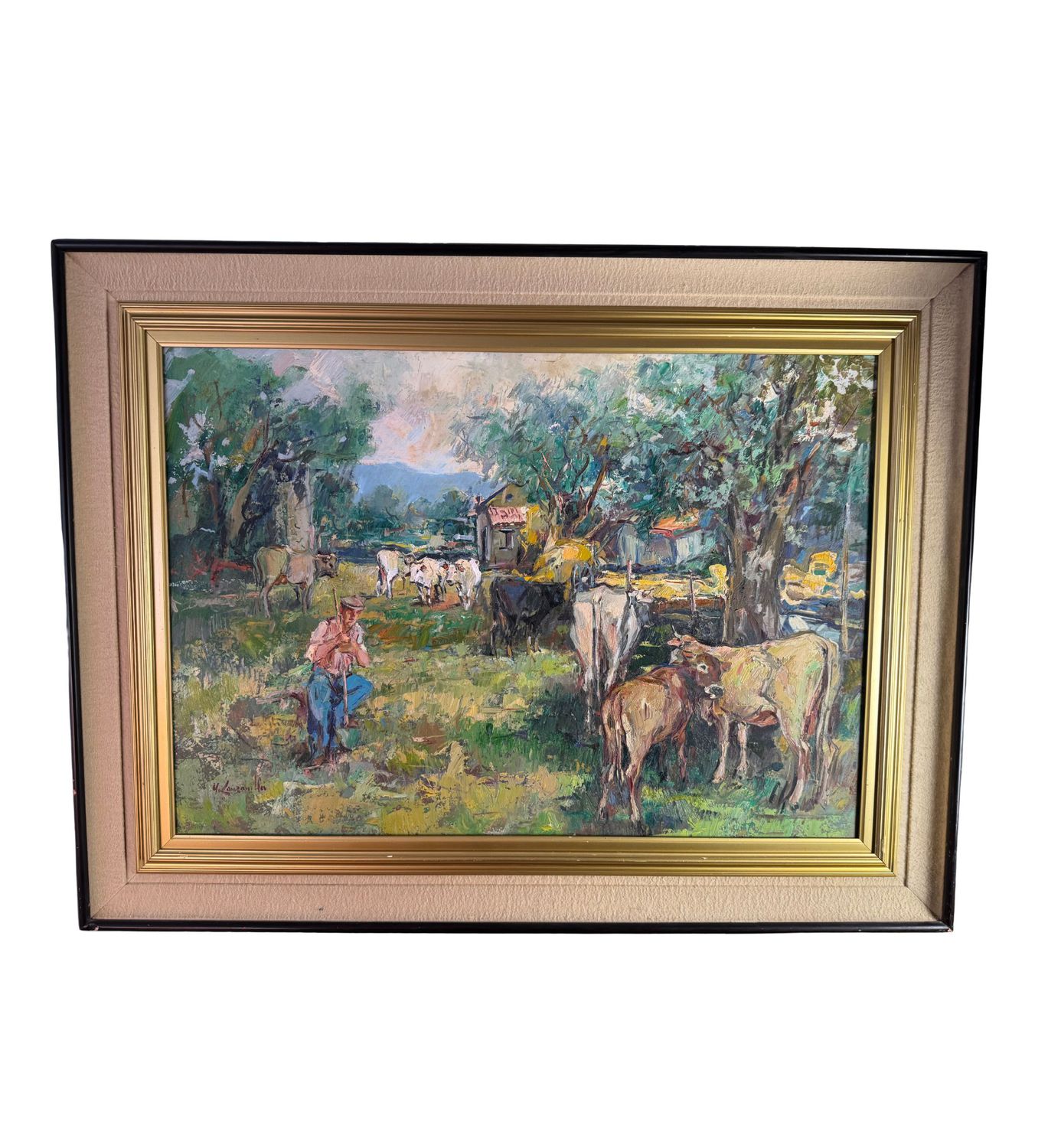 NICOLA CANZANELLA - Dipinto olio su pannello, periodo XX secolo, scuola Italiana, raffigurante Paesaggio di campagna con contadino e bestiame. Dimensioni compreso cornice: 98x127 cm. Dimensioni interno cornice: 70x100 cm. Firmato in basso a sinistra Nicola Canzanella. Opera in buone condizioni e di eccellente qualità artistica.