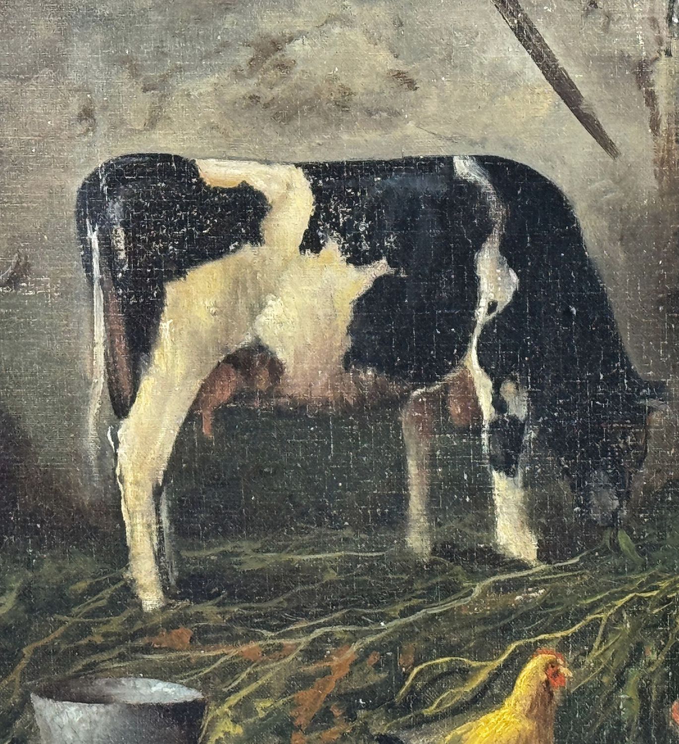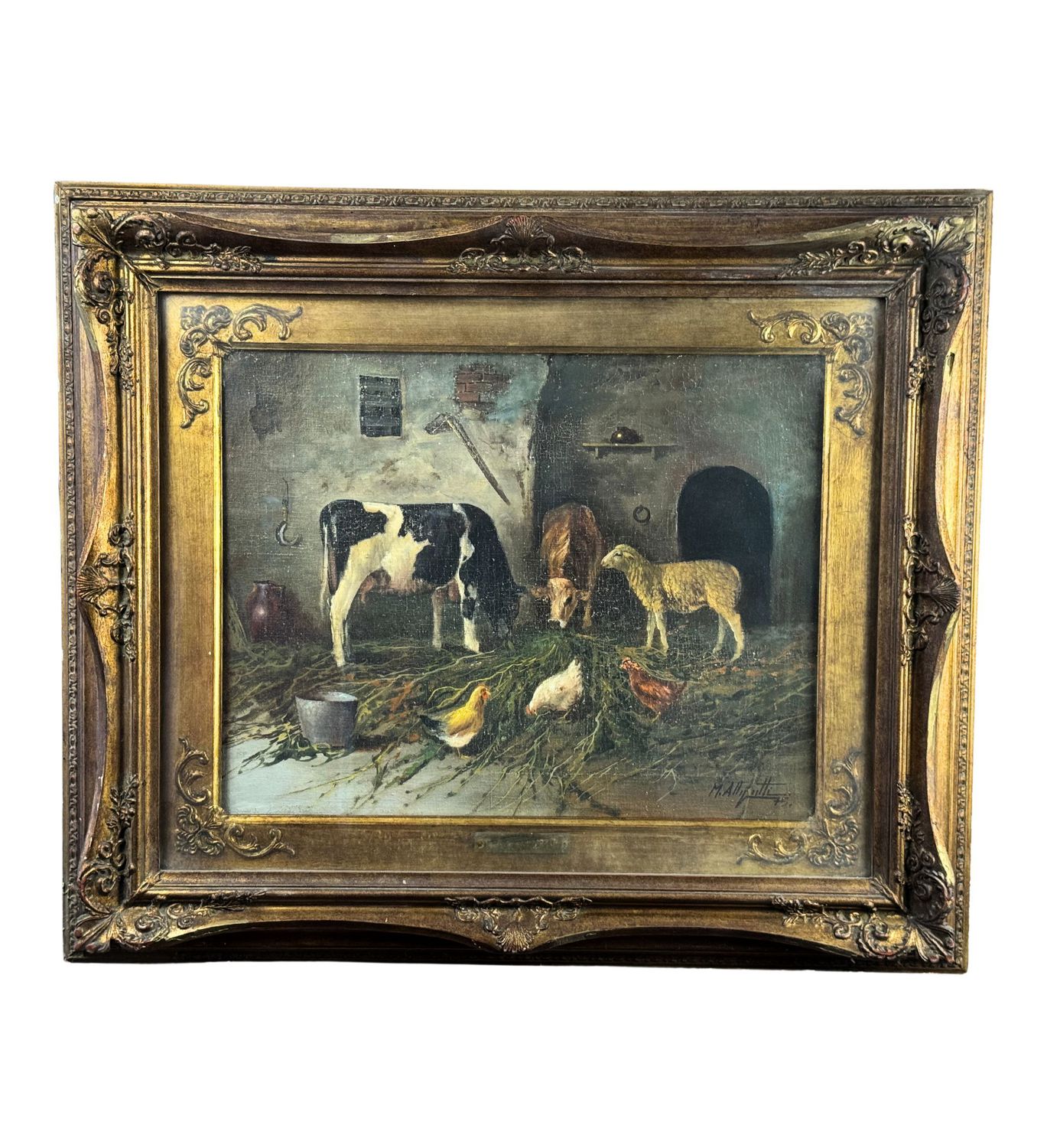 MARIO ALLEGRETTI - Dipinto olio su tela, periodo seconda metà del XX secolo scuola Italiana, raffigurante Interno di stalla. Dimensioni compreso cornice: 69x58 cm. Dimensioni interno cornice: 45x35 cm. Reca firma in basso a destra da Mario Allegretti. Opera in buone condizioni con lievi segni di vissuto me da foto allegate.