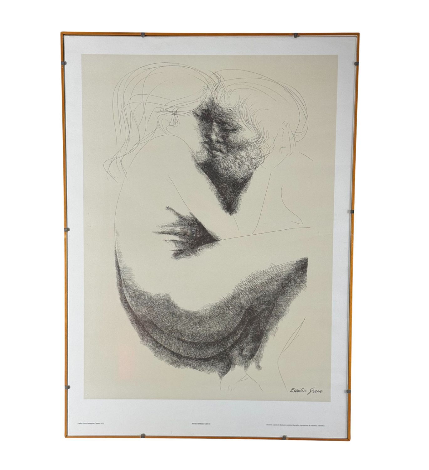Emilio Greco - Incisione a punta di diamante su pietra litografica, riproduzione da originale (Artesia) periodo 1972 XX secolo scuola italiana raffigurante "Immagine d'amore 1972". Dimensioni compreso cornice: 51x71 cm. Dimensioni interno cornice: 50x70 cm. Firmato in basso a destra Emilio Greco. Opera in buone condizioni.