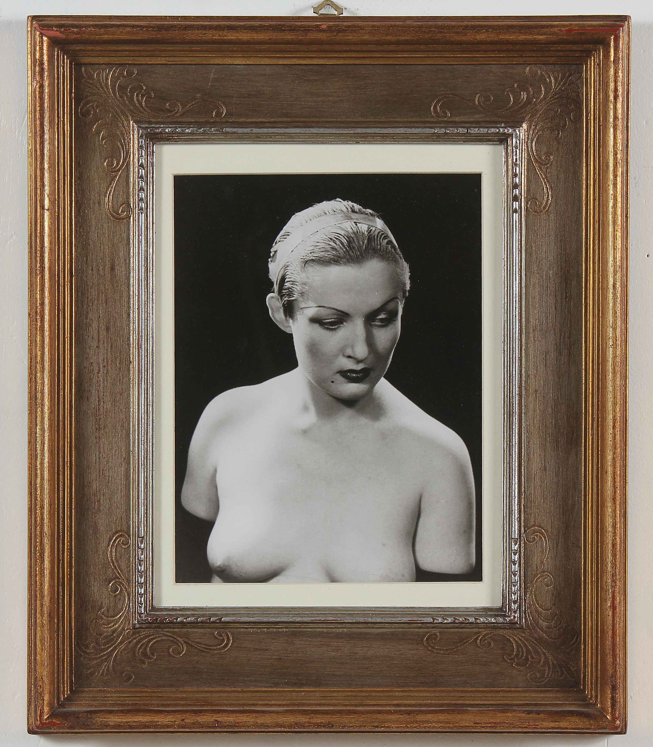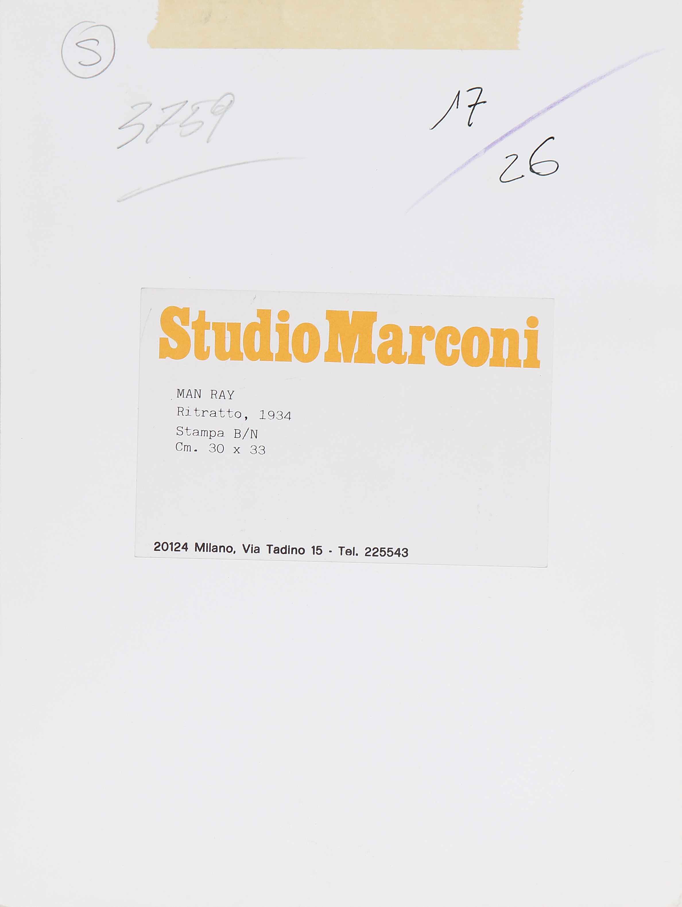 MAN RAY (1890 - 1976) Ritratto. 1981. Fotografia. Cm 30,00 x 33,00. Edizione: 35 + 5 h.c.. Al retro reca il cartiglio dello Studio Marconi, Milano. Da un portfolio di 26 fotografie stampate da negativi originali, nello Studio Mario Carrieri di Milano, da Paolo Vandrasch su carta al bromuro di argento tipo 138. Edizione autorizzata e controllata da Juliet Man Ray. I negativi di questa edizione sono stati donati al Centro Studi dell'Università di Parma che garantisce la loro conservazione ed il loro utilizzo per soli scopi scientifici. Opera pubblicata sul catalogo (allegato all'opera) della mostra - Man Ray, Femmes - tenuta presso la galleria L'Incontro, Chiari, dal 5 Dicembre 2004 al 16 Gennaio 2005, tav. 17.