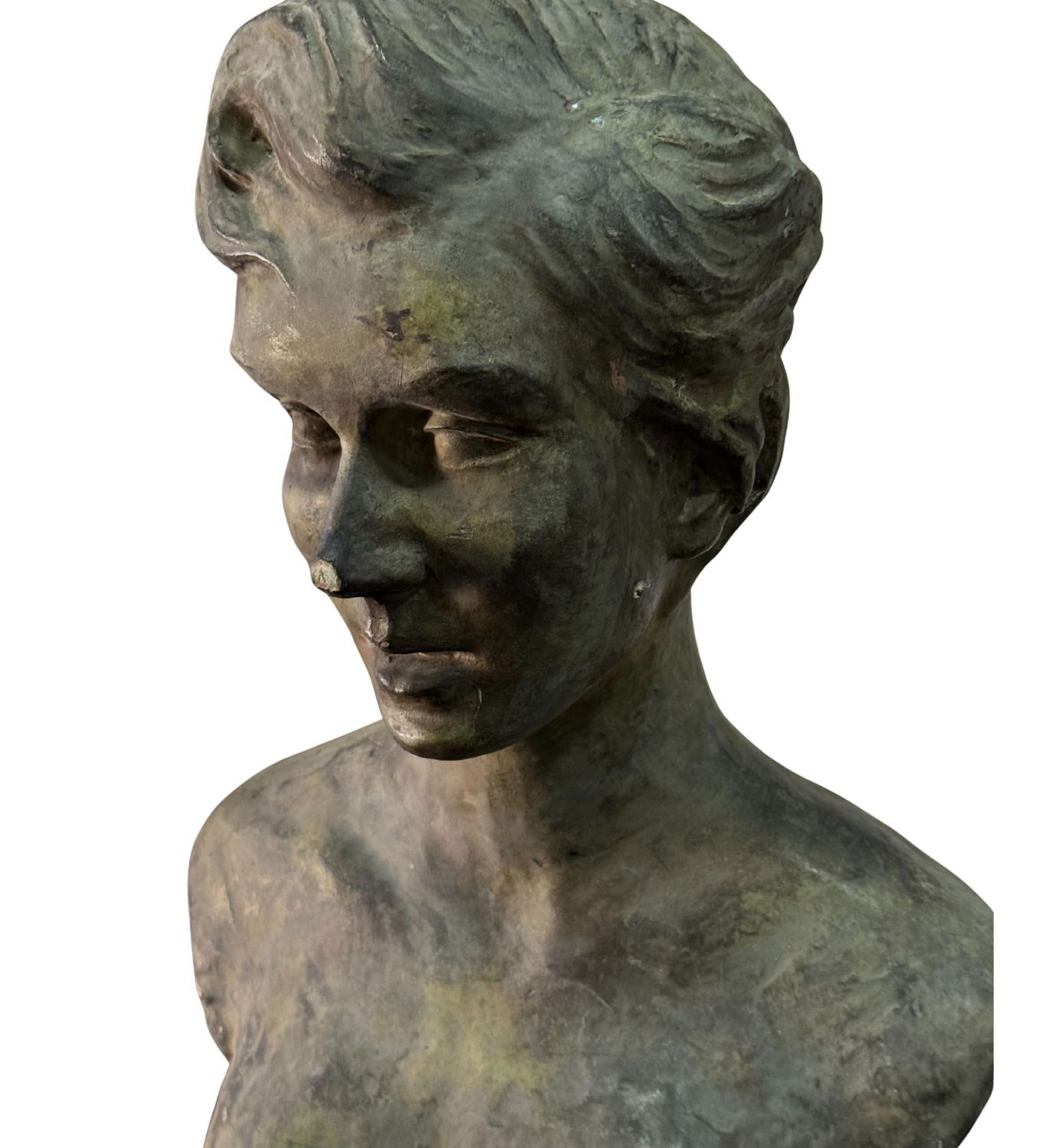 Scultura calco in gesso patinato, periodo XX secolo, raffigurante Busto di donna. Dimensioni: 55x35x21 cm. Firmato sul retro da artista non identificato. Opera in buone condizioni con lievi segni di vissuto come da foto allegate.