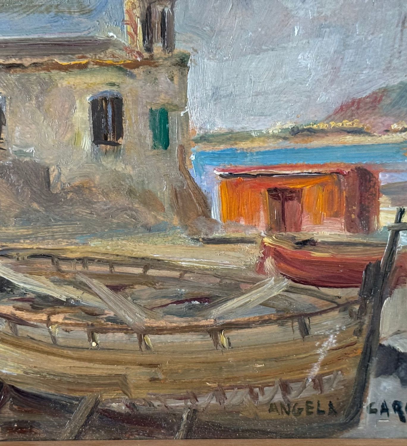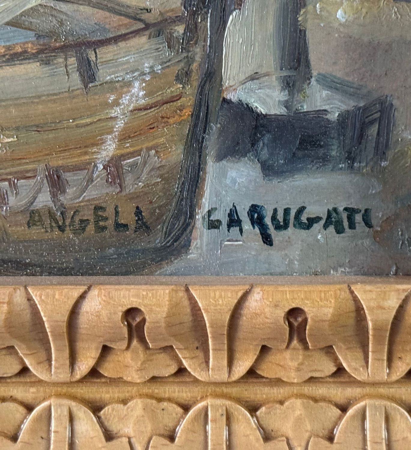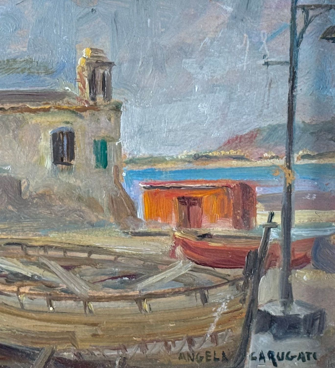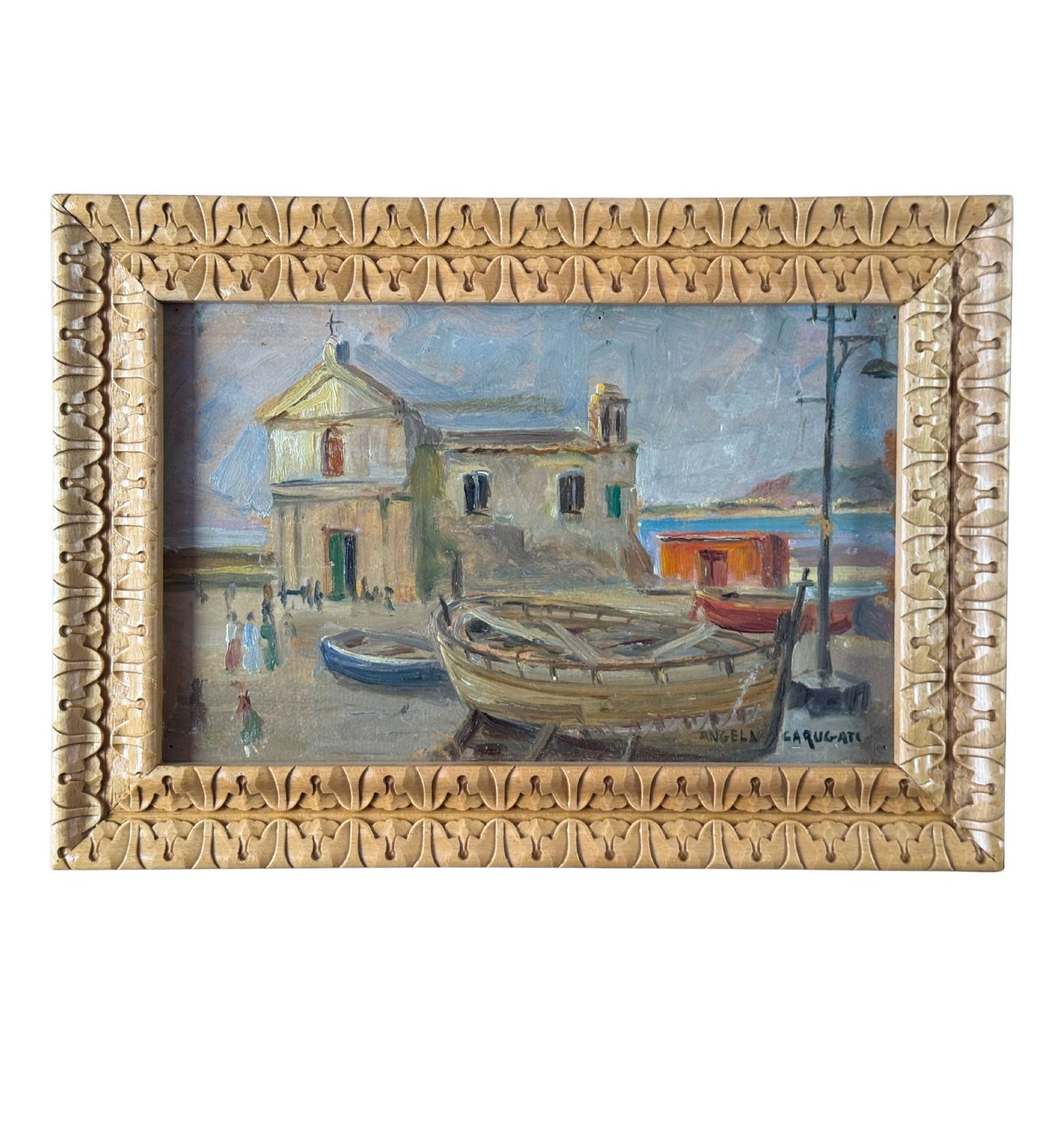 ANGELA CARUGATI - Dipinto olio su pannello, periodo XX secolo, scuola Italiana, raffigurante Scorcio di marina con chiesetta e barche. Dimensioni compreso cornice: 42x30 cm. Dimensioni interno cornice: 34x21 cm. Firmato in basso a destra Angela Carugati. Opera in buone condizioni.