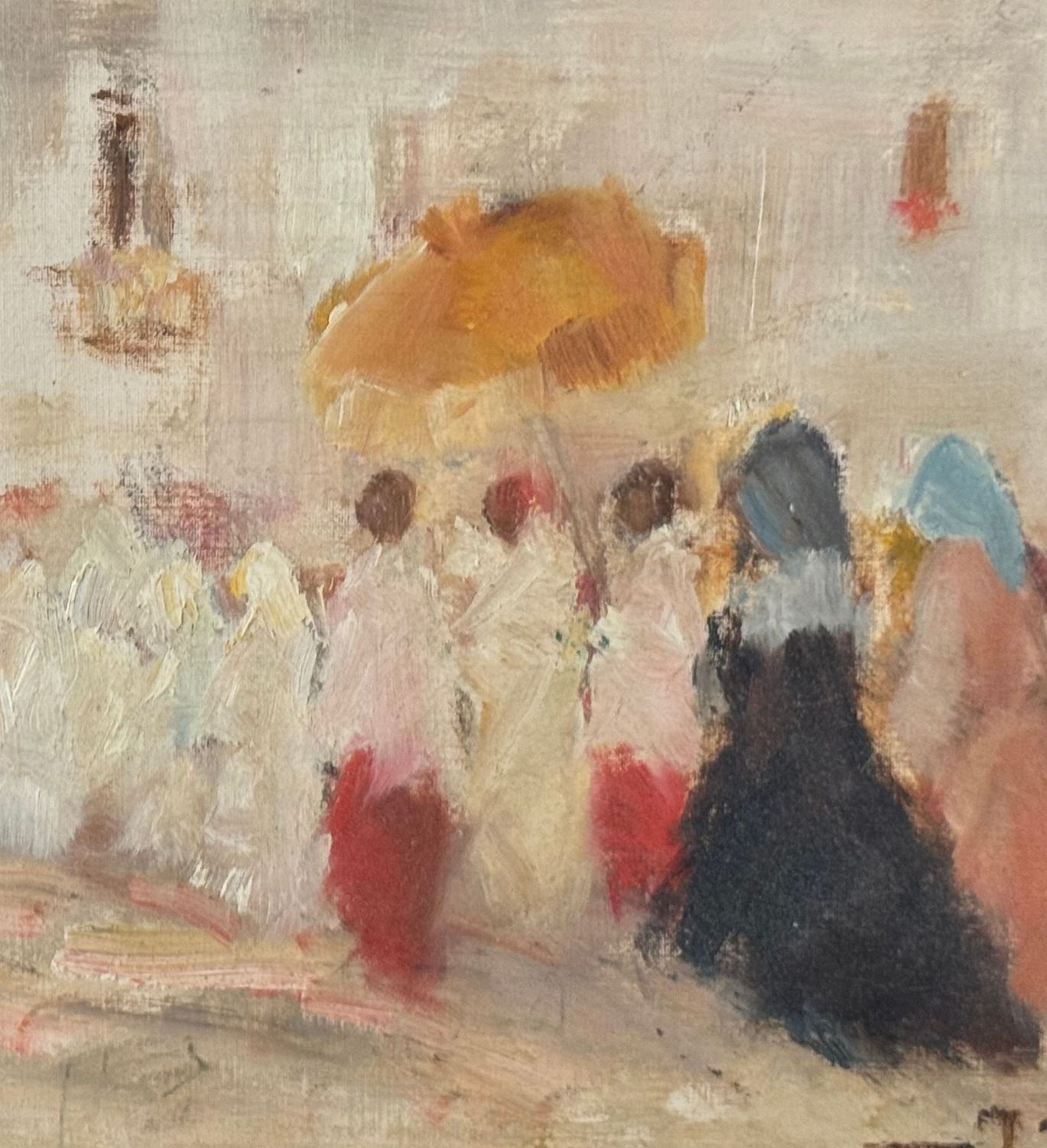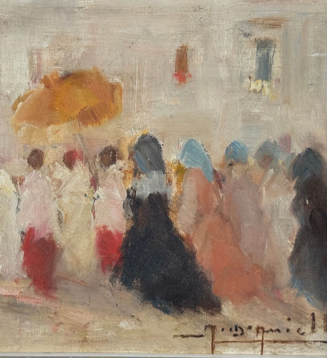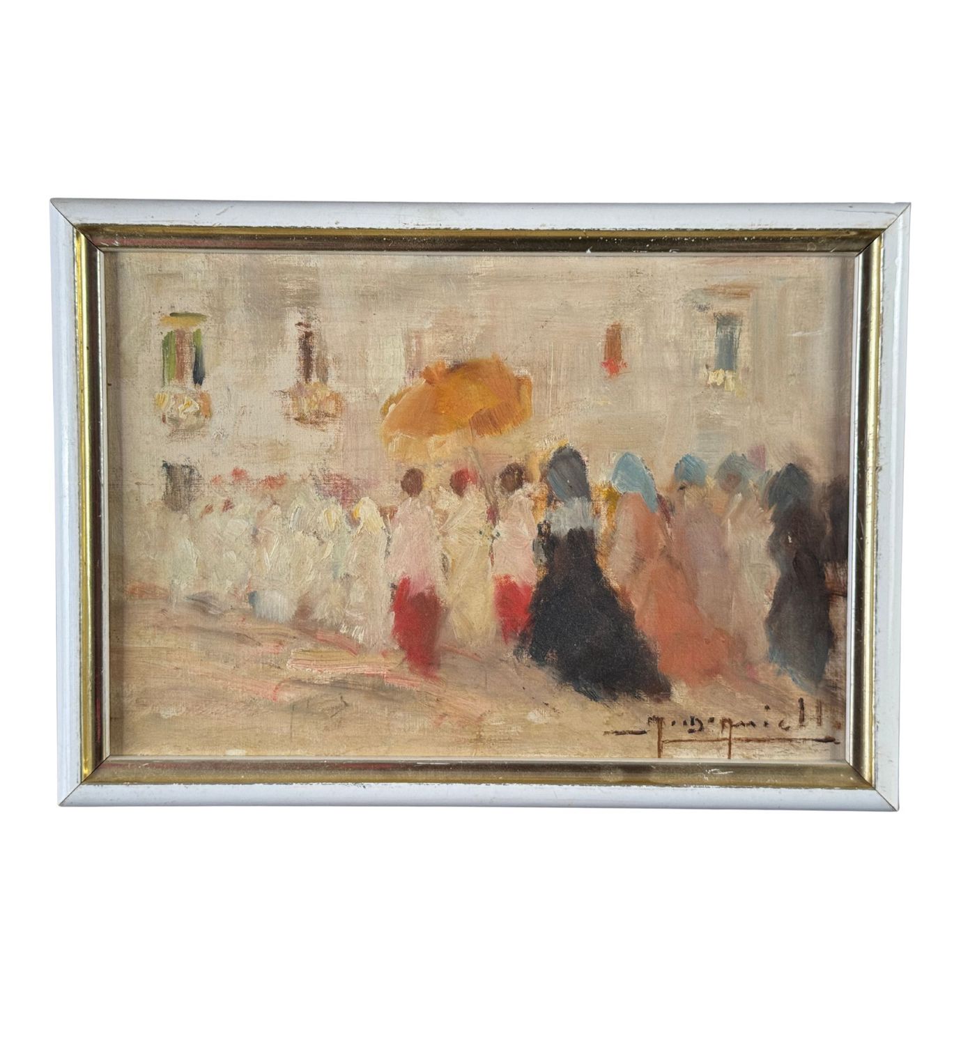 M. D'Aniello - Dipinto olio su tavola, periodo XX secolo, scuola Italiana, raffigurante Donna in processione. Dimensioni: 30x21 cm. Firmato in basso a destra M. Daniello. Opera in buone condizioni.