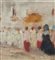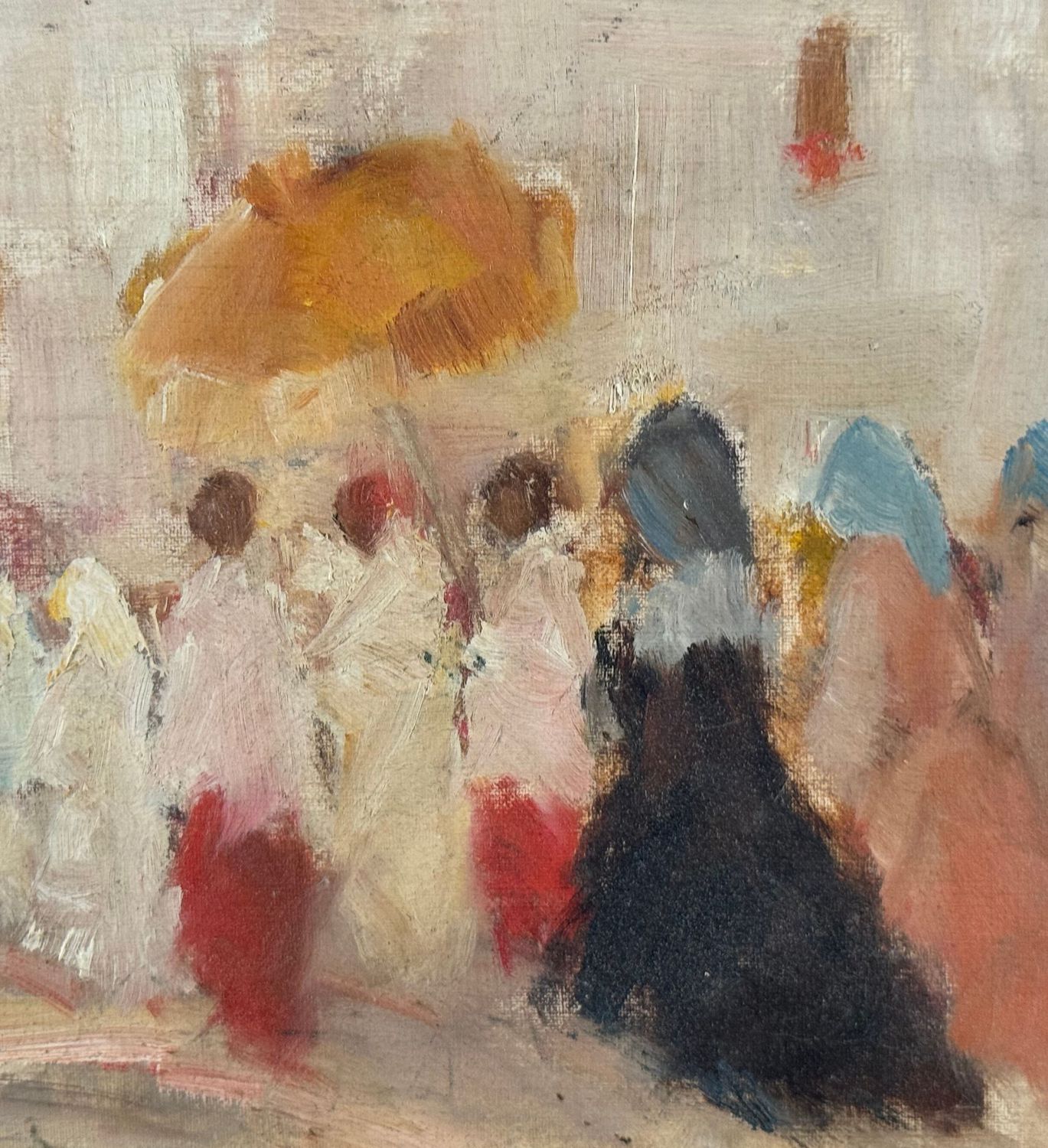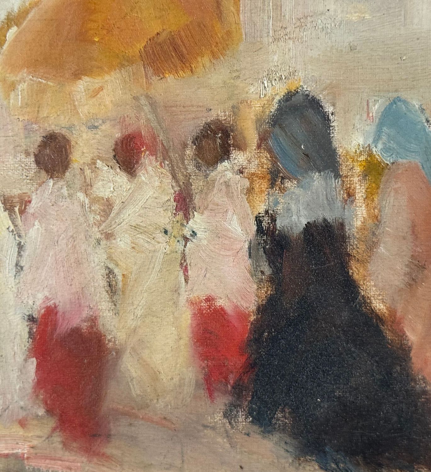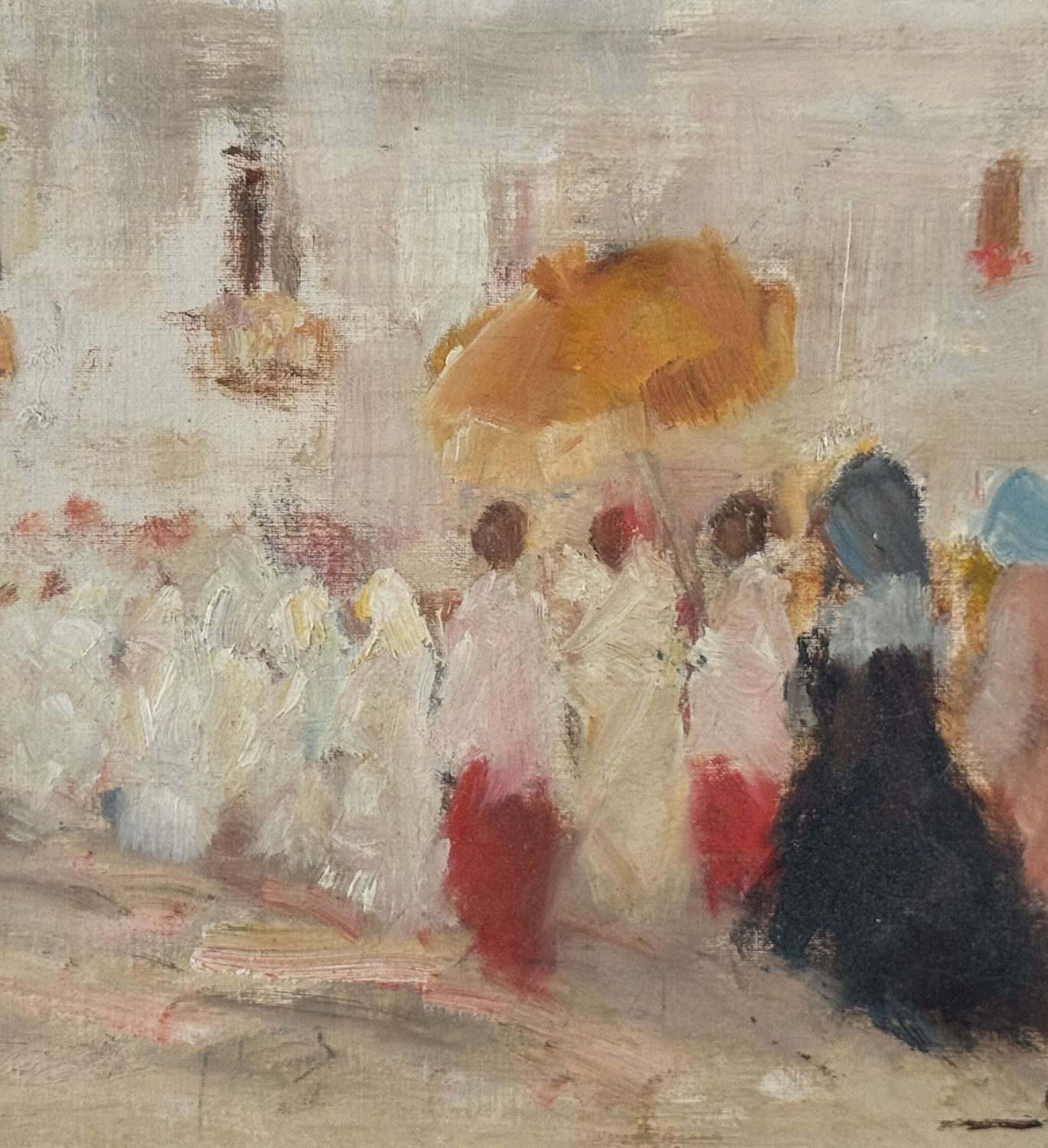 M. D'Aniello - Dipinto olio su tavola, periodo XX secolo, scuola Italiana, raffigurante Donna in processione. Dimensioni: 30x21 cm. Firmato in basso a destra M. Daniello. Opera in buone condizioni.