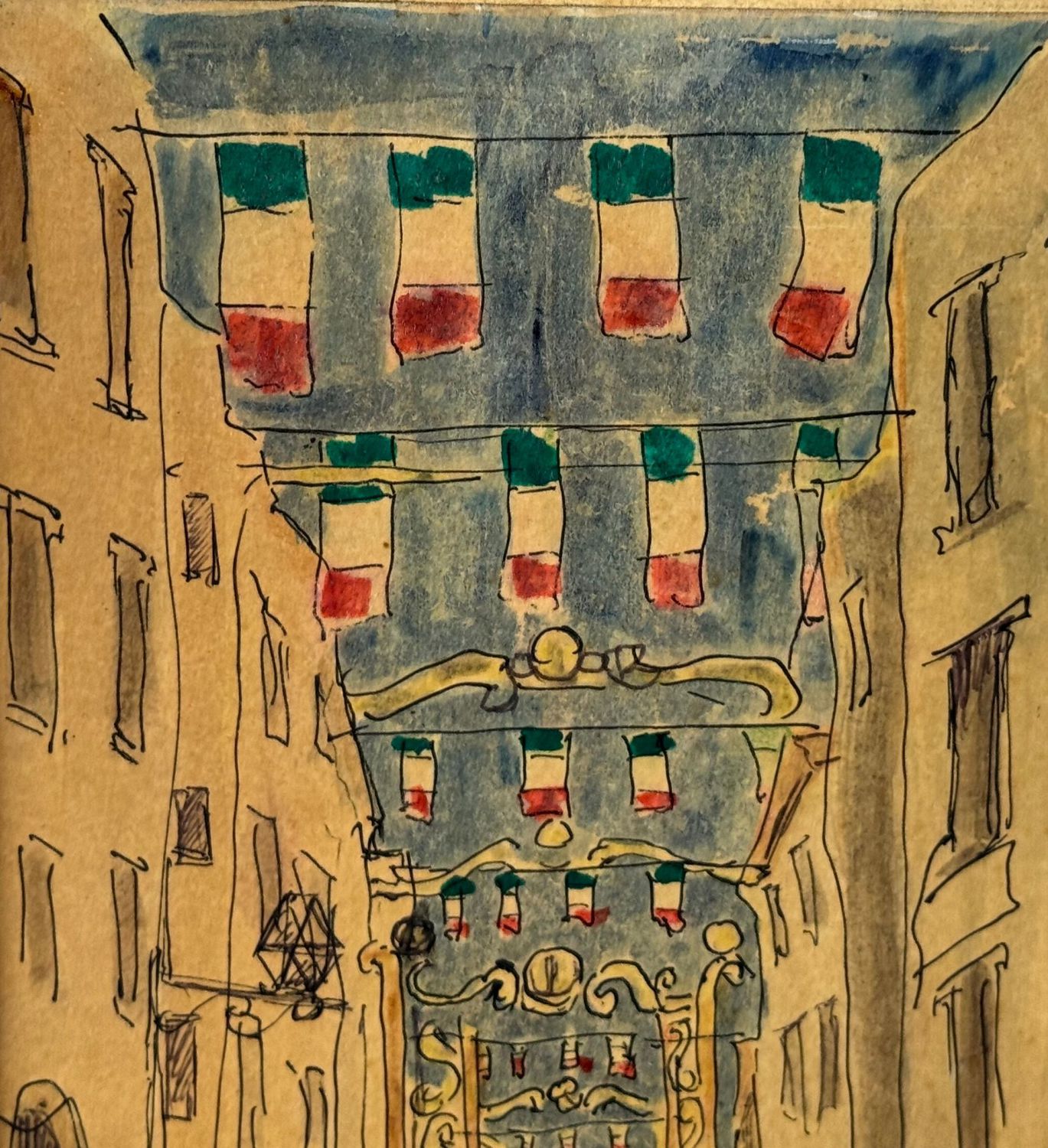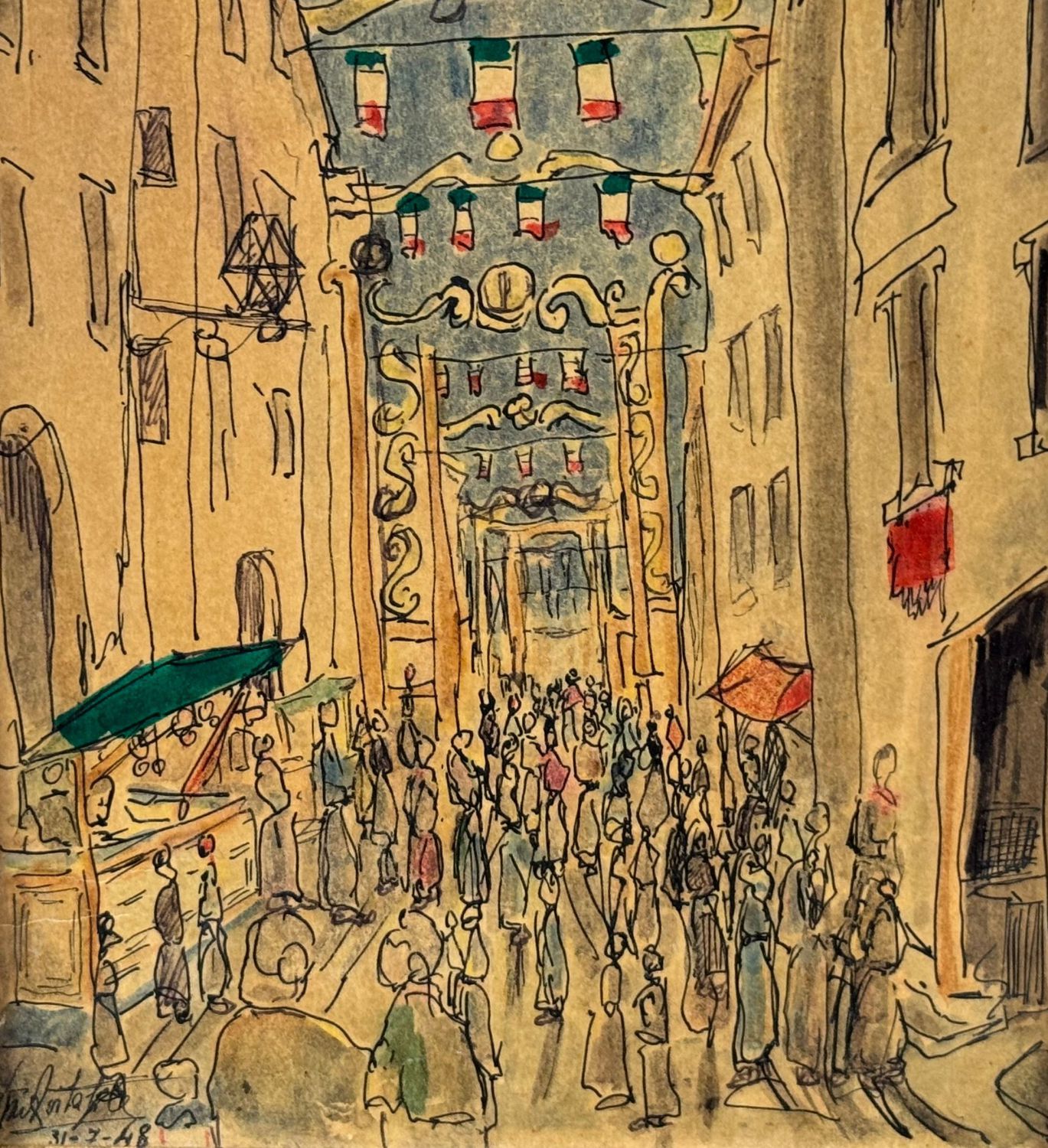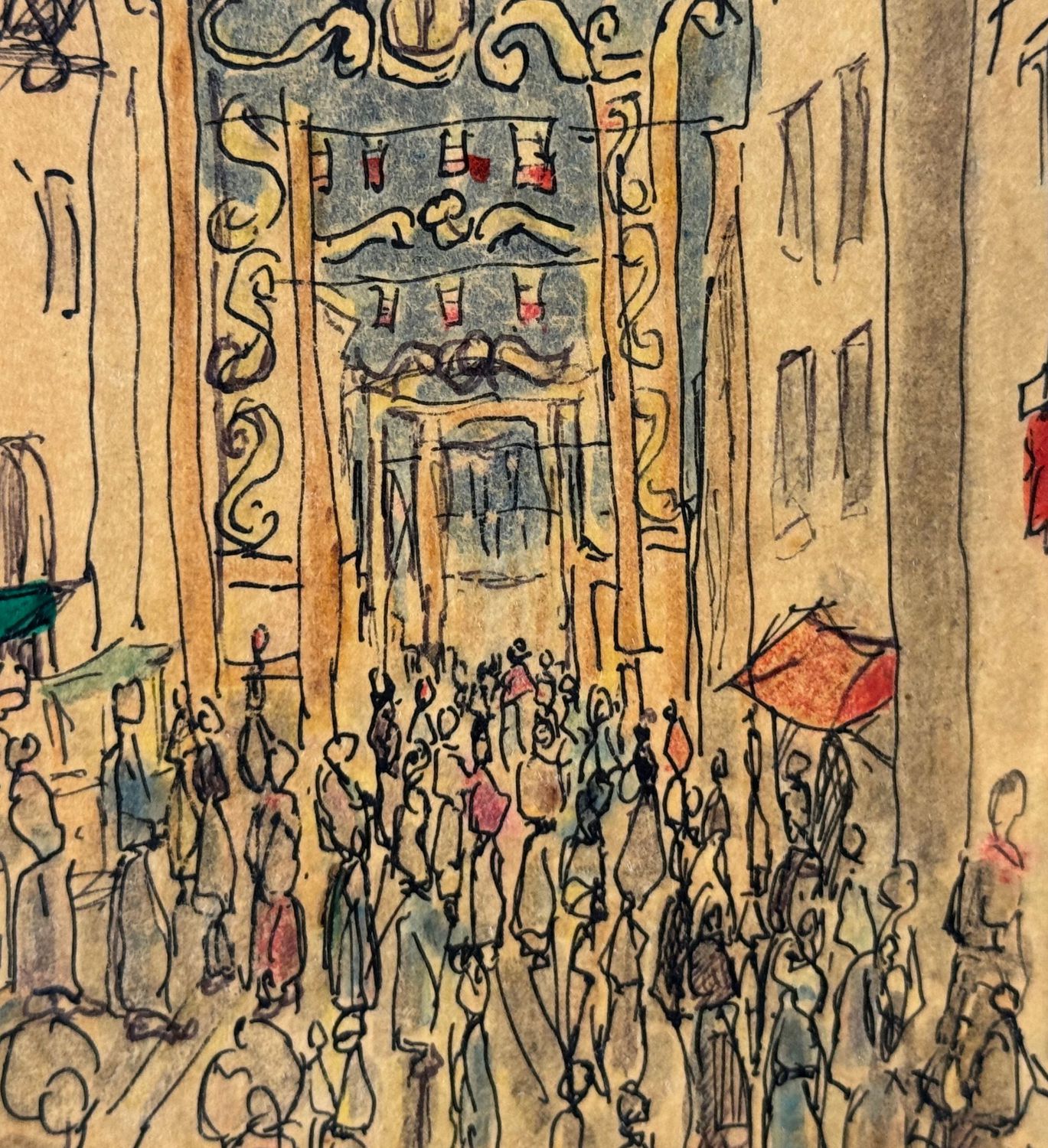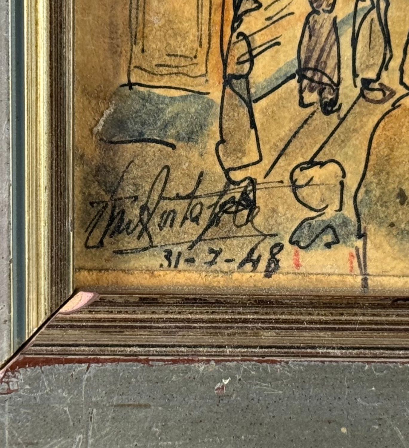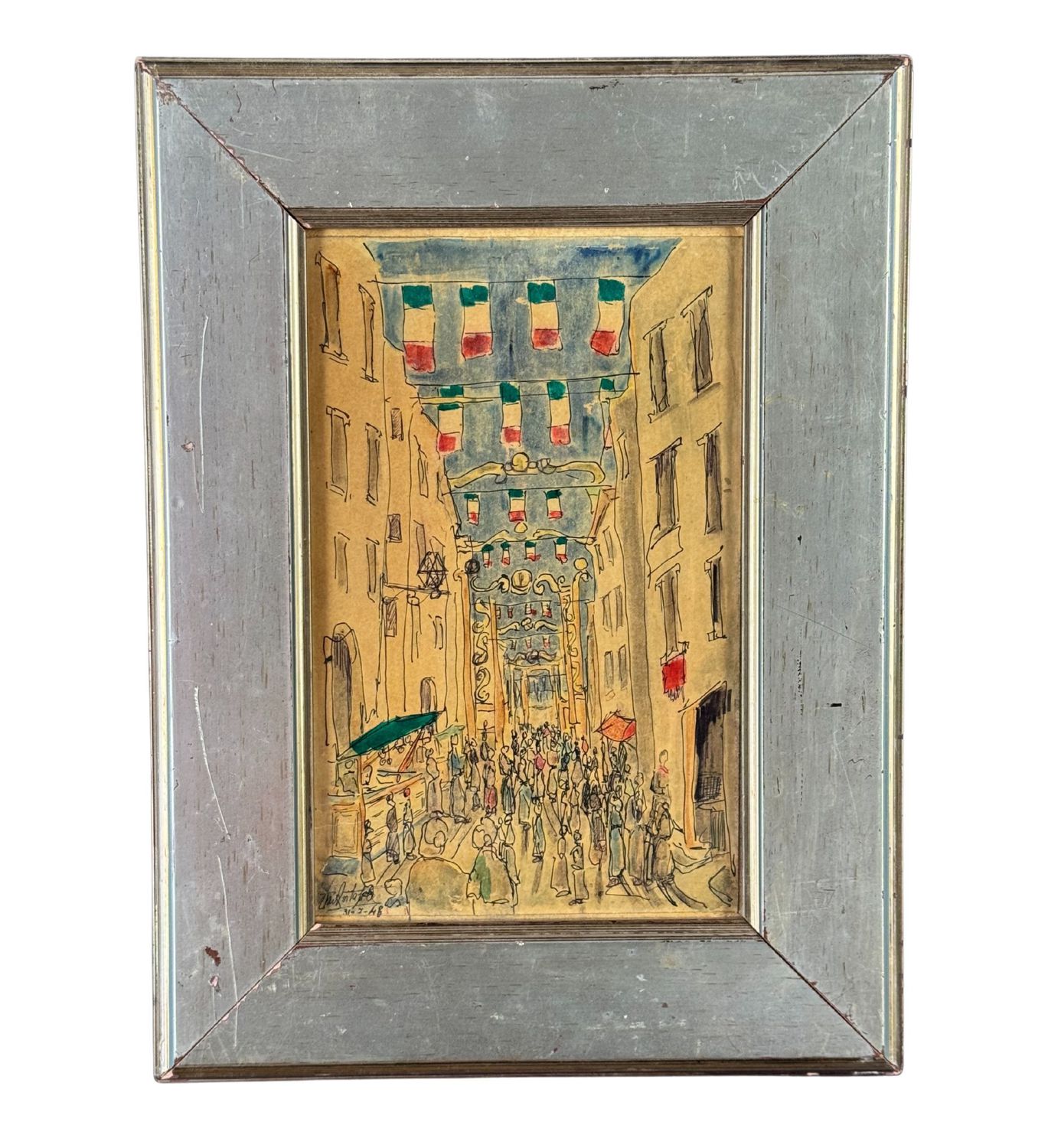 UNIDENTIFIED SIGNATURE - Dipinto tecnica mista su carta, periodo XX secolo, scuola Italiana, raffigurante Strada con personaggi. Dimensioni compreso cornice: 26x34 cm. Dimensioni interno cornice: 14,5x23 cm. Firmato in basso a sinistra artista non identificato. Opera in buone condizioni.