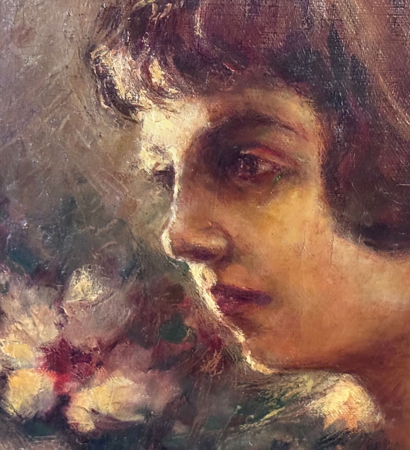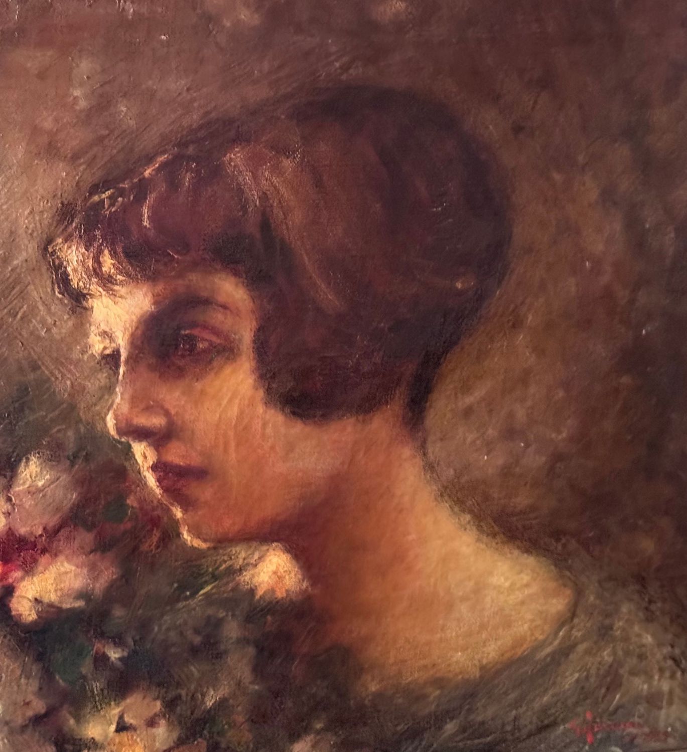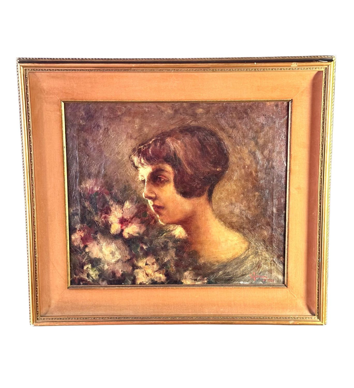 Giuseppe Ferrari - Dipinto olio su tela, periodo XX secolo, scuola Italiana, raffigurante Ritratto di donna con fiori. Dimensioni compreso cornice: 57x63 cm. Dimensioni interno cornice: 41x48 cm. Firmato in basso a destra Giuseppe Ferrari. Opera in buone condizioni con lievi segni di vissuto come da foto allegate.