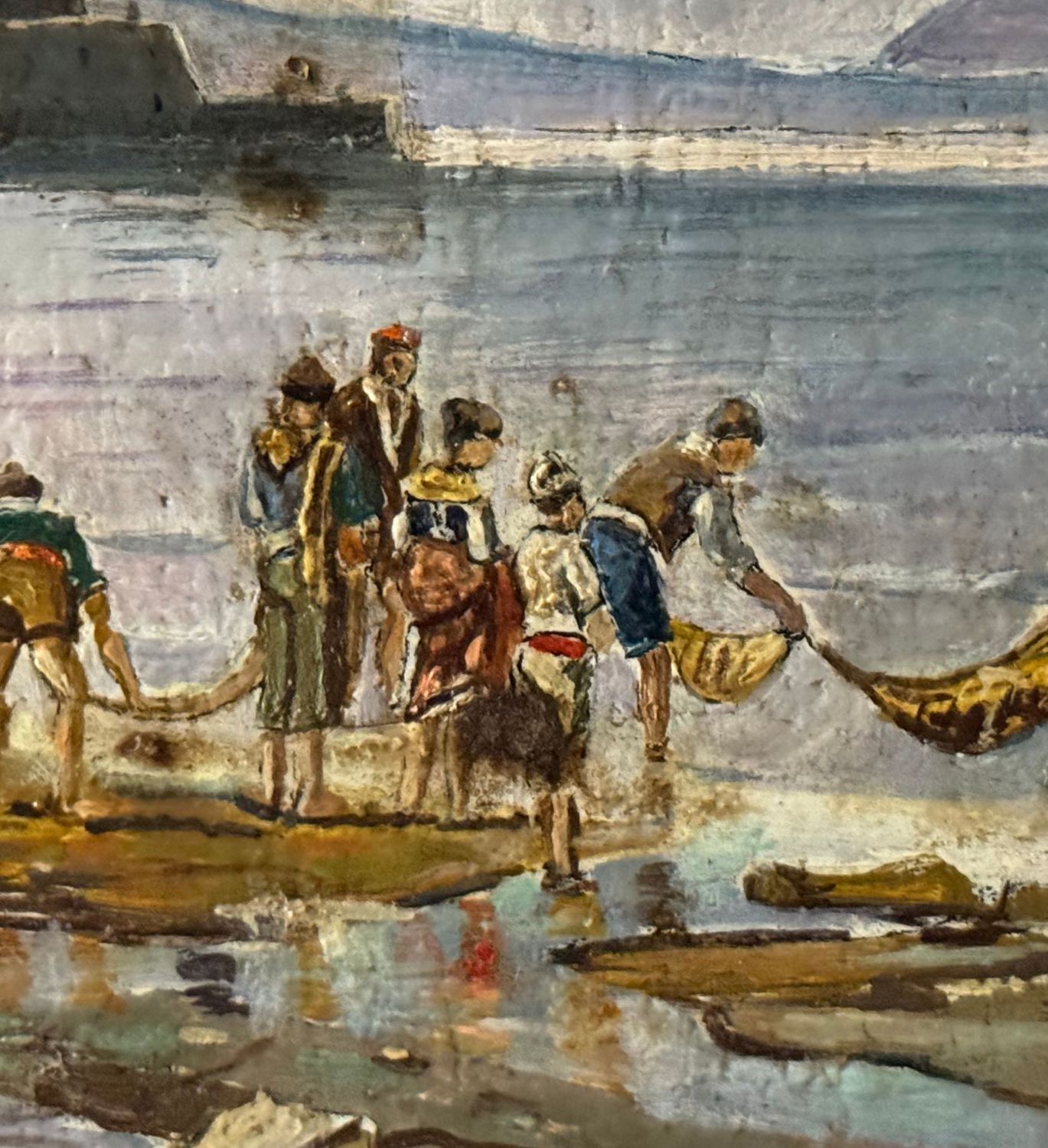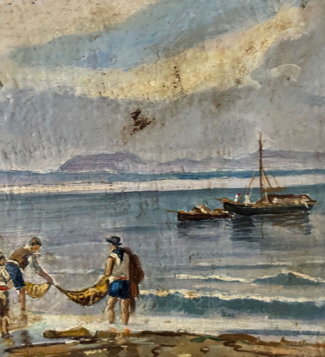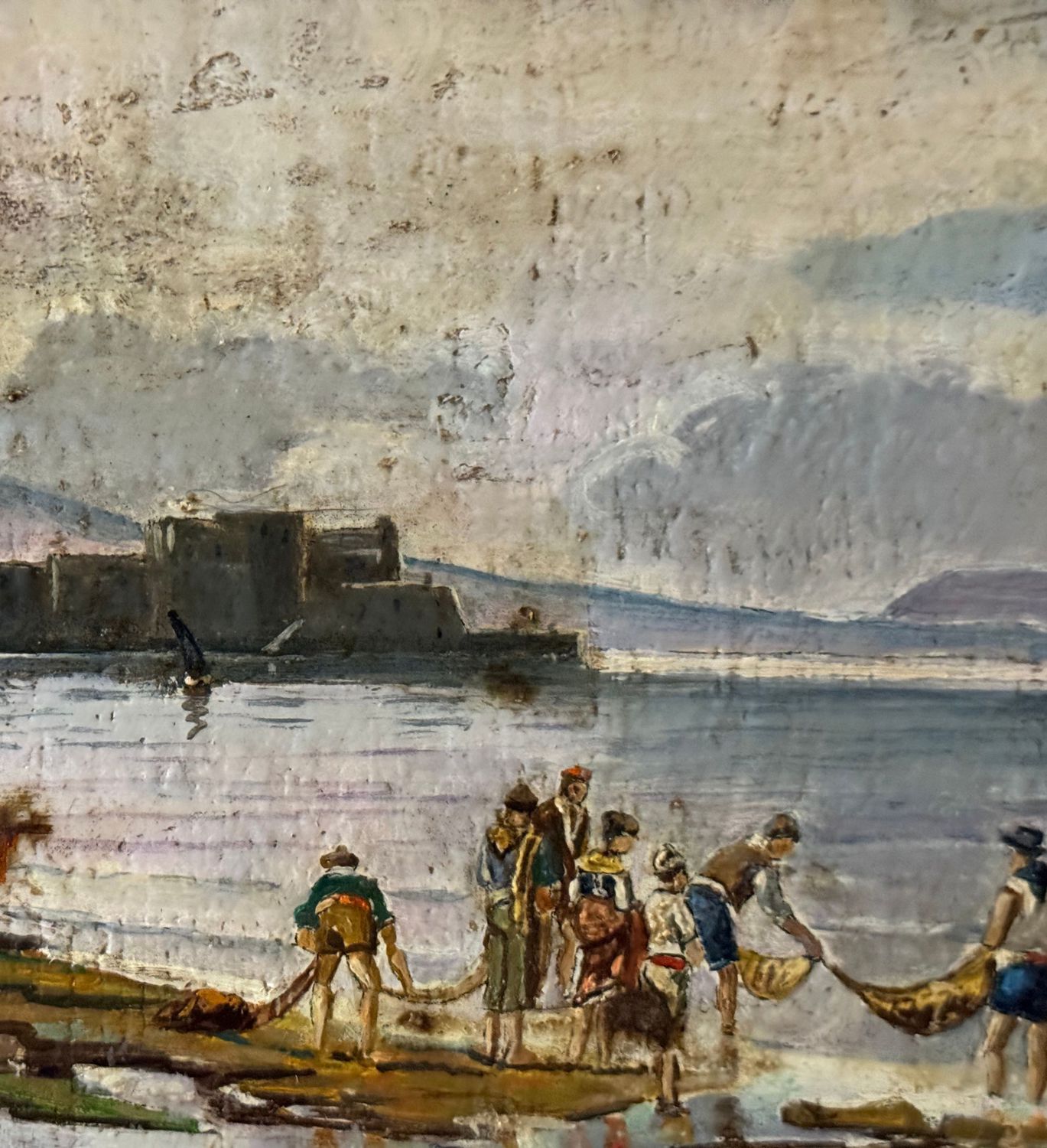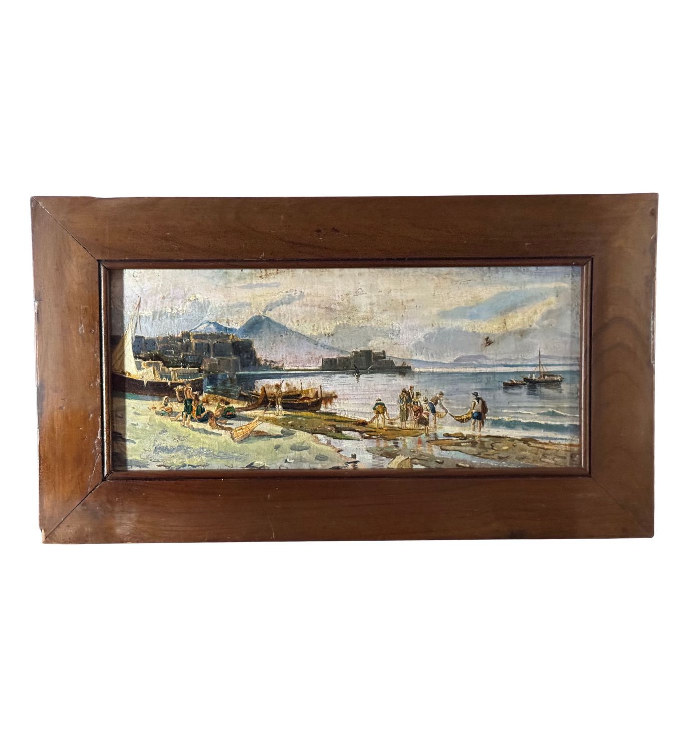 ANONIMO - Dipinto olio su tela, periodo XX secolo, raffigurante Marina napoletana con pescatori. Dimensioni compreso cornice: 57x32 cm. Dimensioni interno cornice: 45x20 cm. Da artista anonimo. Opera in buone condizioni con lievi segni di vissuto come da foto allegate.