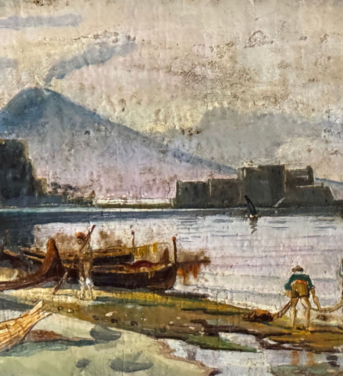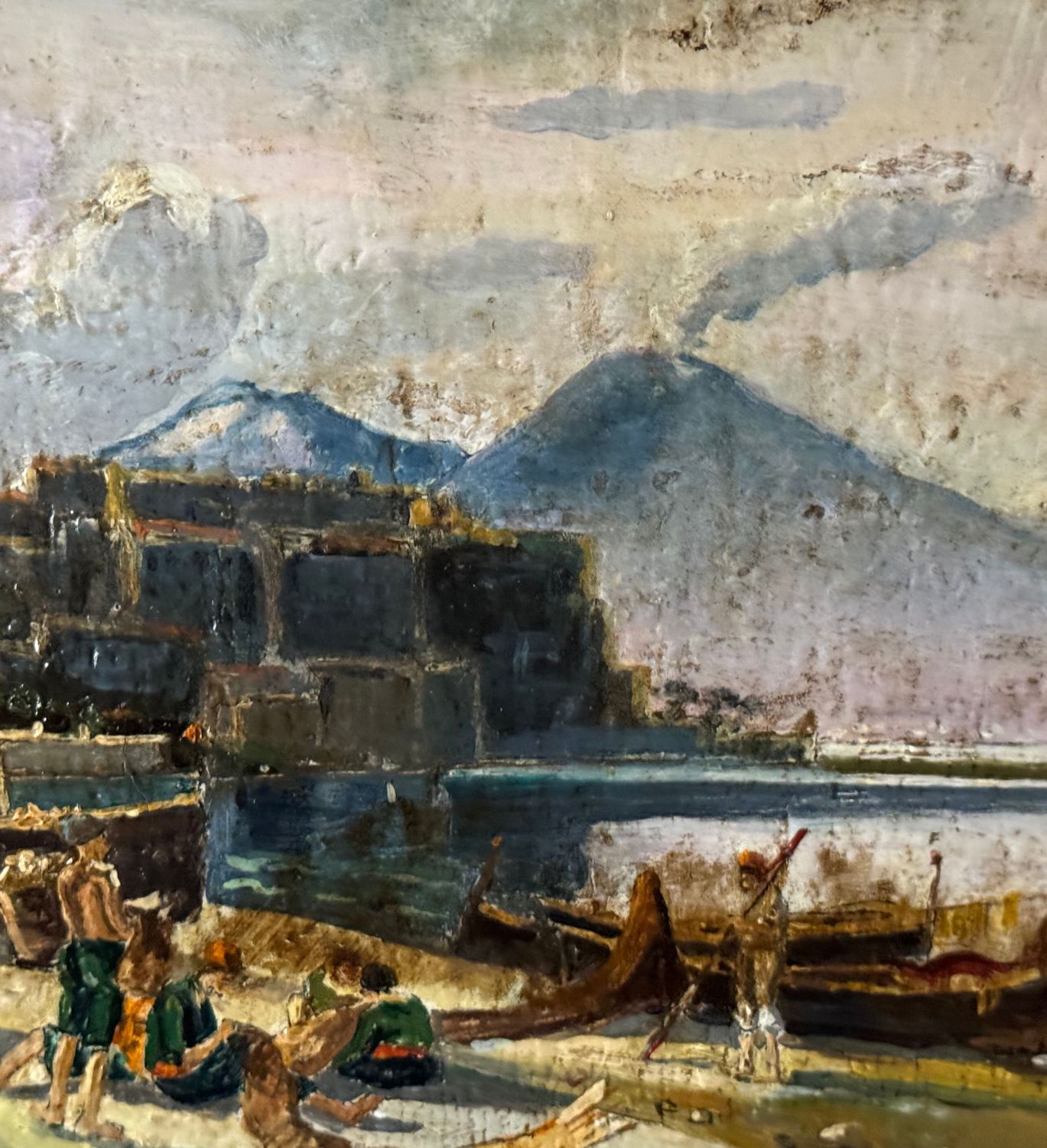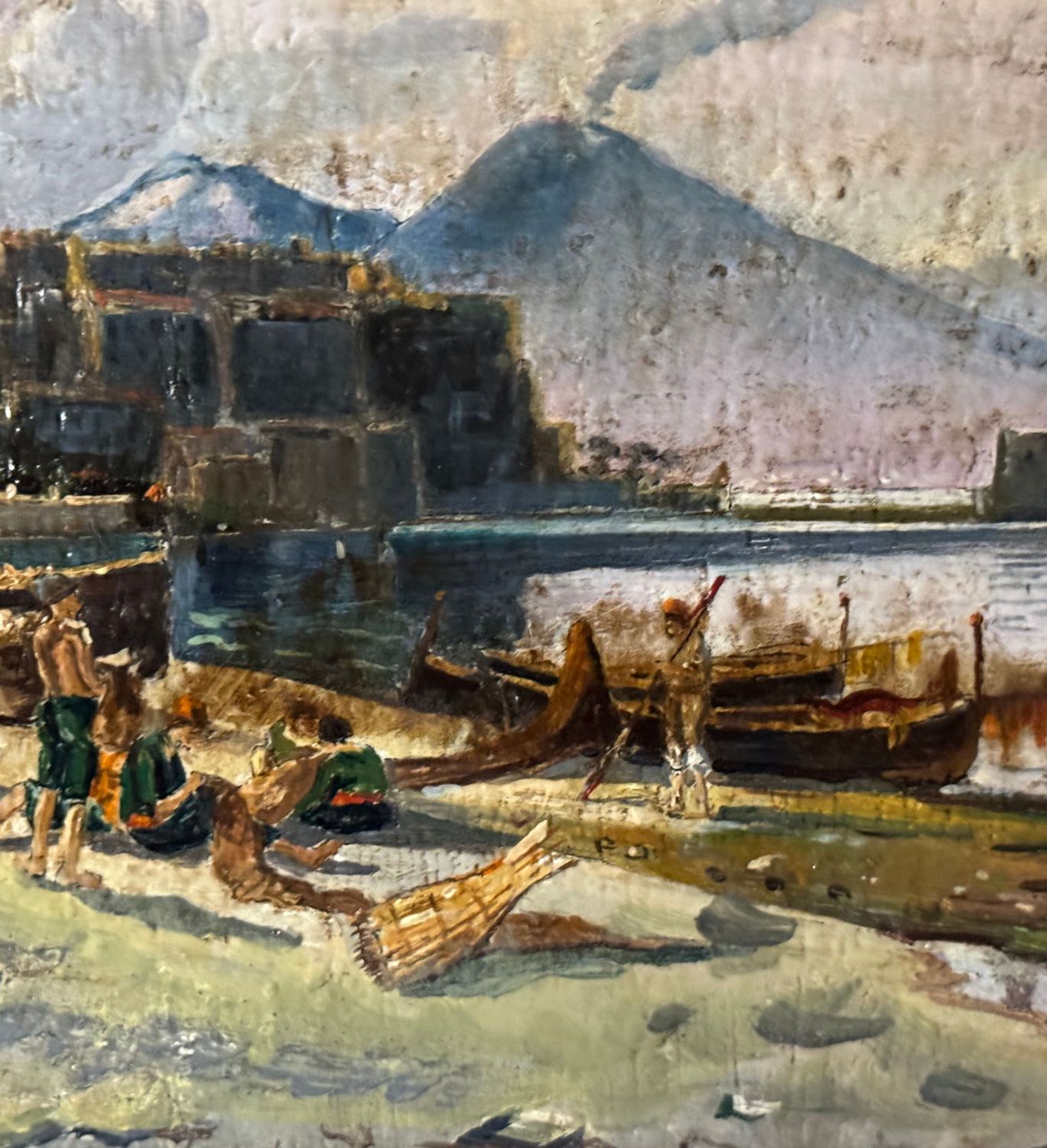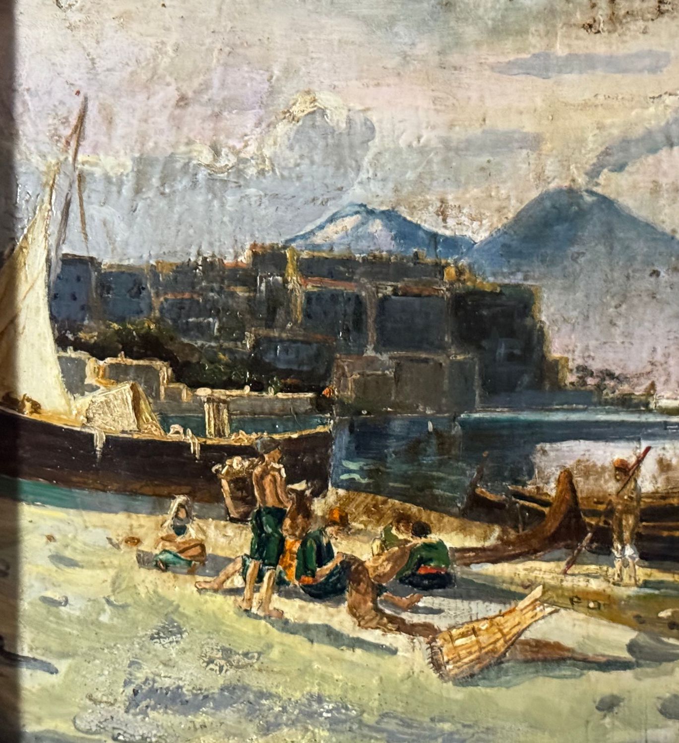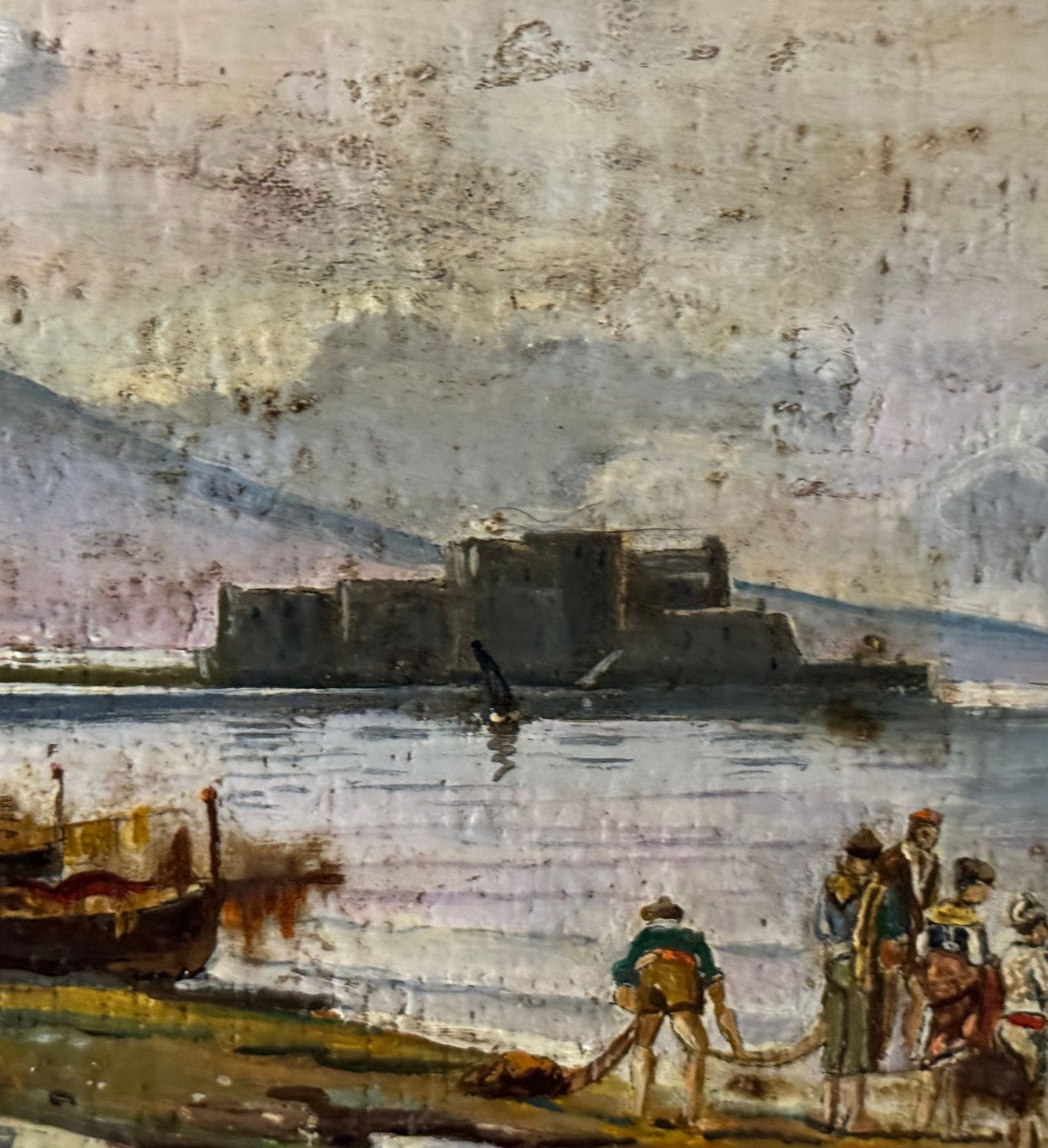 ANONIMO - Dipinto olio su tela, periodo XX secolo, raffigurante Marina napoletana con pescatori. Dimensioni compreso cornice: 57x32 cm. Dimensioni interno cornice: 45x20 cm. Da artista anonimo. Opera in buone condizioni con lievi segni di vissuto come da foto allegate.