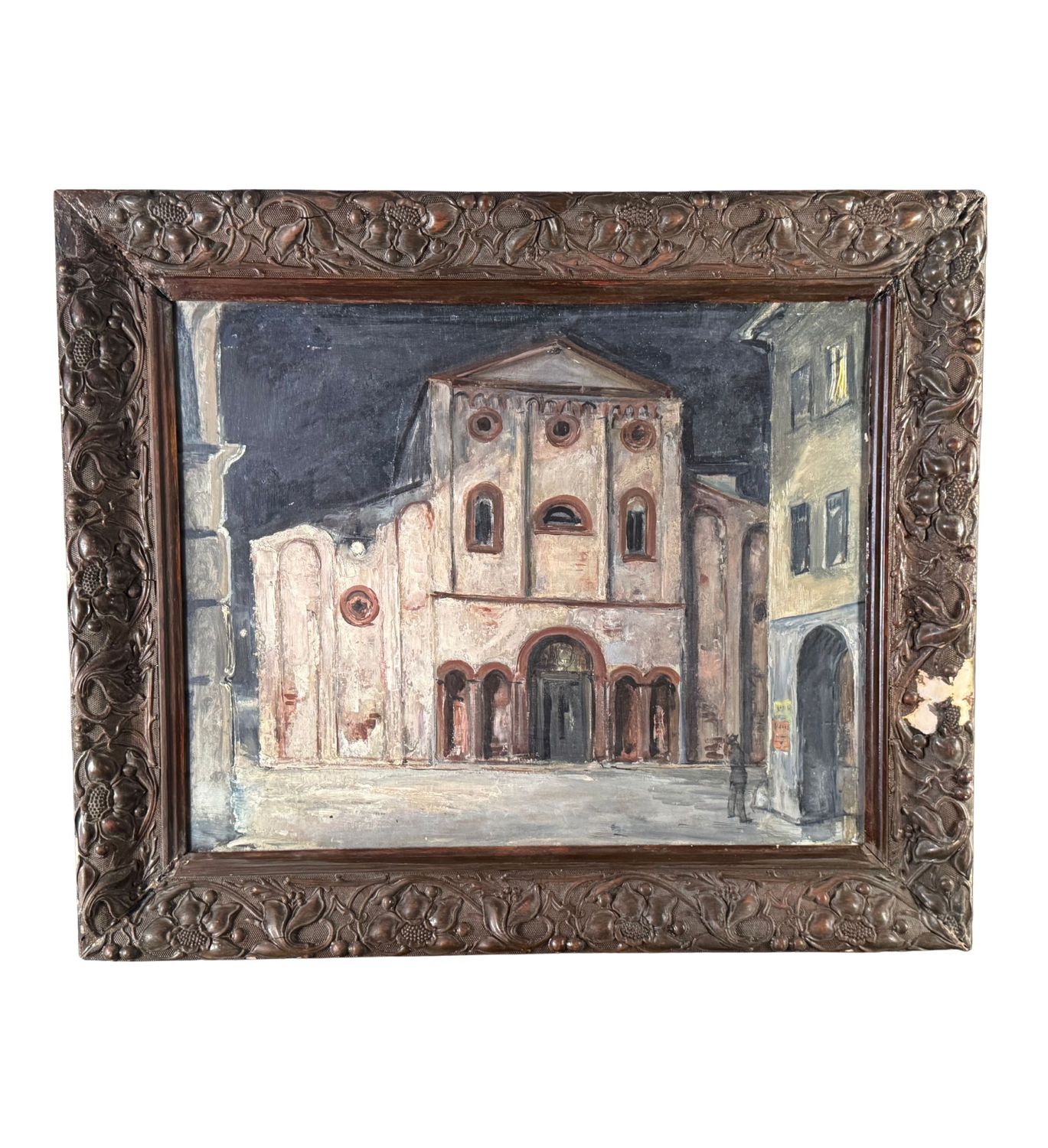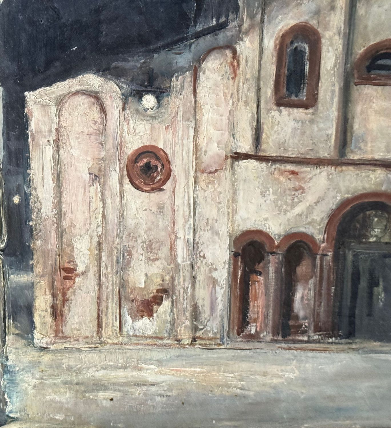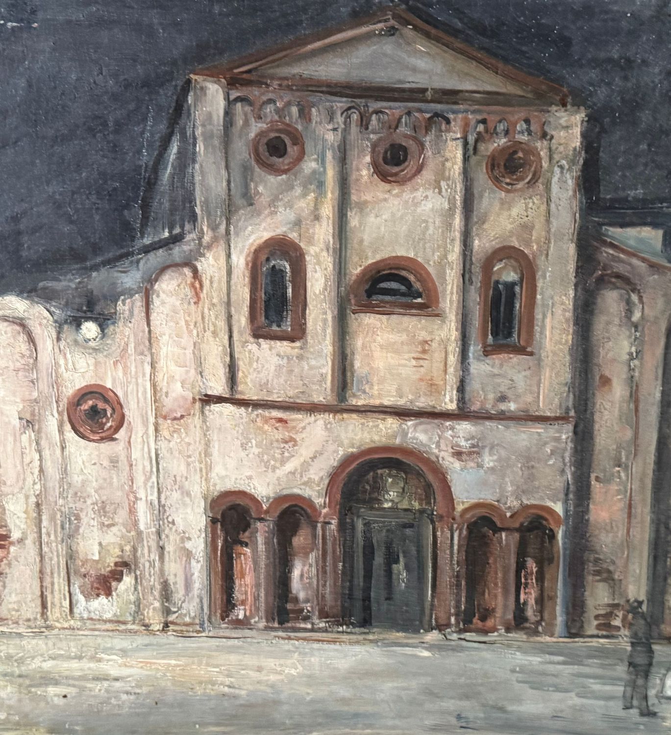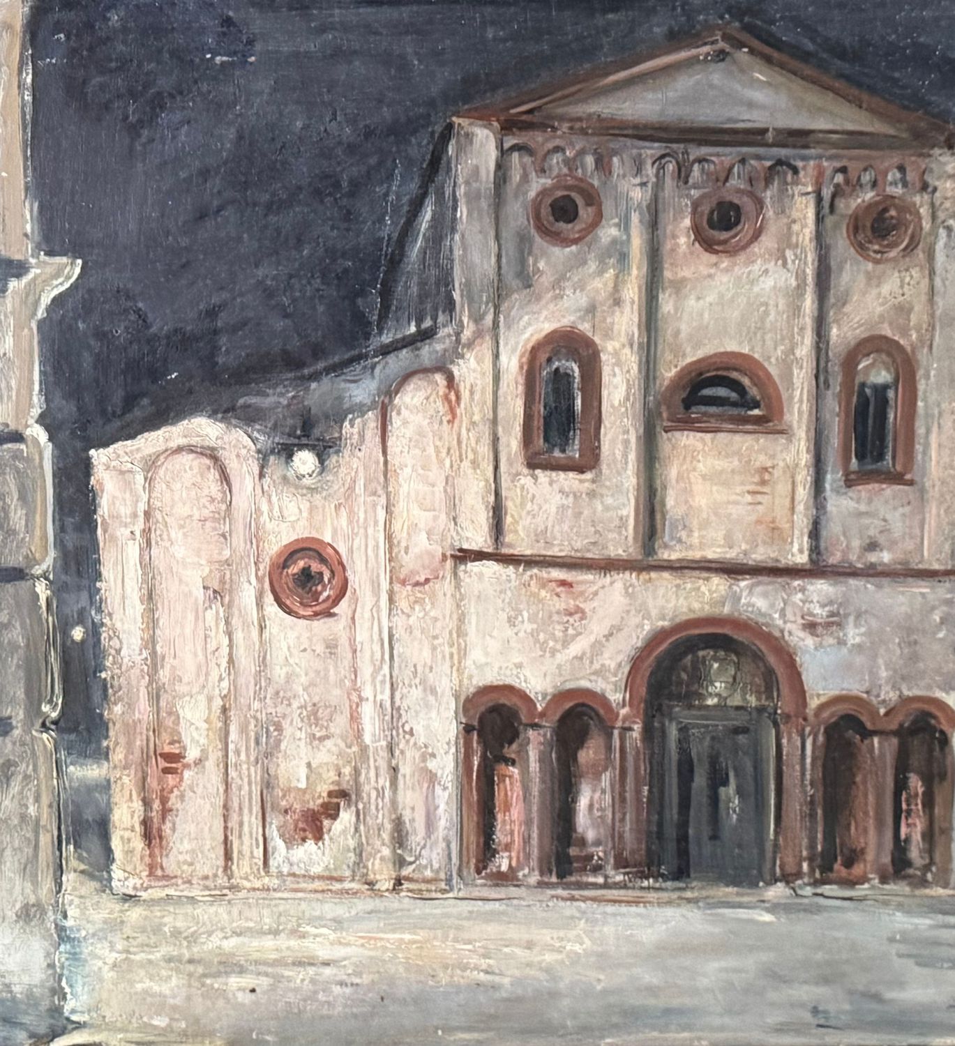 ANONIMO - Dipinto olio su pannello, scuola Italiana, periodo XX secolo, raffigurante Strada notturna con chiesa. Dimensioni compreso cornice: 90x76 cm. Dimensioni interno cornice: 72x56 cm. Da artista anonimo. Opera in buone condizioni con lievi segni di vissuto come da foto allegate.