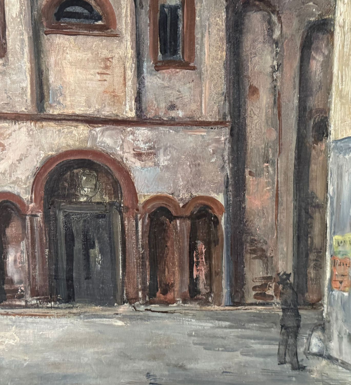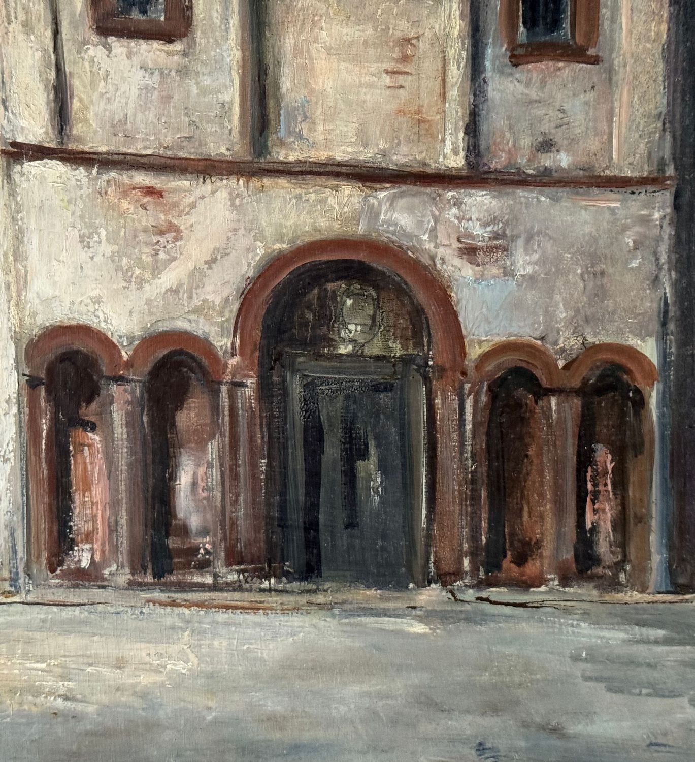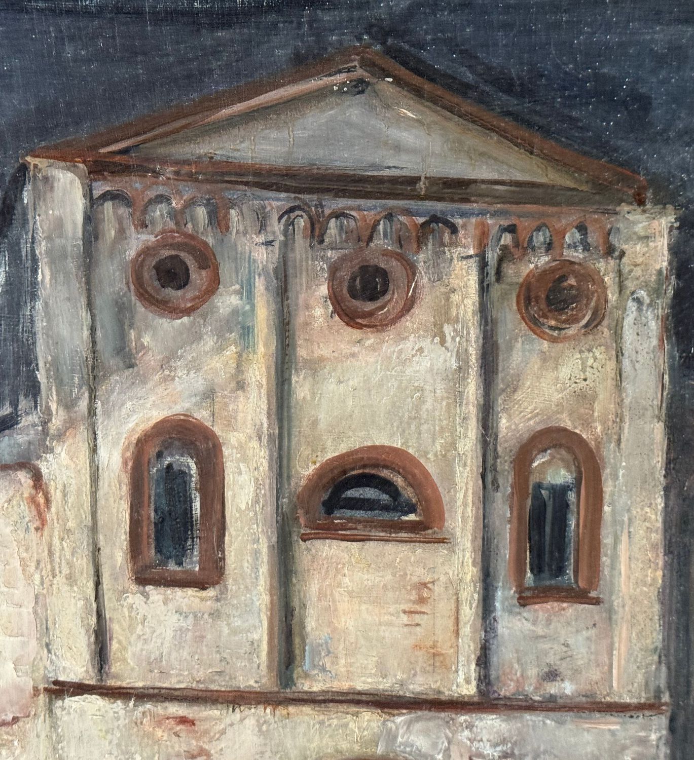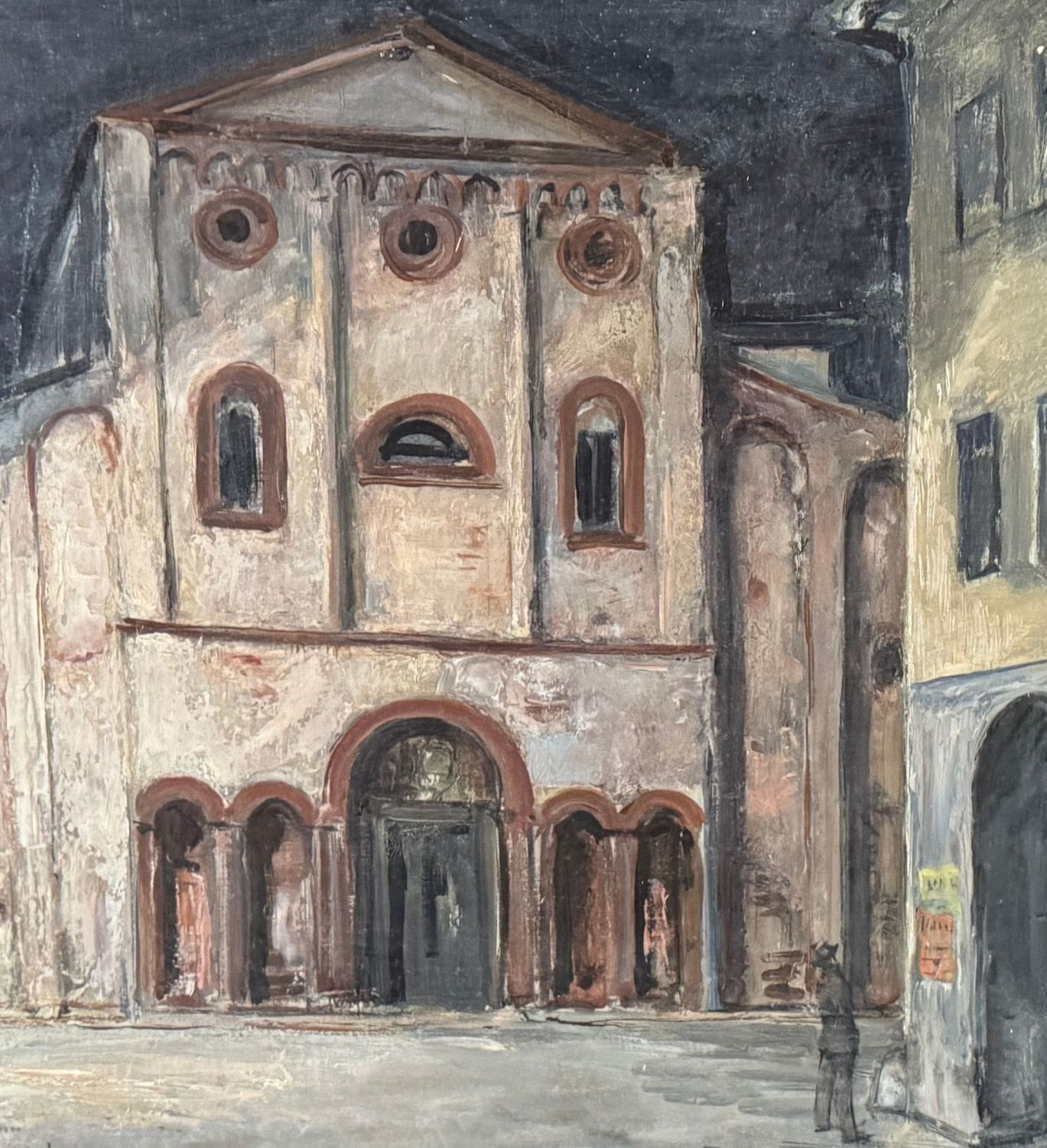 ANONIMO - Dipinto olio su pannello, scuola Italiana, periodo XX secolo, raffigurante Strada notturna con chiesa. Dimensioni compreso cornice: 90x76 cm. Dimensioni interno cornice: 72x56 cm. Da artista anonimo. Opera in buone condizioni con lievi segni di vissuto come da foto allegate.