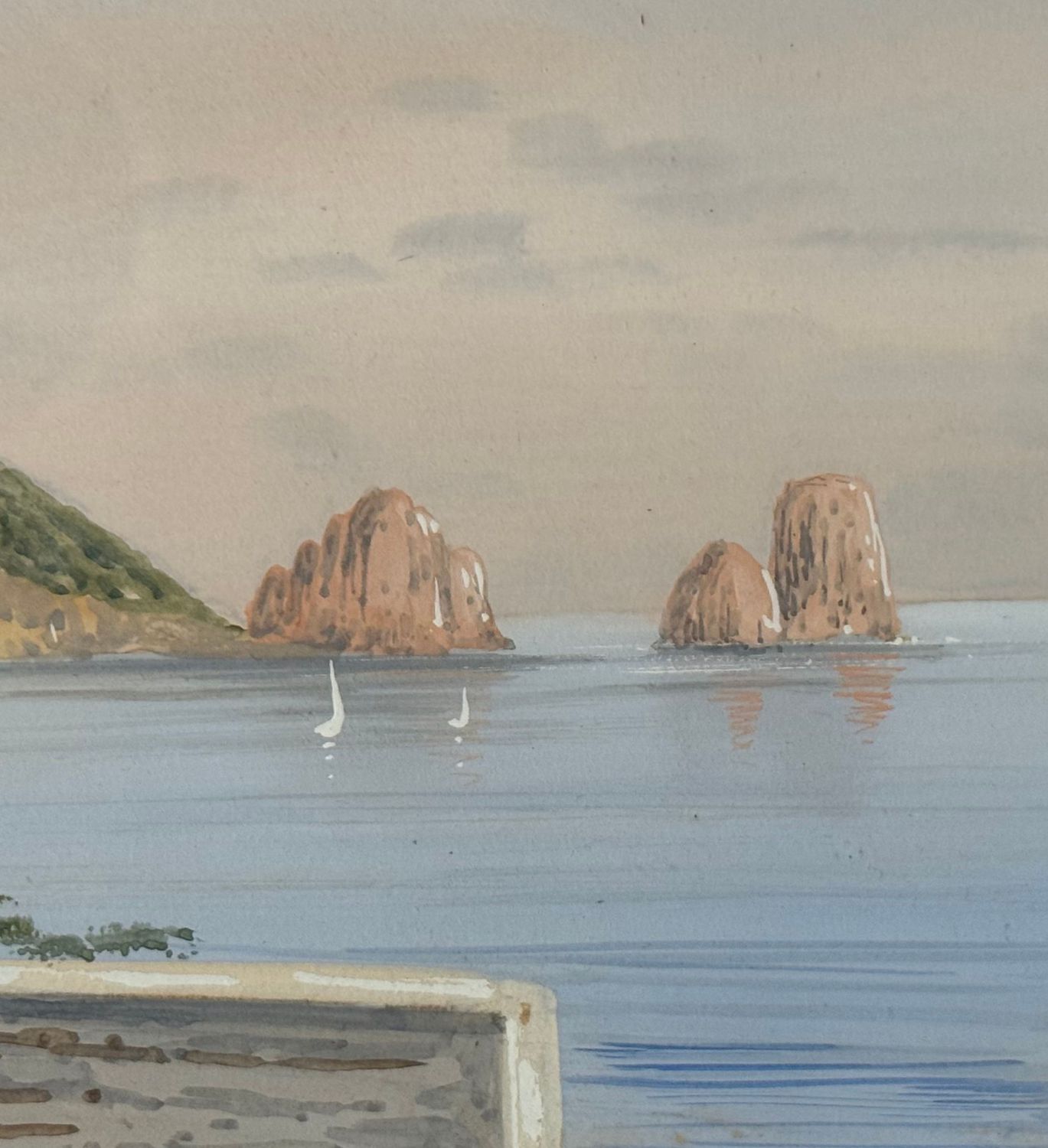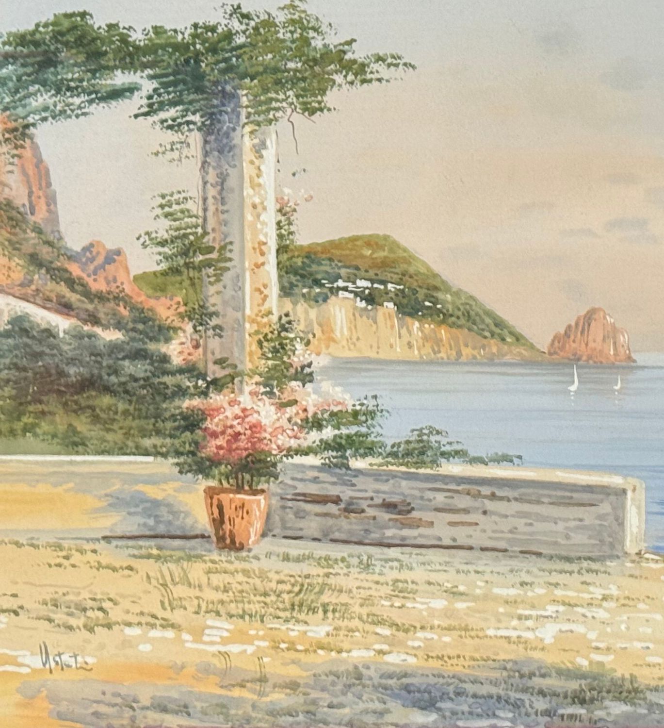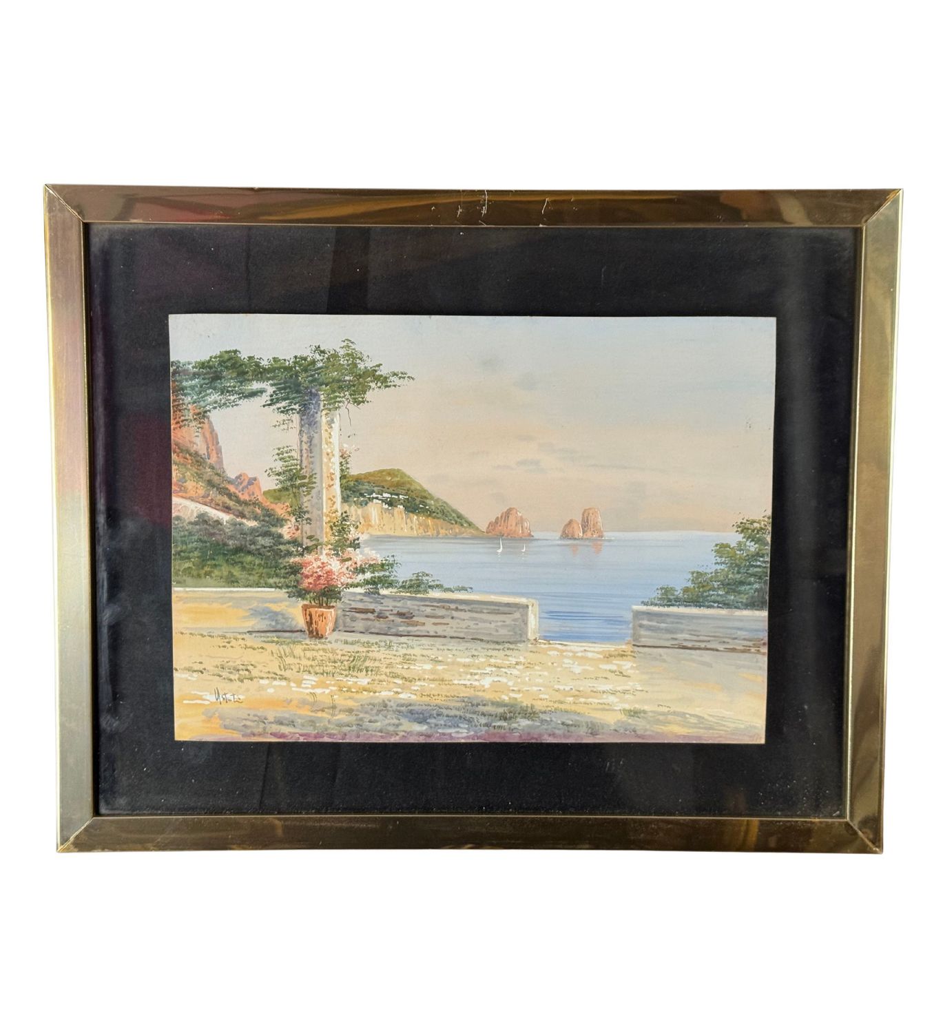 UNIDENTIFIED SIGNATURE - Dipinto acquerello su carta, periodo XX secolo, scuola Italiana, raffigurante Scorcio di Capri. Dimensioni compreso cornice: 47x38 cm. Dimensioni interno cornice: 34x24 cm. Firmato in basso a sinistra artista non identificato. Opera in buone condizioni e eccelente qualità artistica. Finemente incornicato.