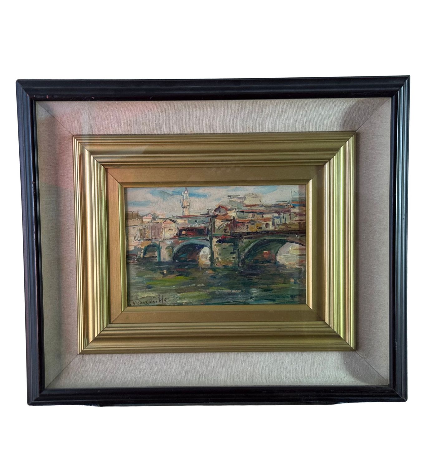 NICOLA CANZANELLA - Dipinto olio su tavola, periodo XX secolo, scuola Italiana, raffigurante Paesaggio marino con ponte. Dimensioni compreso cornice: 49x41 cm. Dimensioni interno cornice: 16x24 cm. Firmato in basso a sinistra Nicola Canzanella. Opera in buone condizioni e di eccellente qualità artistica.
