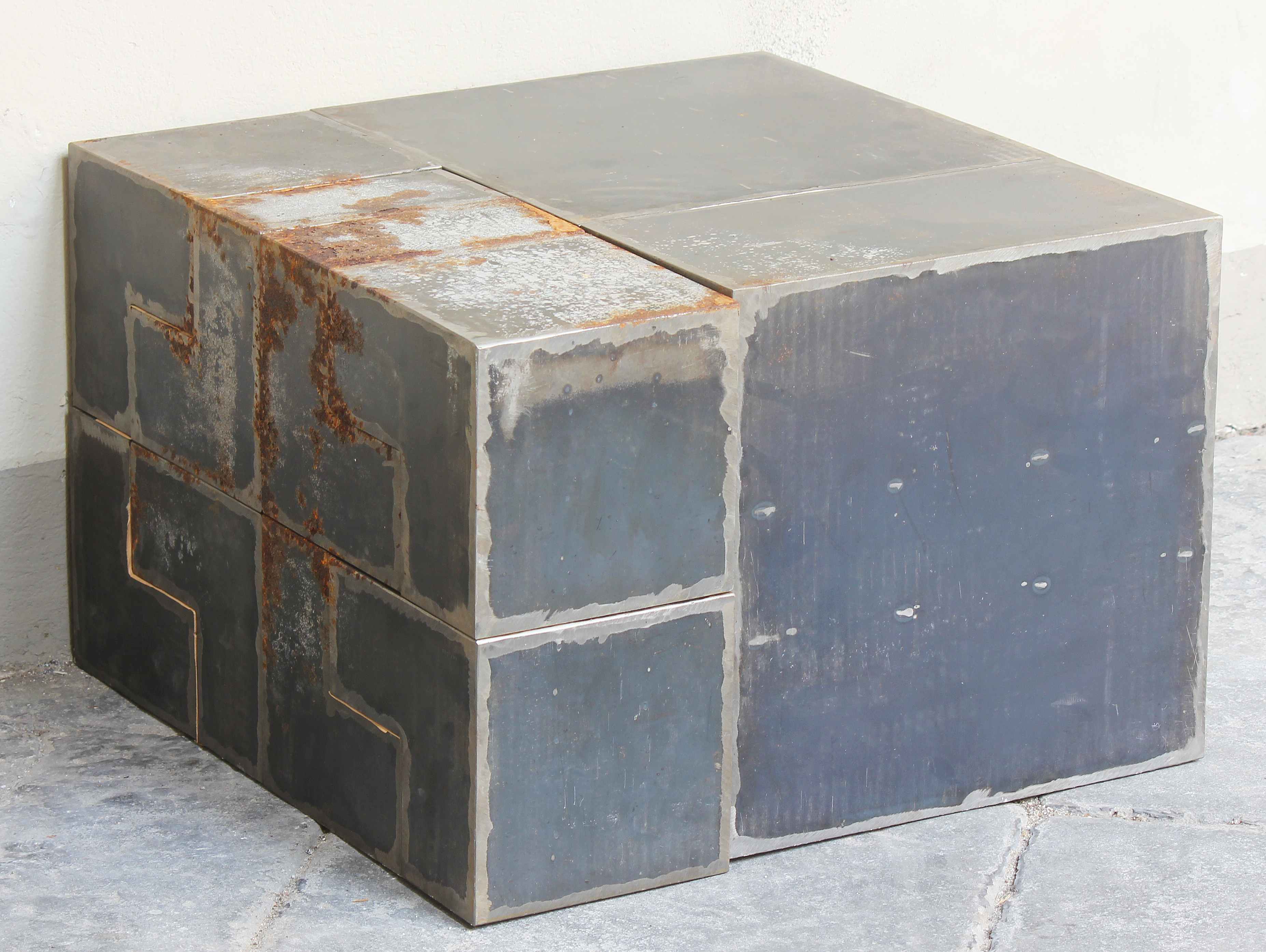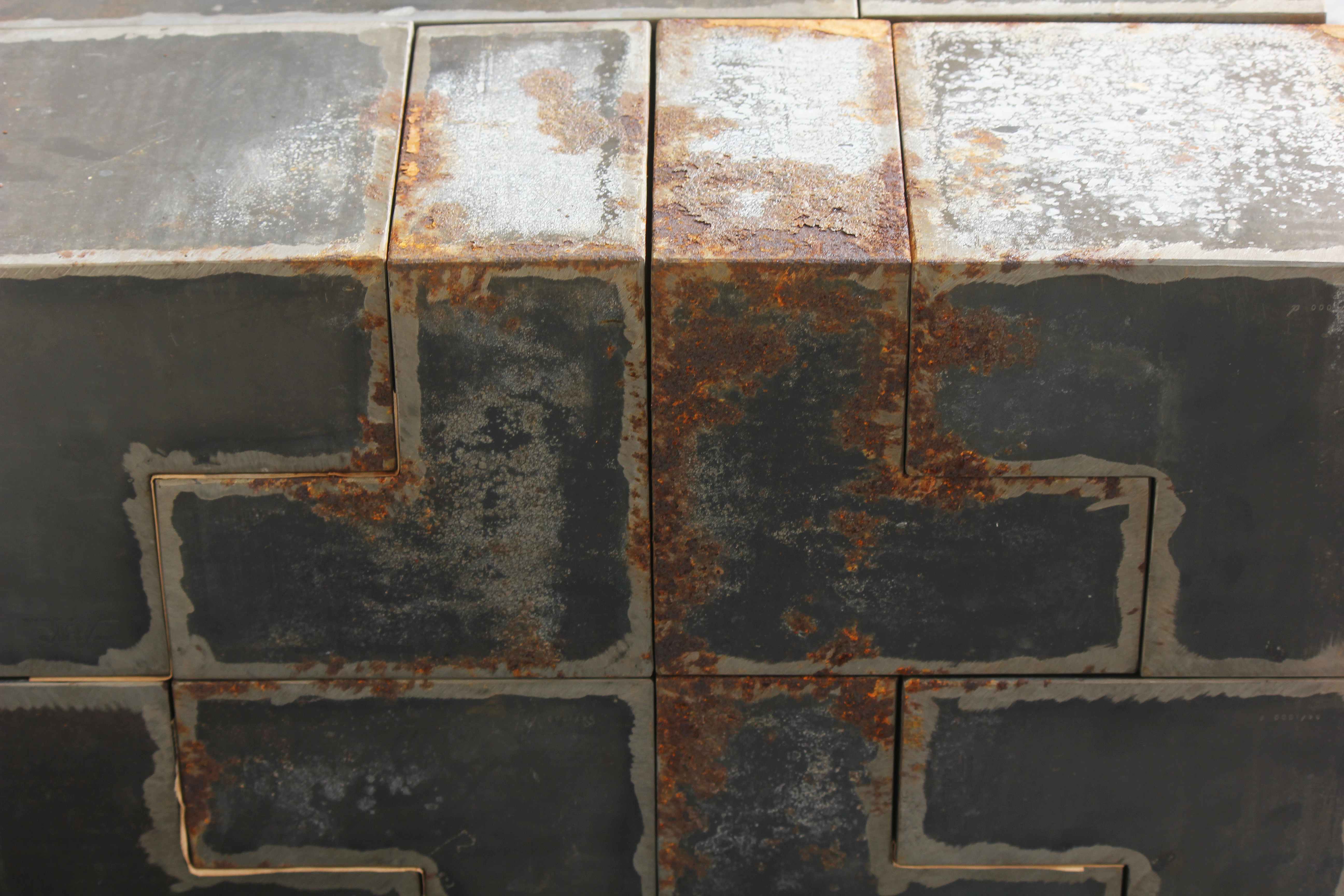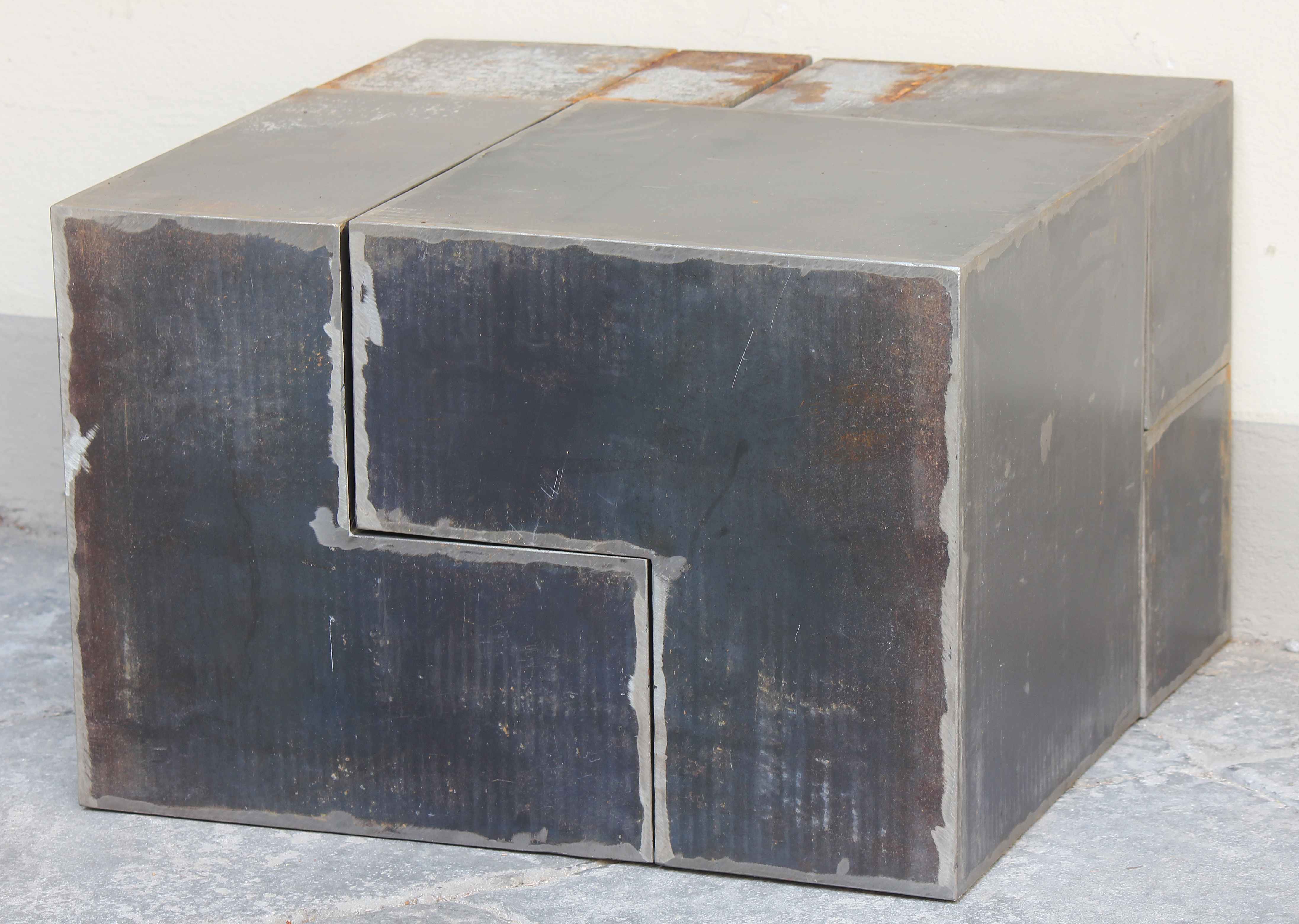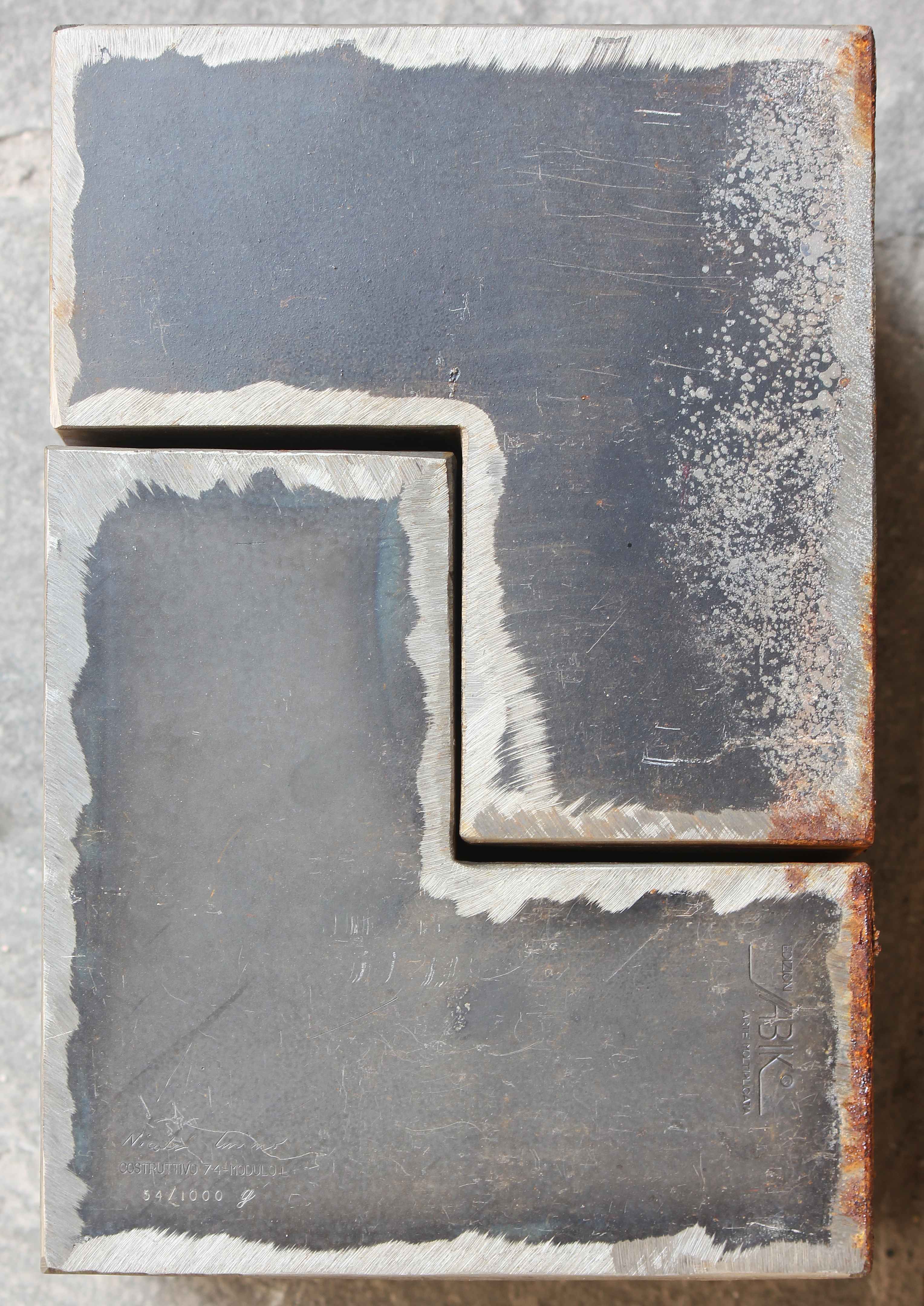 CARRINO NICOLA (n. 1932) Costruttivo 74 - Modulo L. Acciaio. Cm 60,00 x 60,00 x 41,20. 53/1000. Organismo modulare trasformabile. 10 moduli in acciaio. Ognuno dei 10 moduli che compongono il costruttivo reca la firma dell'autore. L'idea della scultura è una concezione risolutiva della disciplina di un dibattito intorno alla scultura come fatto plastico autosufficiente. Il costruttivo è un organismo trasformabile, non solo dà la possibilità di variare le posizioni assunte ma diventa necessità di modificarle - Jole de Sanna. Pubblicazioni: Grafica Multipli, Edizioni di arte moltiplicata 1969-1976, Jabik e Colophon Editori, pag.22. Alcuni moduli presentano segni di ruggine.