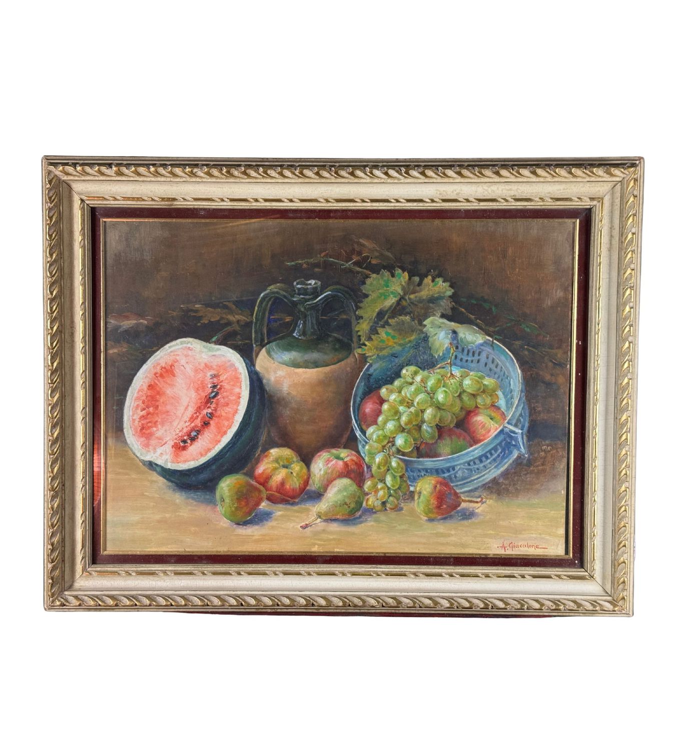 A.Giacalone - Dipinto olio su pannello, periodo XX secolo, scuola Italiana, raffigurante Natura morta. Dimensioni compreso cornice: 72x55 cm. Dimensioni interno cornice: 57x41 cm. Reca firma in basso a destra A. Giacalone. Opera in buone condizioni.