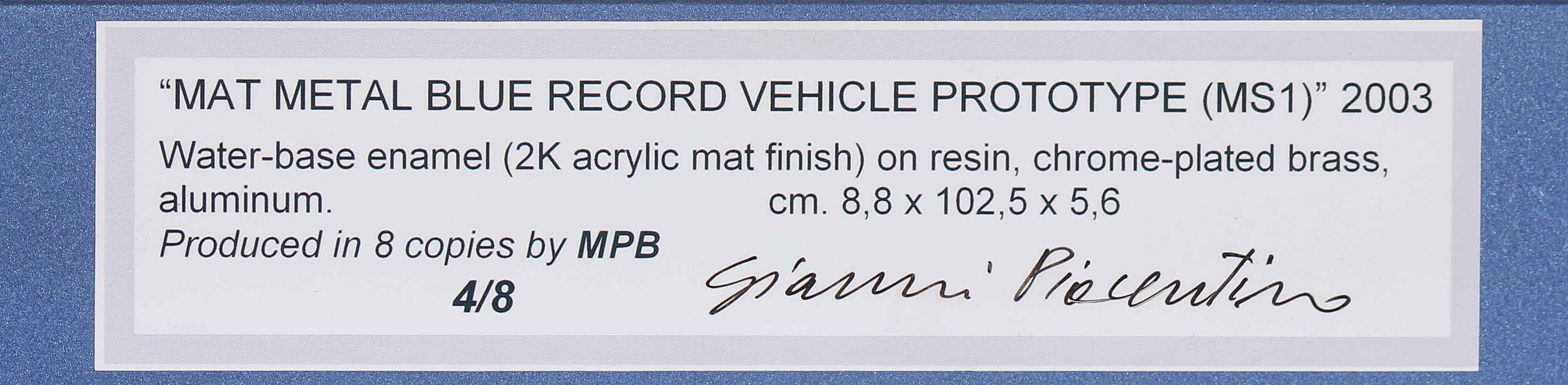 PIACENTINO GIANNI (n. 1945) Mat metal blue record vehicle prototype (MS1). 2003. Resina e metallo. Cm 102,50 x 8,80 x 5,60. 4/8. Tiratura e firma alla base. Autentica dell'artista su fotografia.