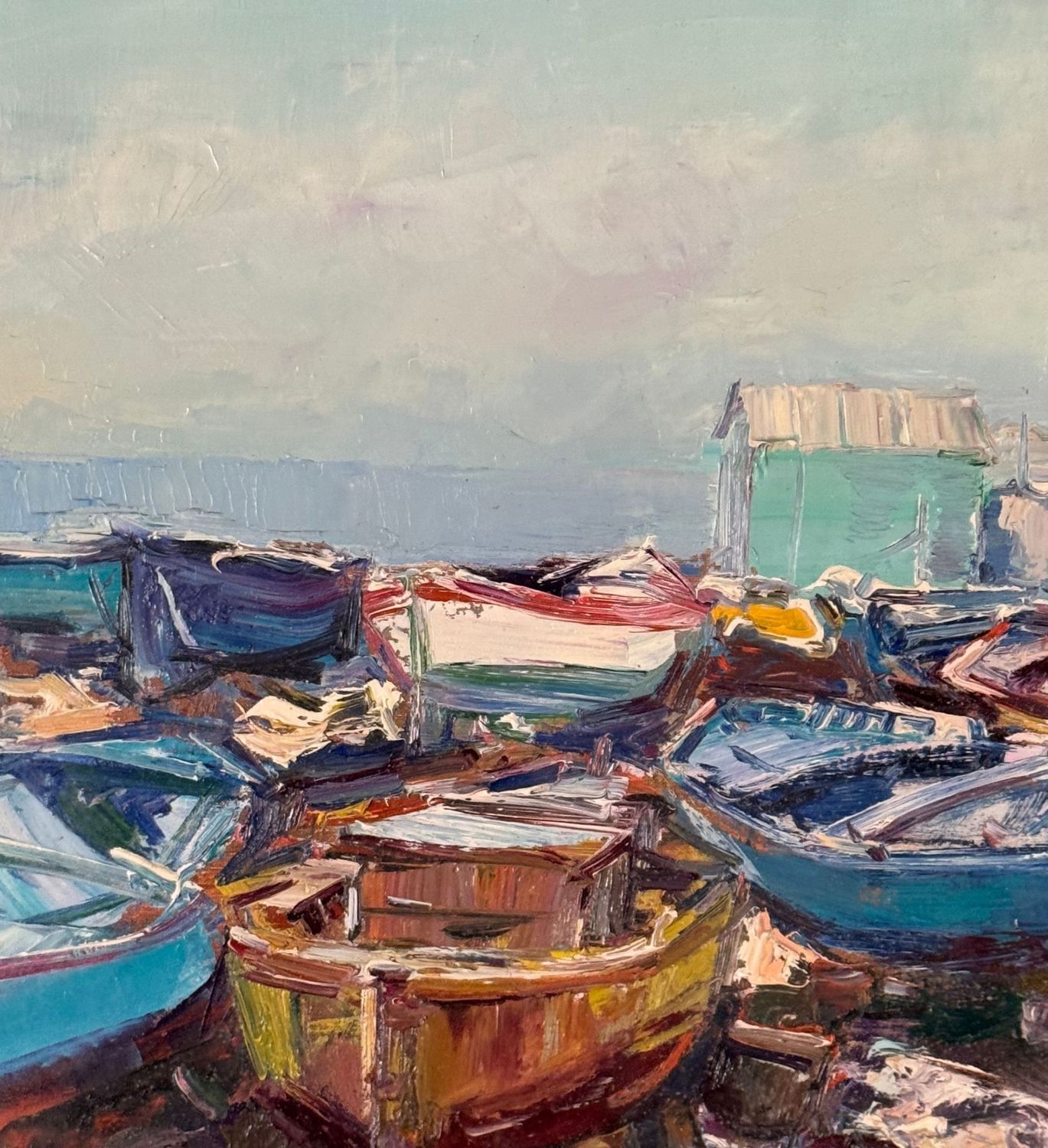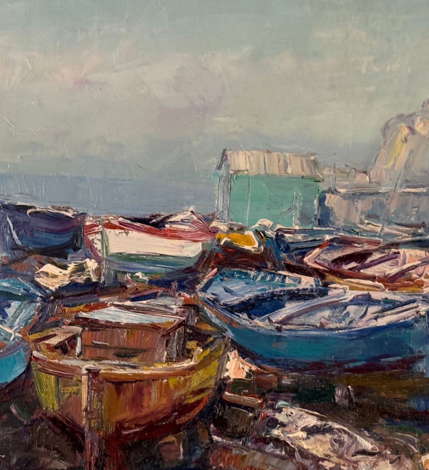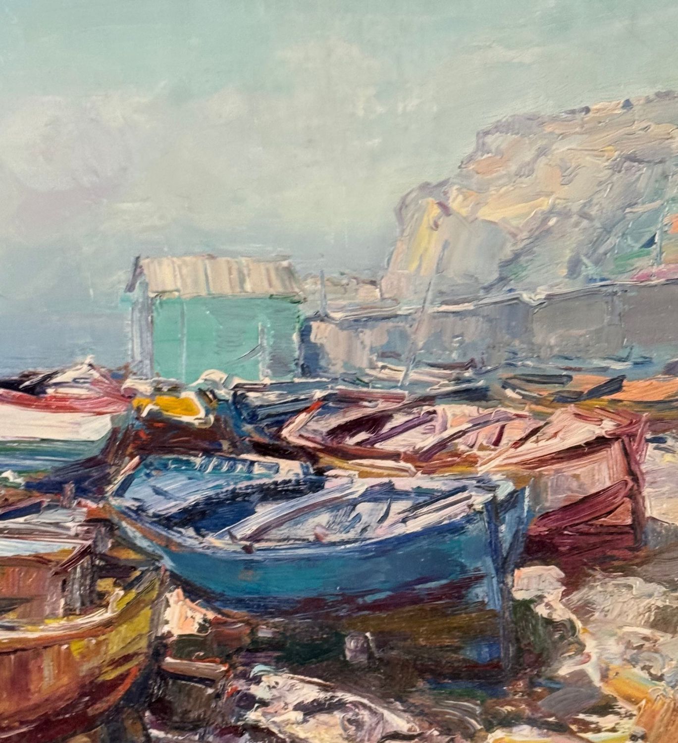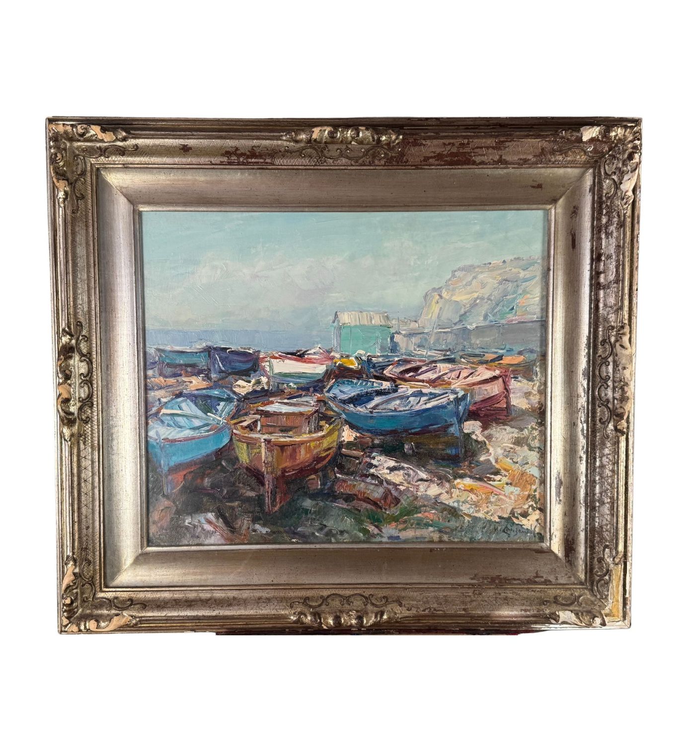 NICOLA CANZANELLA - Dipinto olio su tela, periodo XX secolo, scuola Italiana, raffigurante Scorcio di marina con barche a secco. Dimensioni compreso cornice: 85x75 cm. Dimensioni interno cornice: 60x50 cm. Firmato in basso a destra Nicola Canzanella. Opera in buone condizioni. Cornice da restaurare.