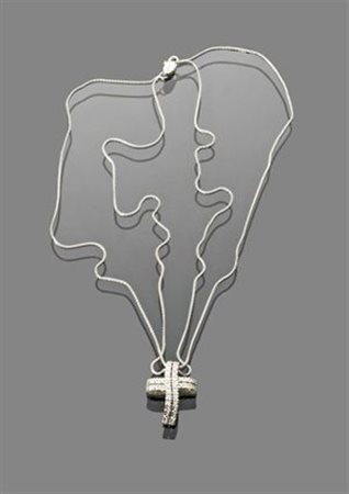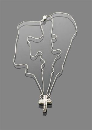 COLLANA Collana in oro bianco con pendente a forma di croce tempestata di diamanti taglio brillante per complessivi ct 0,70 ca Peso gr 11,50 Firmato DAMIANI Double stand white gold necklace with cross shaped pendant studded with brillant cut diamonds totaling approx 0,70 kt Weight 11.50 gr signed DAMIANI