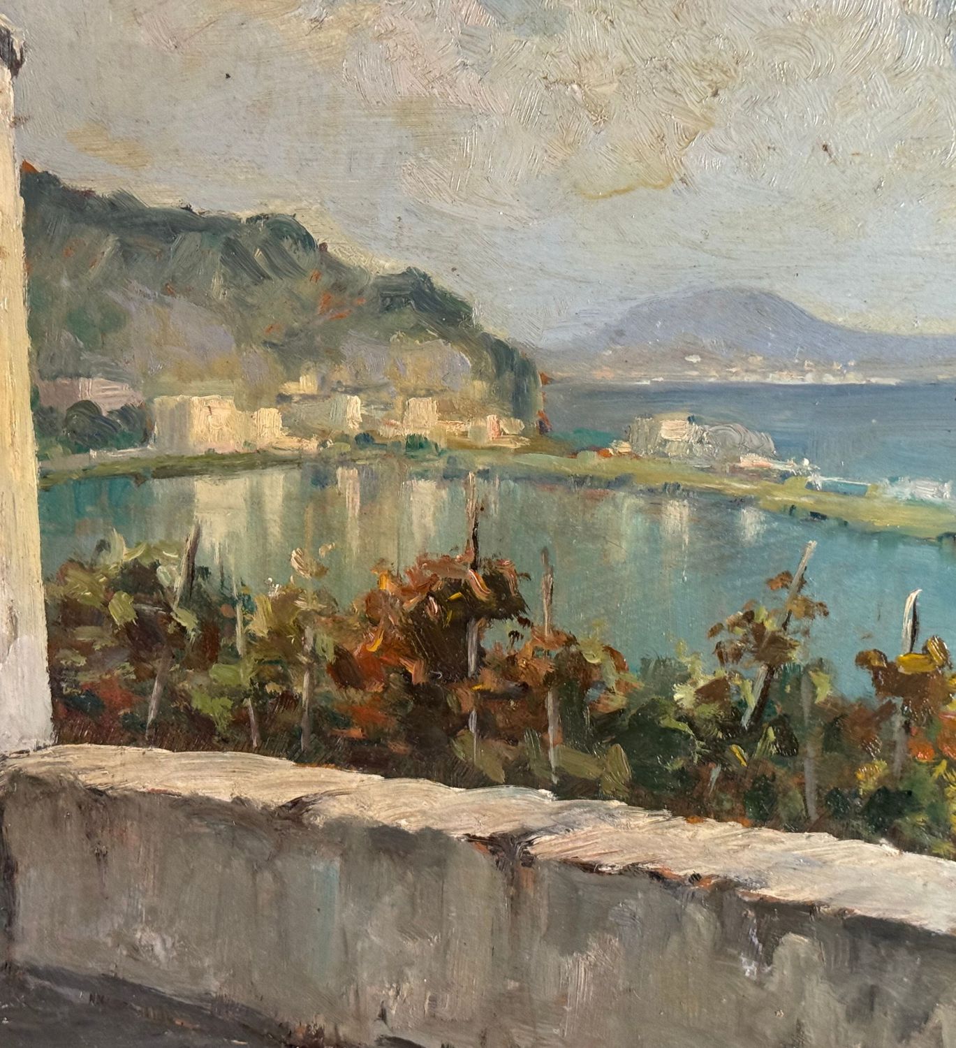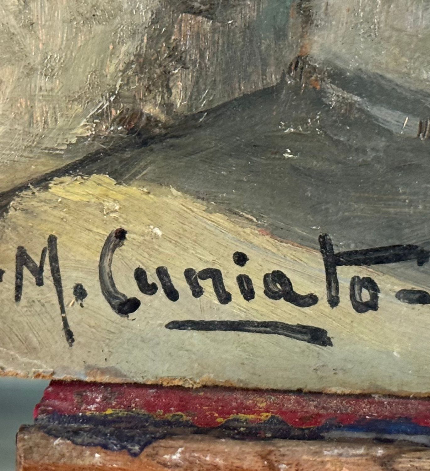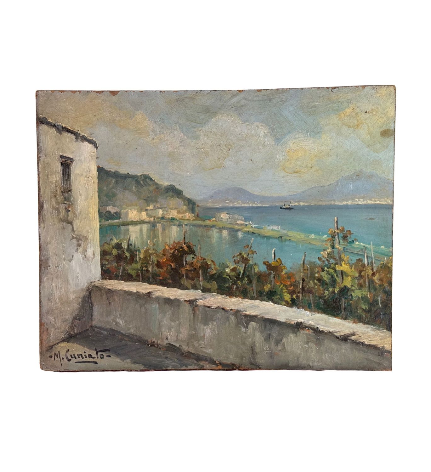 M. Cuniato - Dipinto olio su pannello, periodo XX secolo, scuola Italiana, raffigurante Veduta del golfo da una terrazza. Dimensioni: 49x39 cm. Firmato in basso a sinistra M. Cuniato. Opera in buone condizioni con lievi segni di vissuto come da foto allegate.