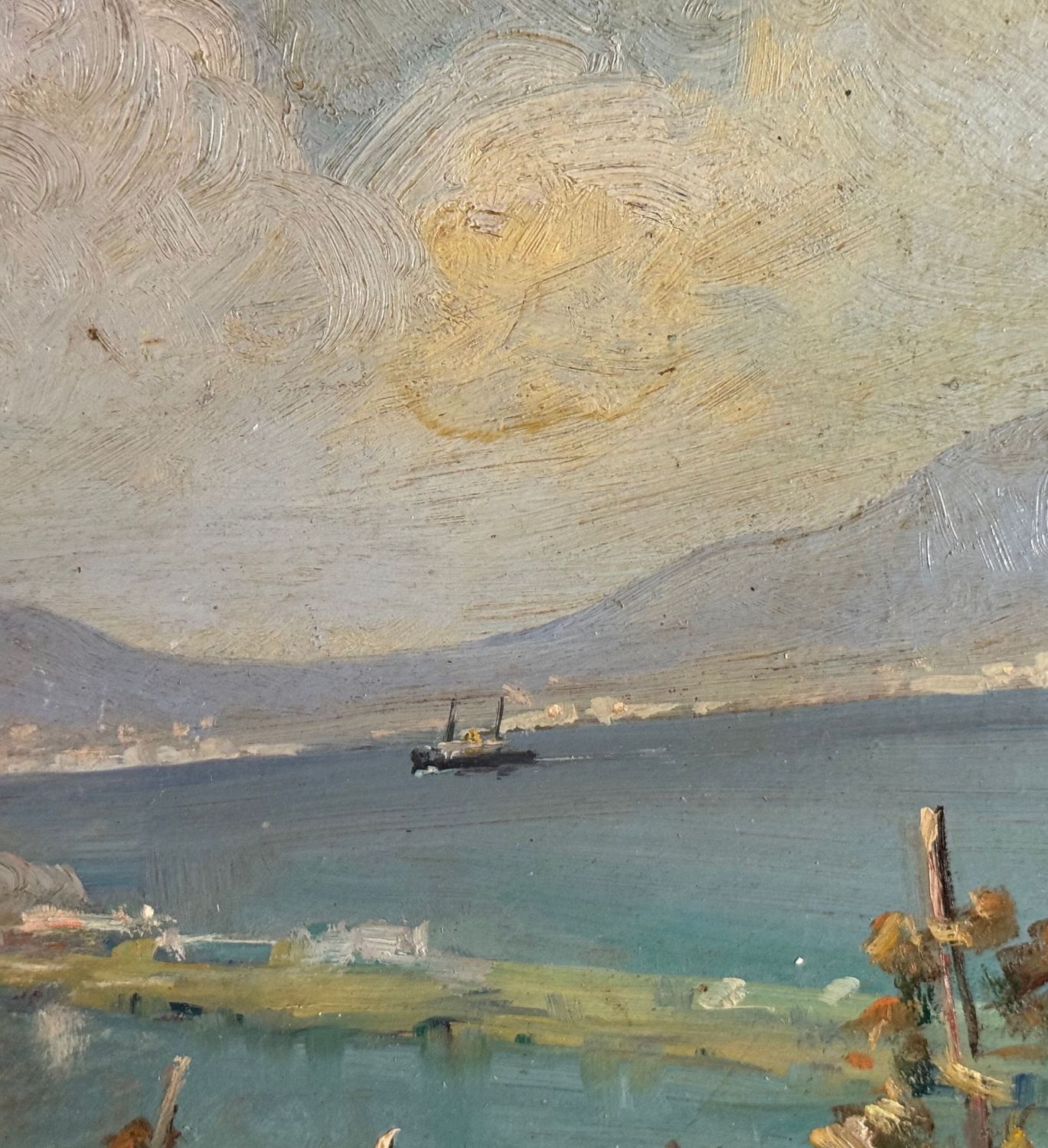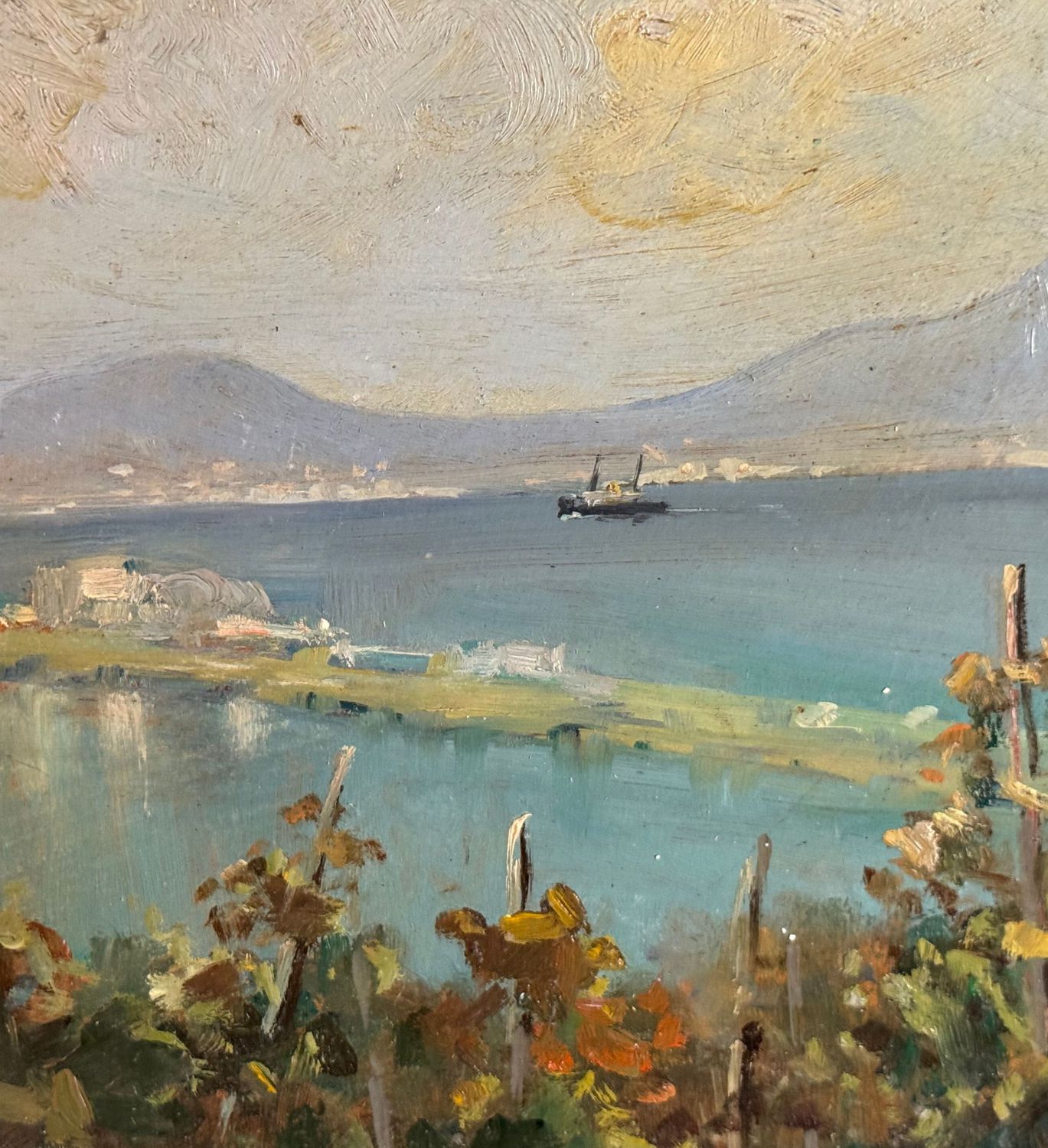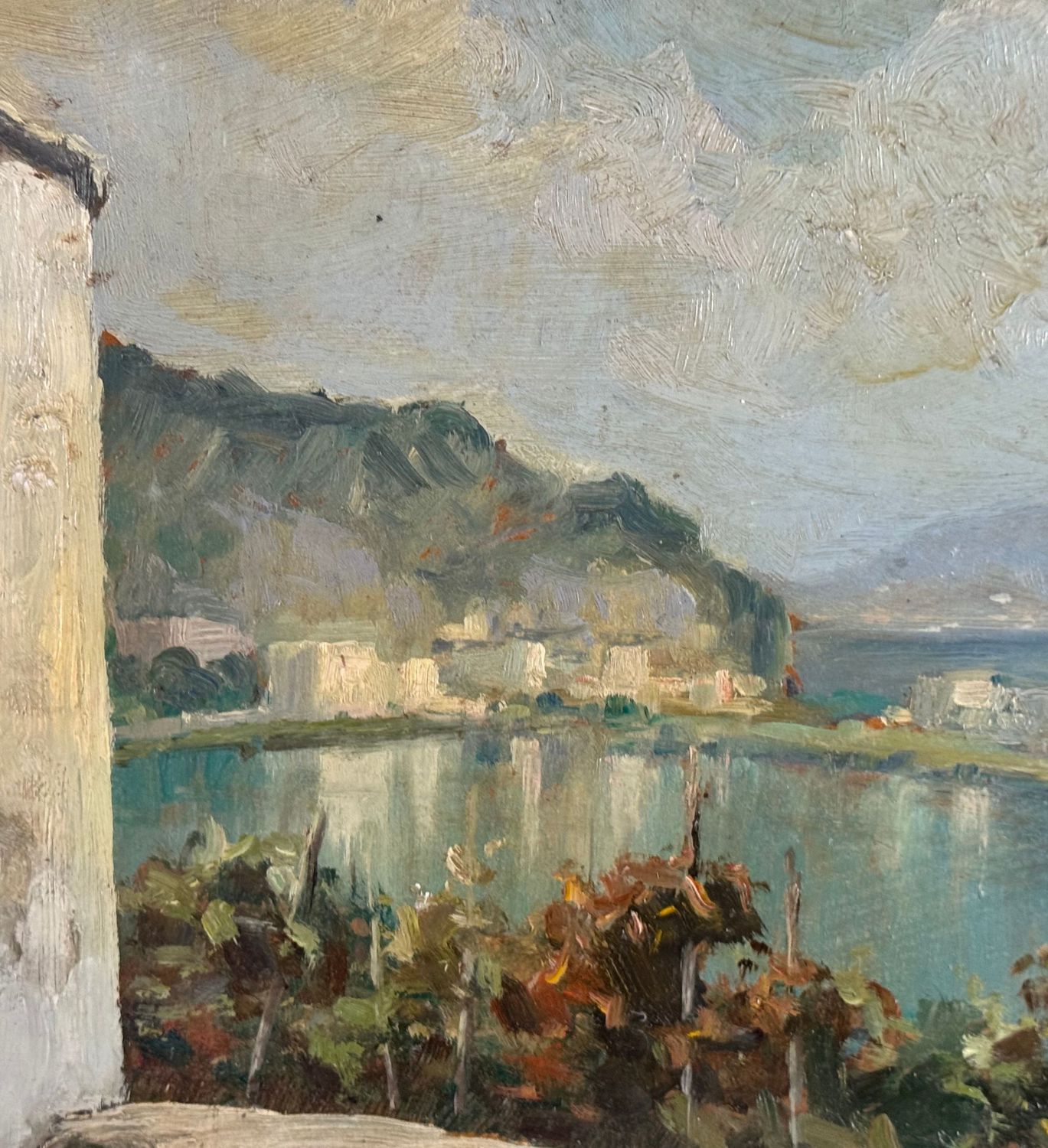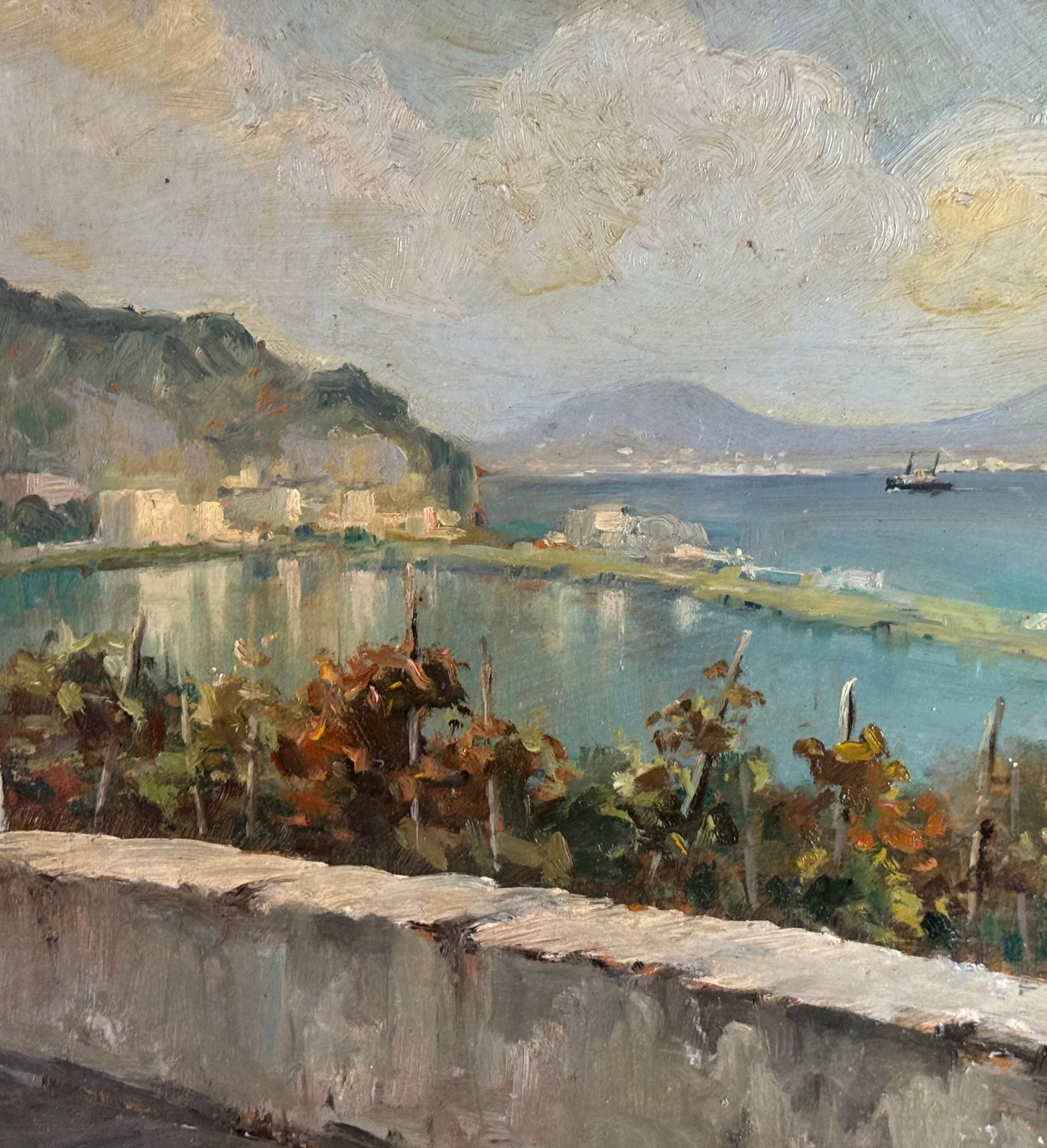 M. Cuniato - Dipinto olio su pannello, periodo XX secolo, scuola Italiana, raffigurante Veduta del golfo da una terrazza. Dimensioni: 49x39 cm. Firmato in basso a sinistra M. Cuniato. Opera in buone condizioni con lievi segni di vissuto come da foto allegate.
