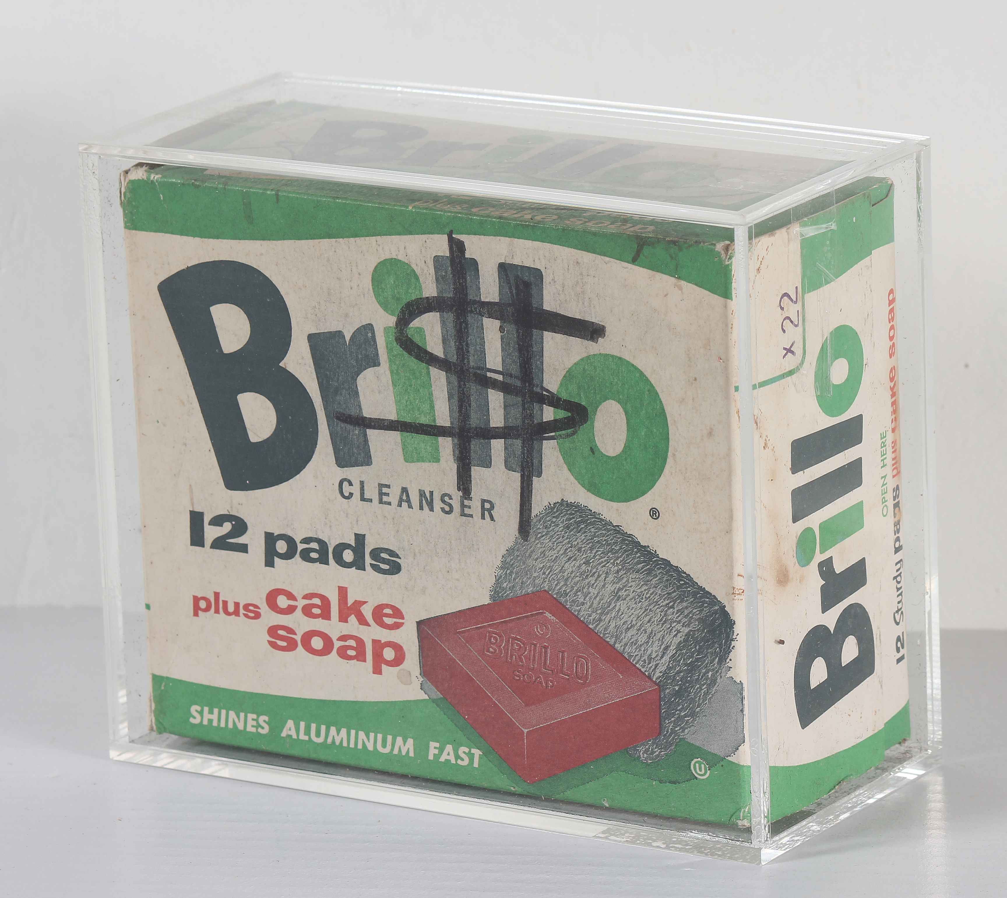 WARHOL ANDY (1928 - 1987) Brillo Box. Pennarello su cartone. Cm 16,50 x 15,00 x 7,00. Firma a pennarello nella parte lunga in alto e simbolo del dollaro a pennarello nella parte lunga frontale. Entro teca di plexiglass.